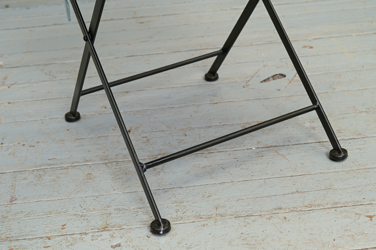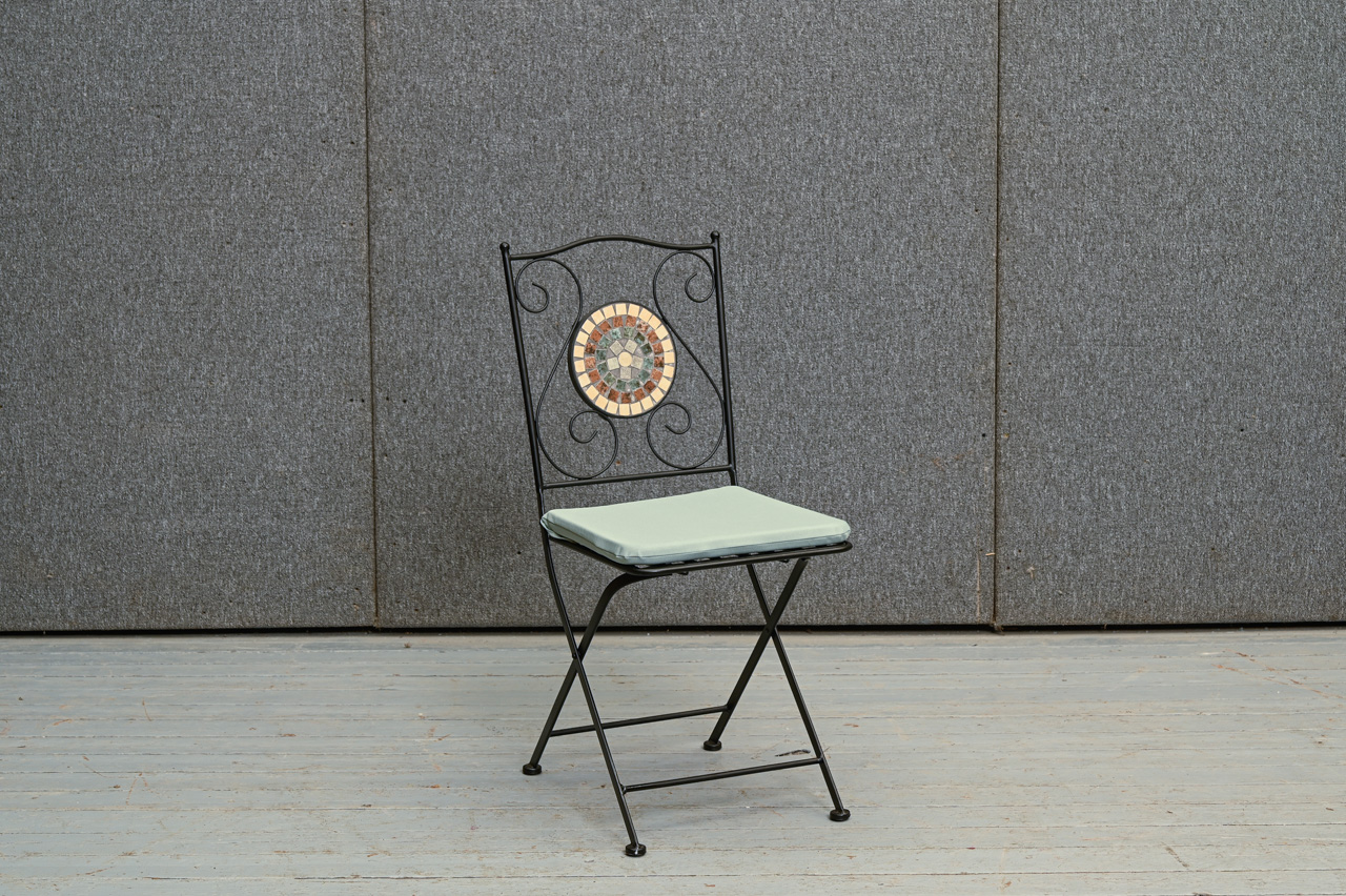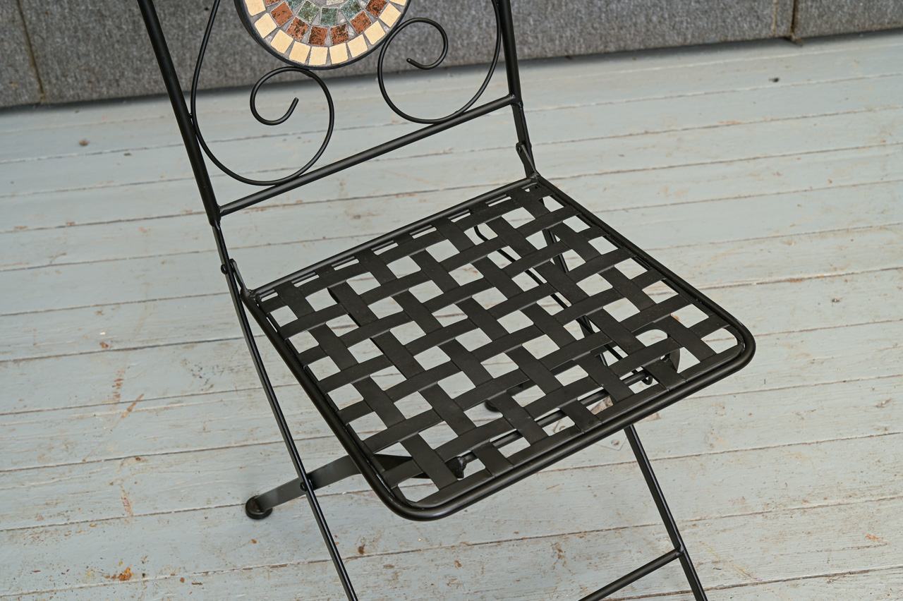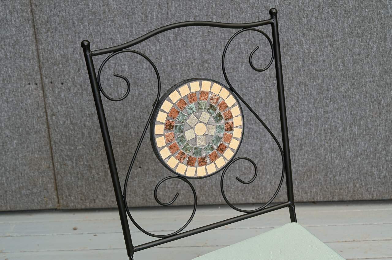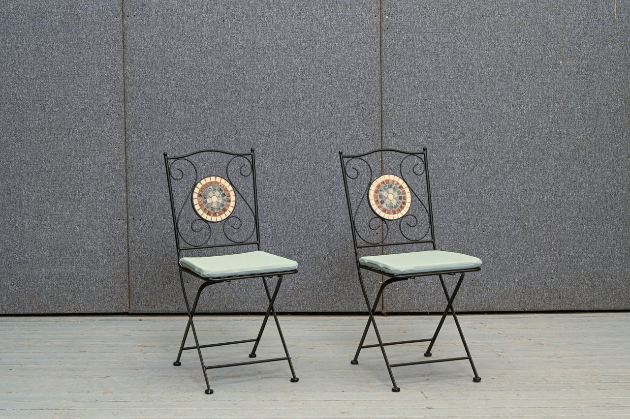 2 saliekamu, melnu metāla krēslu komplekts ar dekoratīvu, ar keramikas flīzēm flīzētu atzveltnes pildiņu. Sēdvirsmai uzliekams, zaļas krāsas spilvens. Nelietoti, salikti. Komplekta kods 108354k.