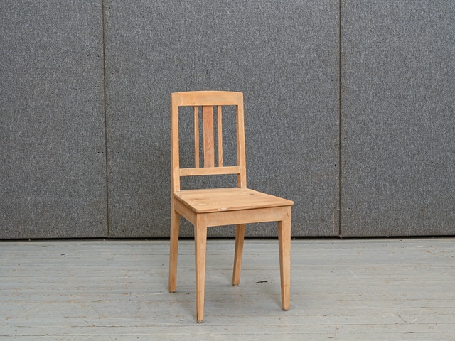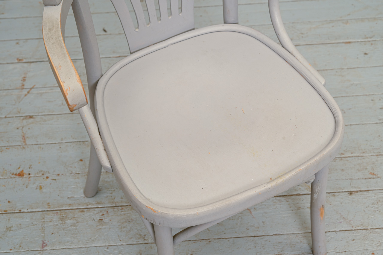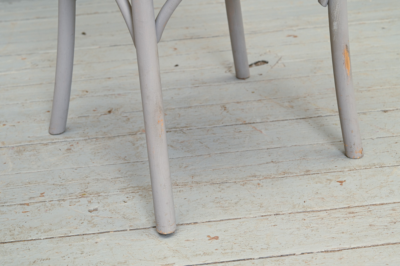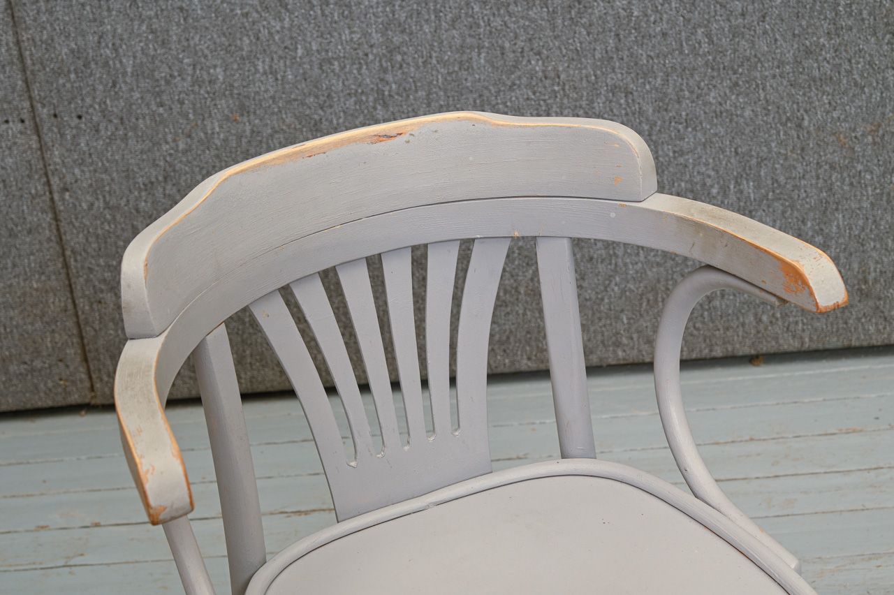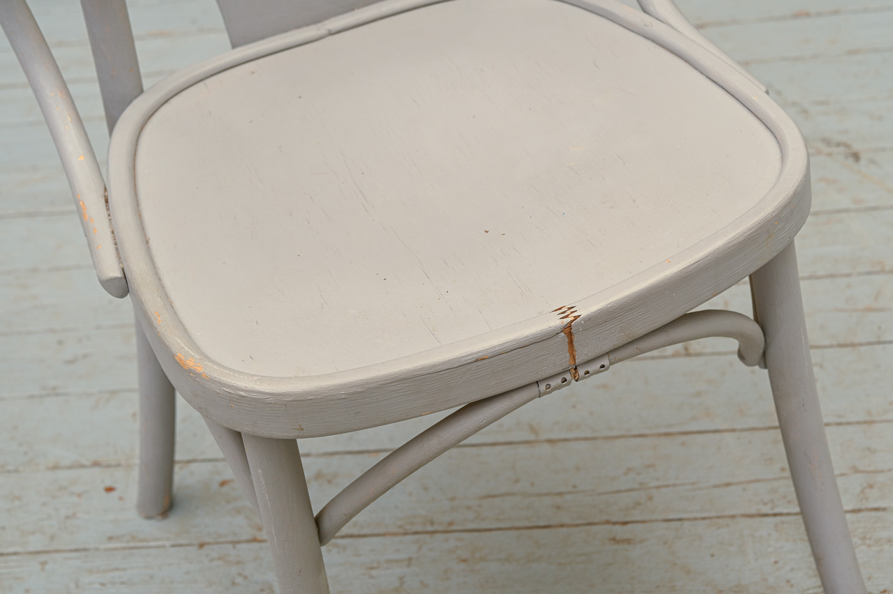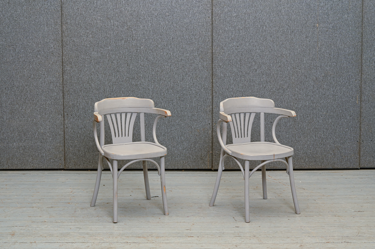 2 atjaunojamu, pelēki krāsotu ozolkoka krēslu komplekts ar saplākšņa sēdvirsmu. Vienam krēslam rāmja bojājums, skatīt attēlā. Komplekta kods 160163k.