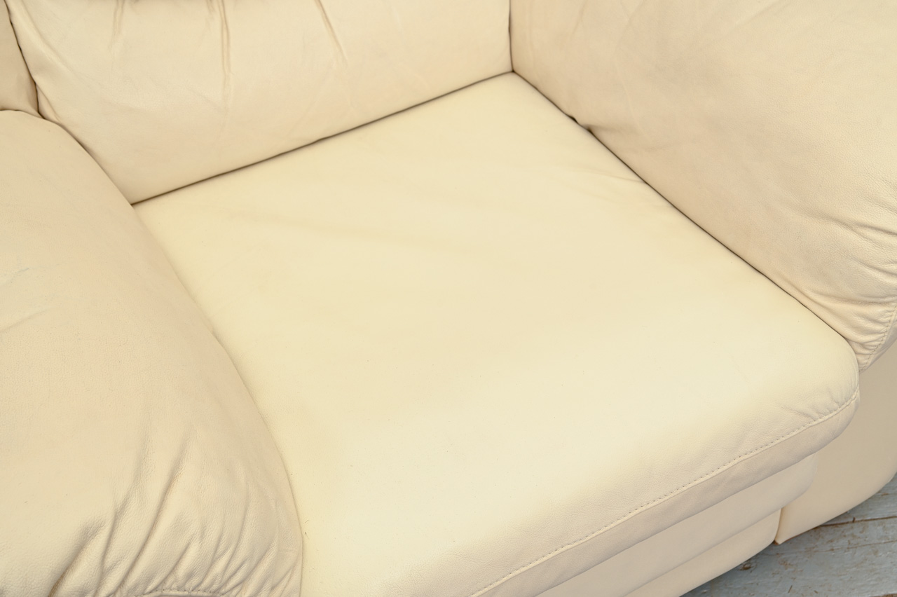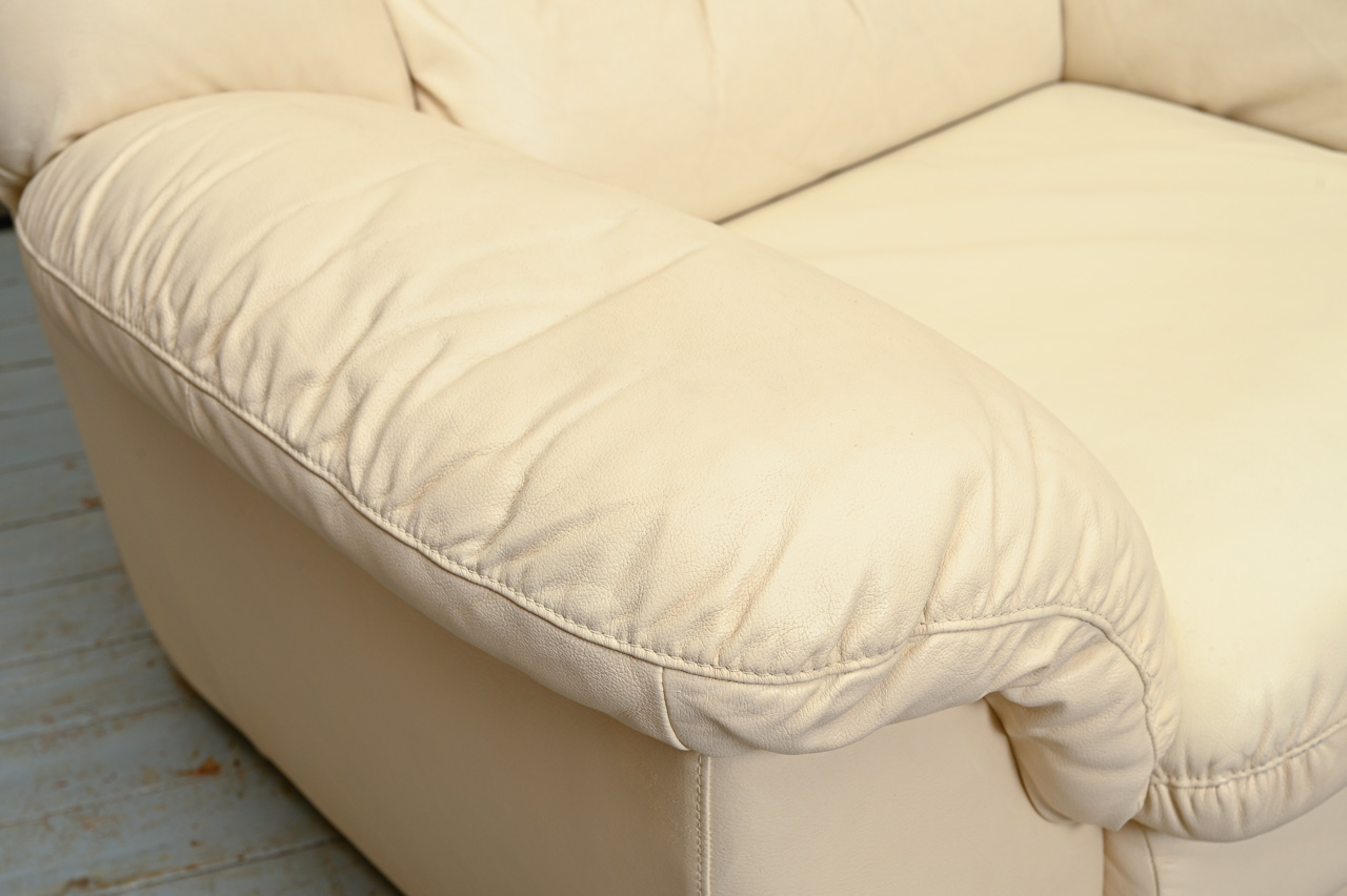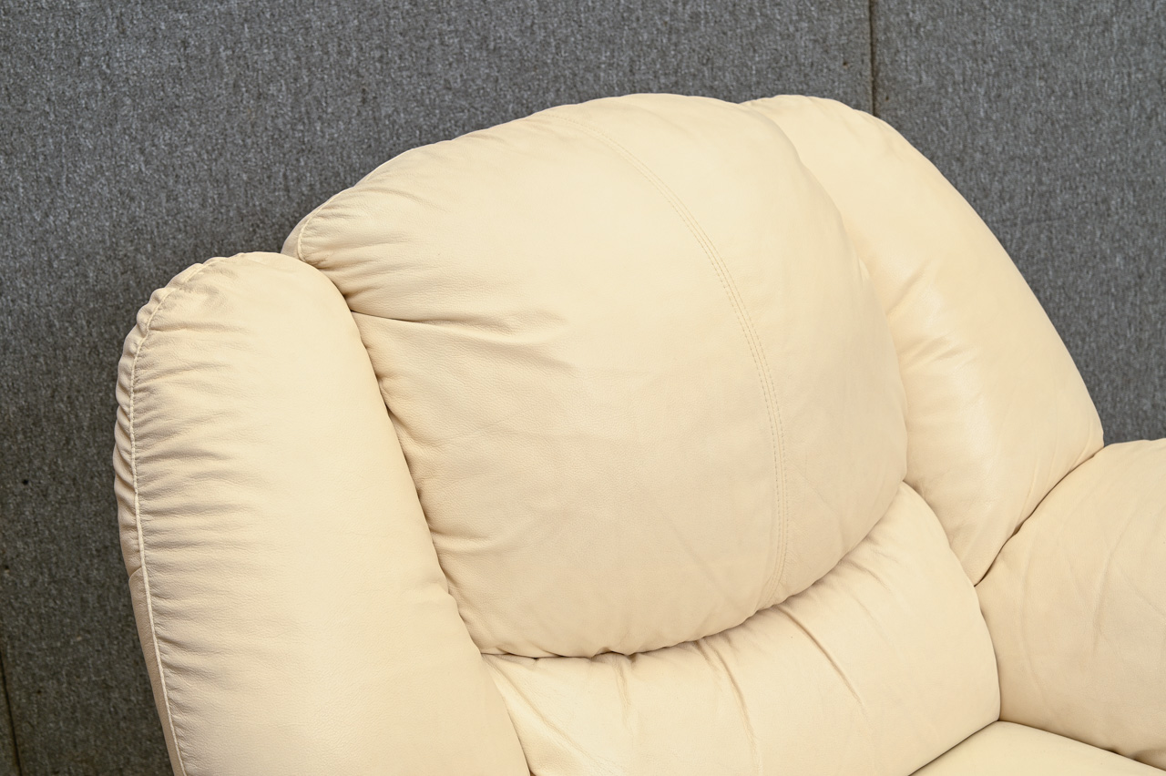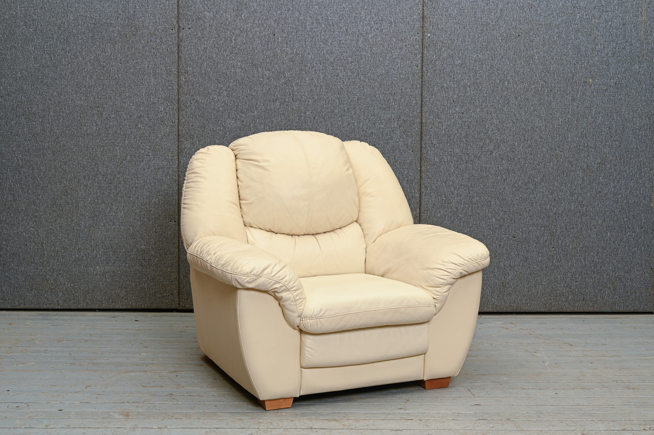 2 mīksto krēslu komplekts. Mīkstie krēsli, tapsēti ar bēšu dabīgo ādu. Fasāde zem sēdvirsmas, sāni un aizmugure ar ādas imitācijas tapsējumu. Komplekta kods 260044k.