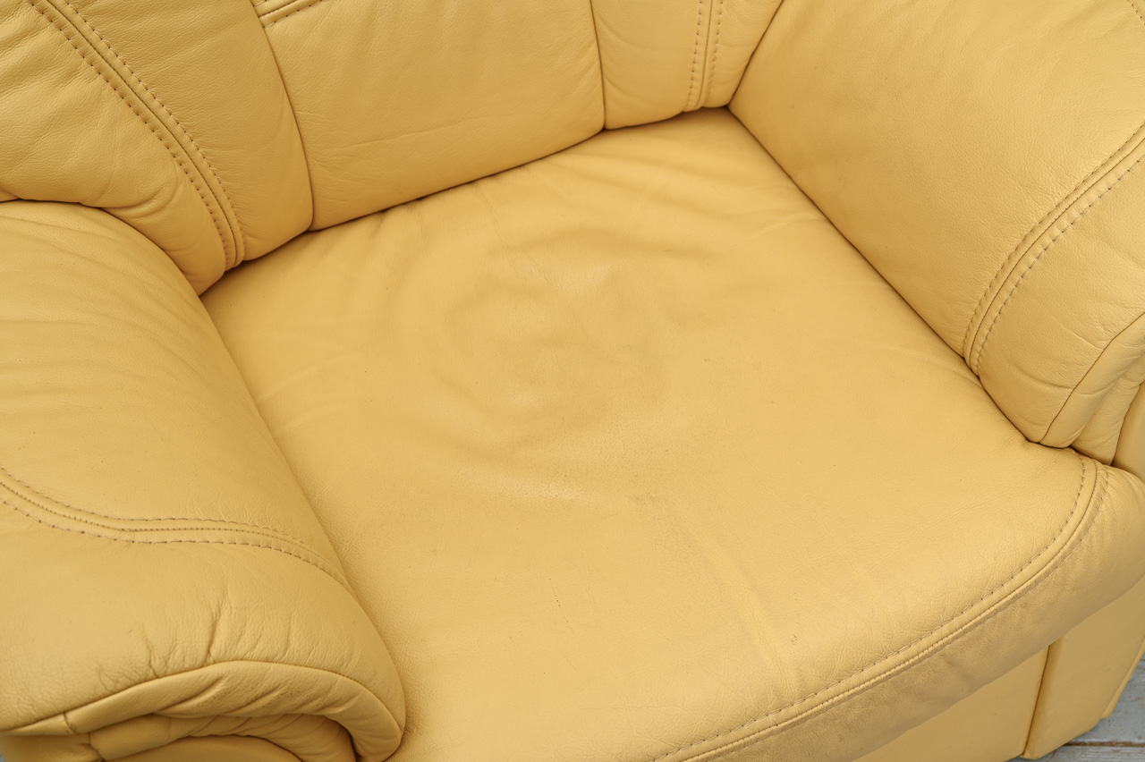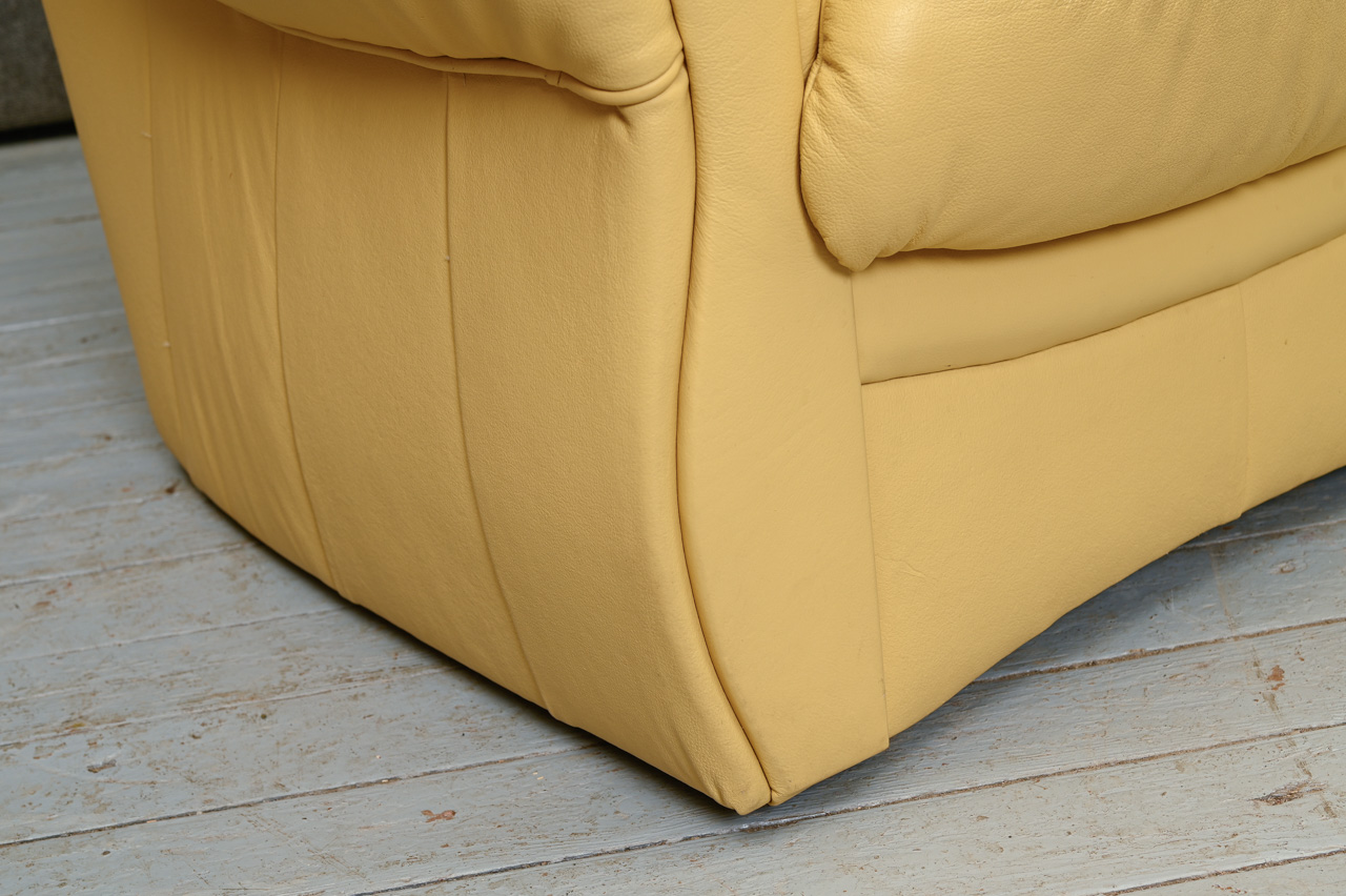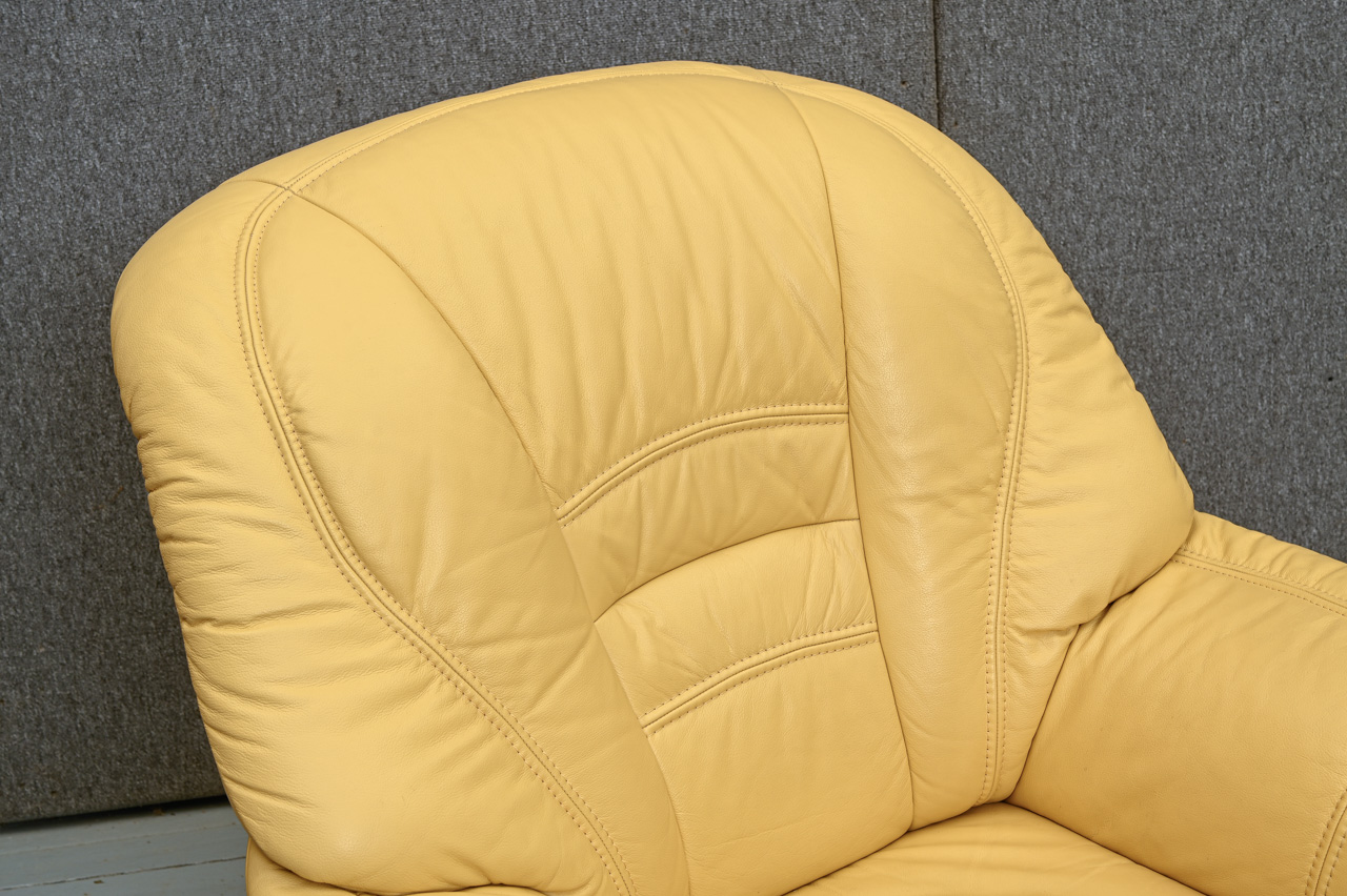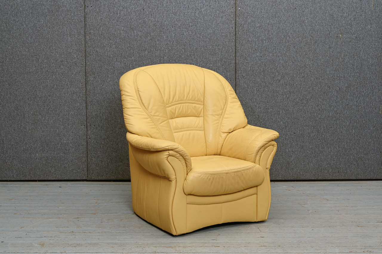 2 mīksto krēslu komplekts. Mīkstie krēsli, tapsēti ar dzeltenu dabīgo ādu. Fasāde zem sēdvirsmas, sāni un aizmugure ar ādas imitācijas tapsējumu. Komplekta kods 260047k.