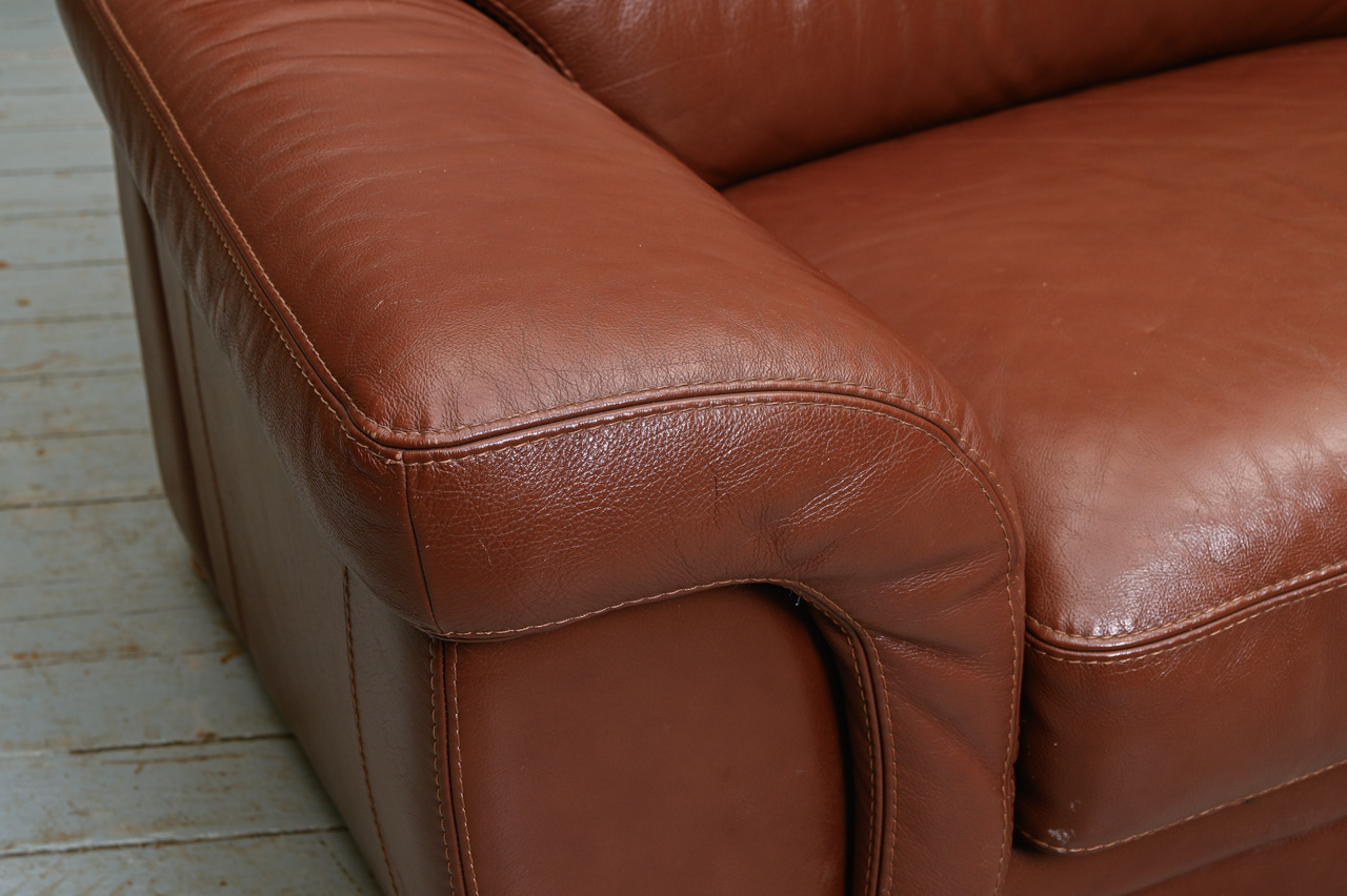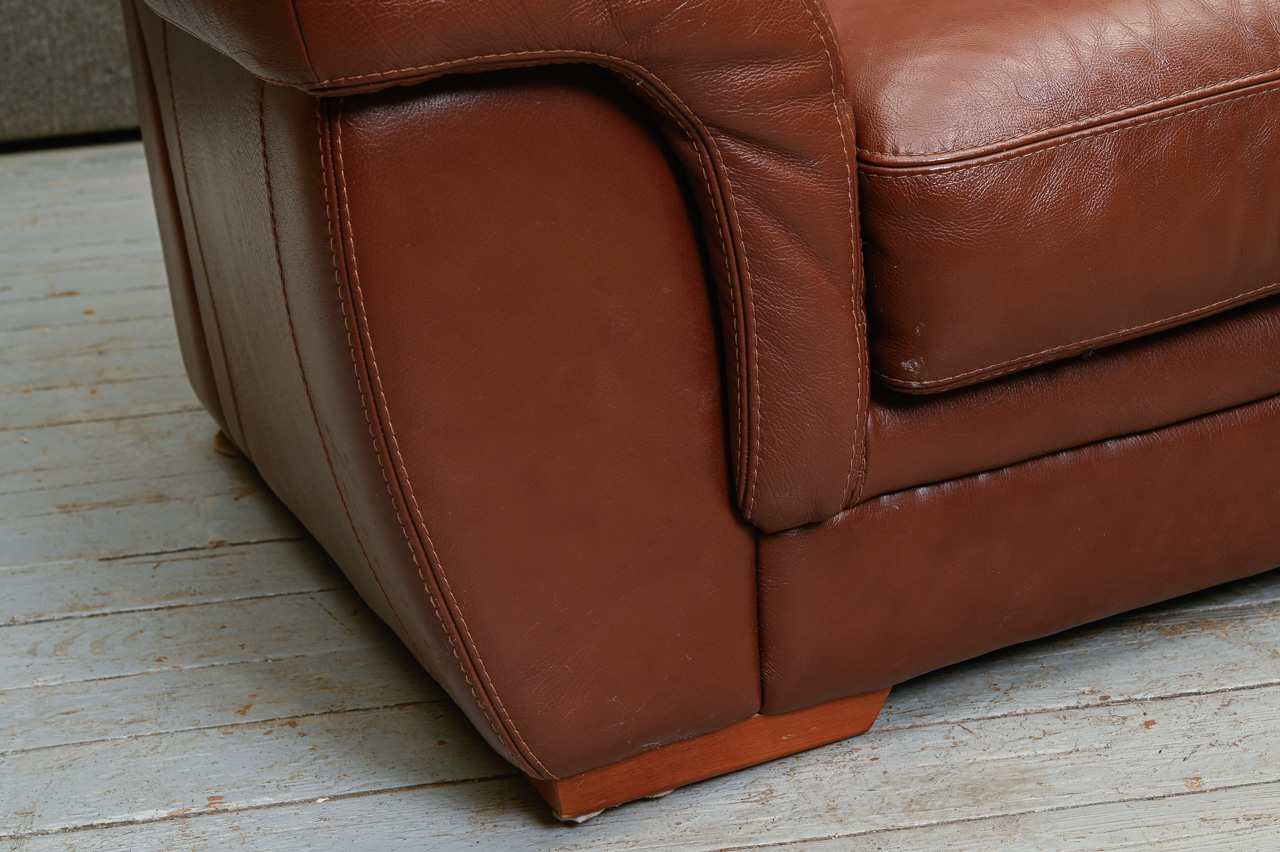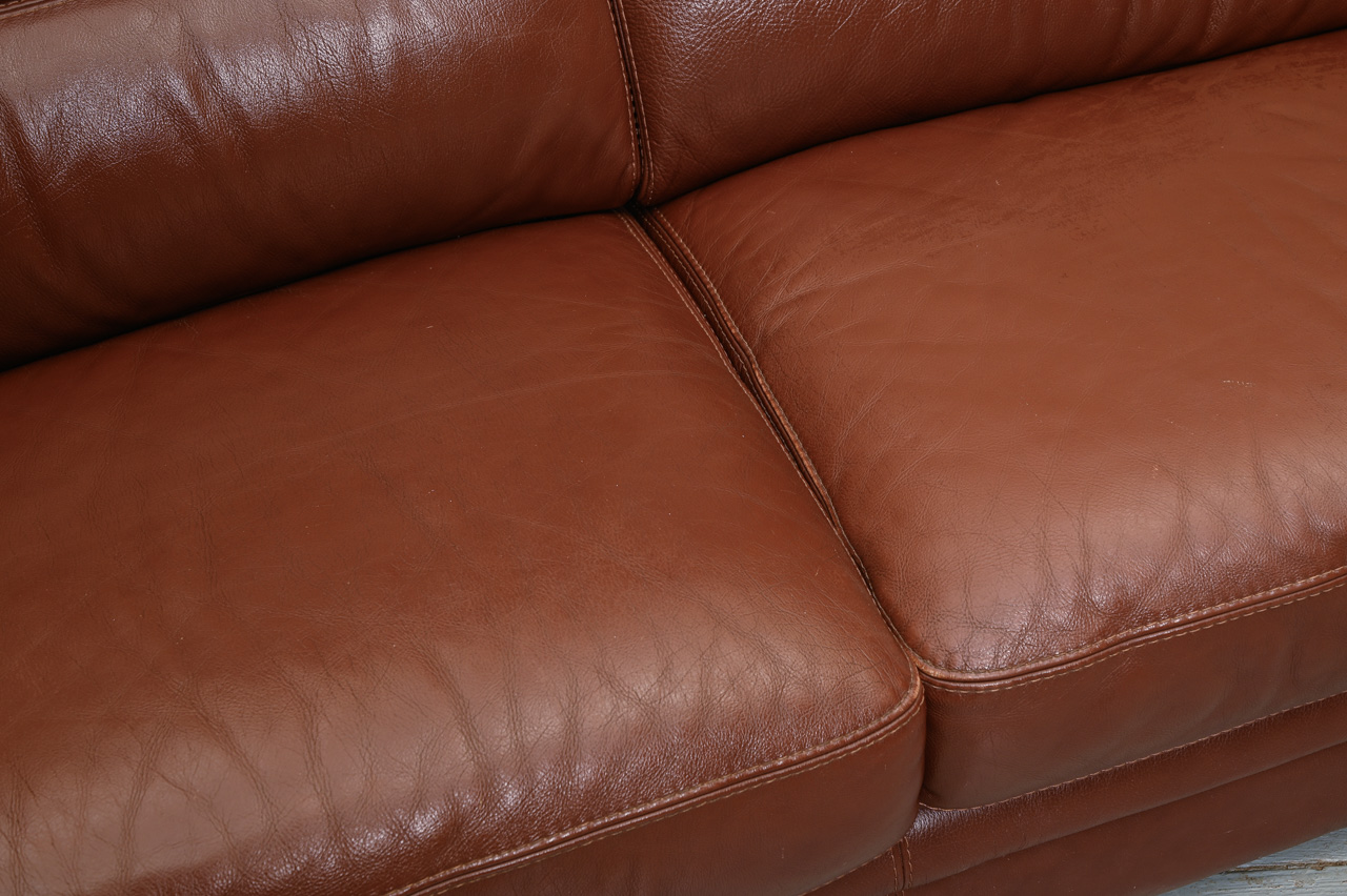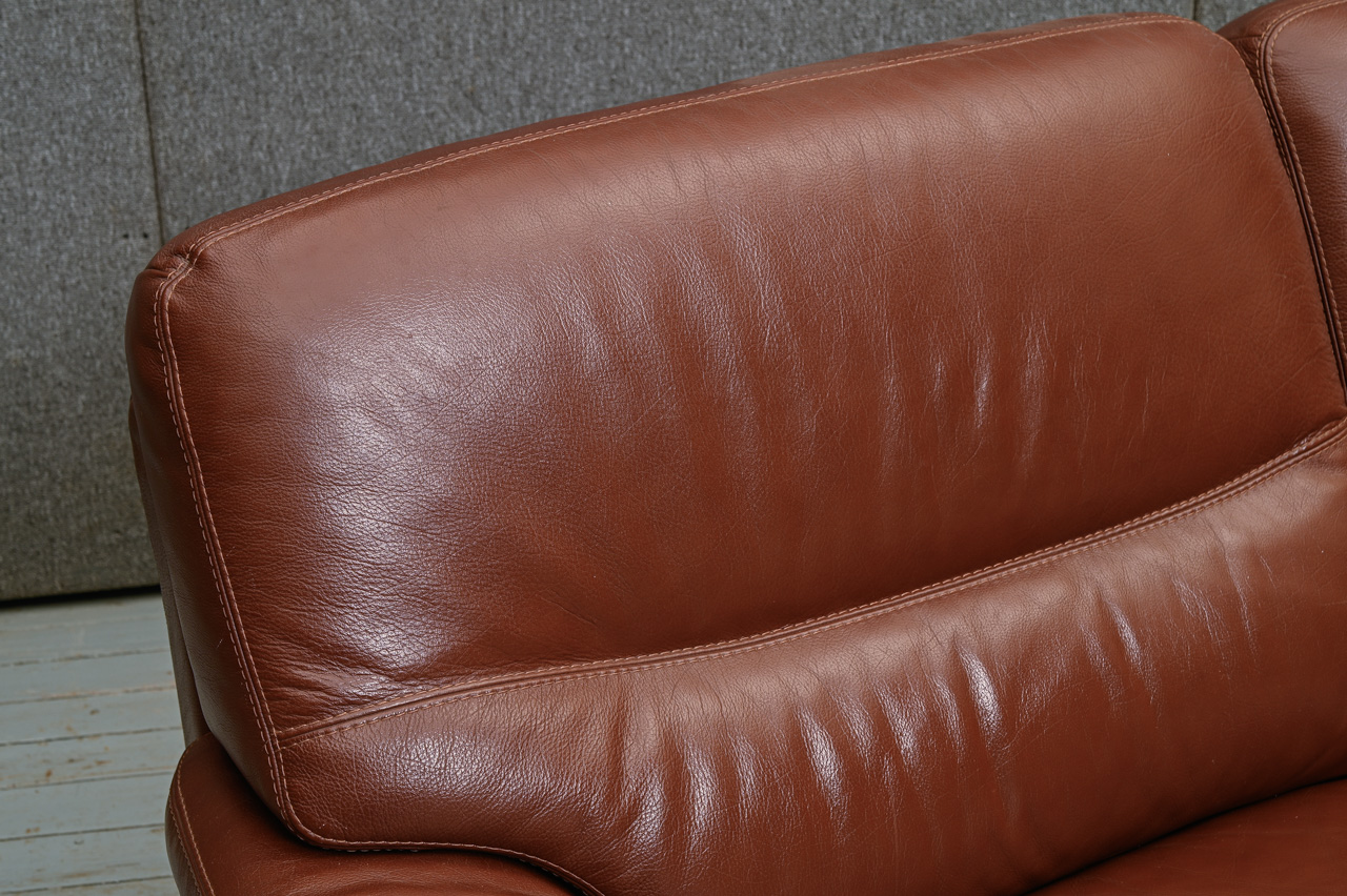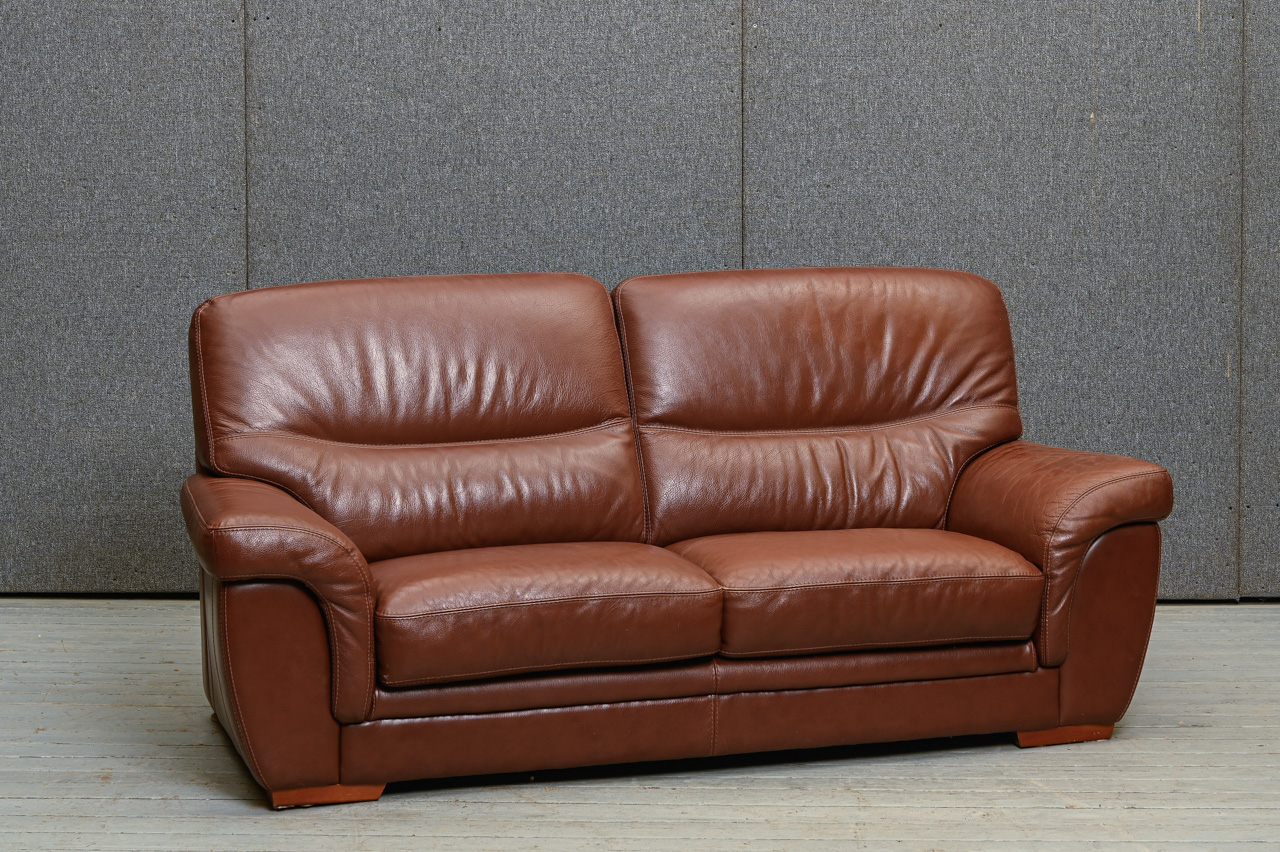 3vietīgs dīvāns, tapsēts ar tumši brūnu dabīgo ādu. Kods 660028.