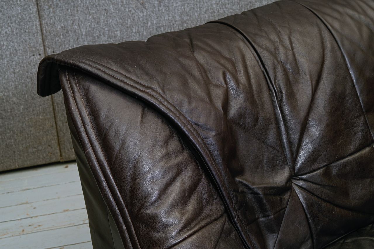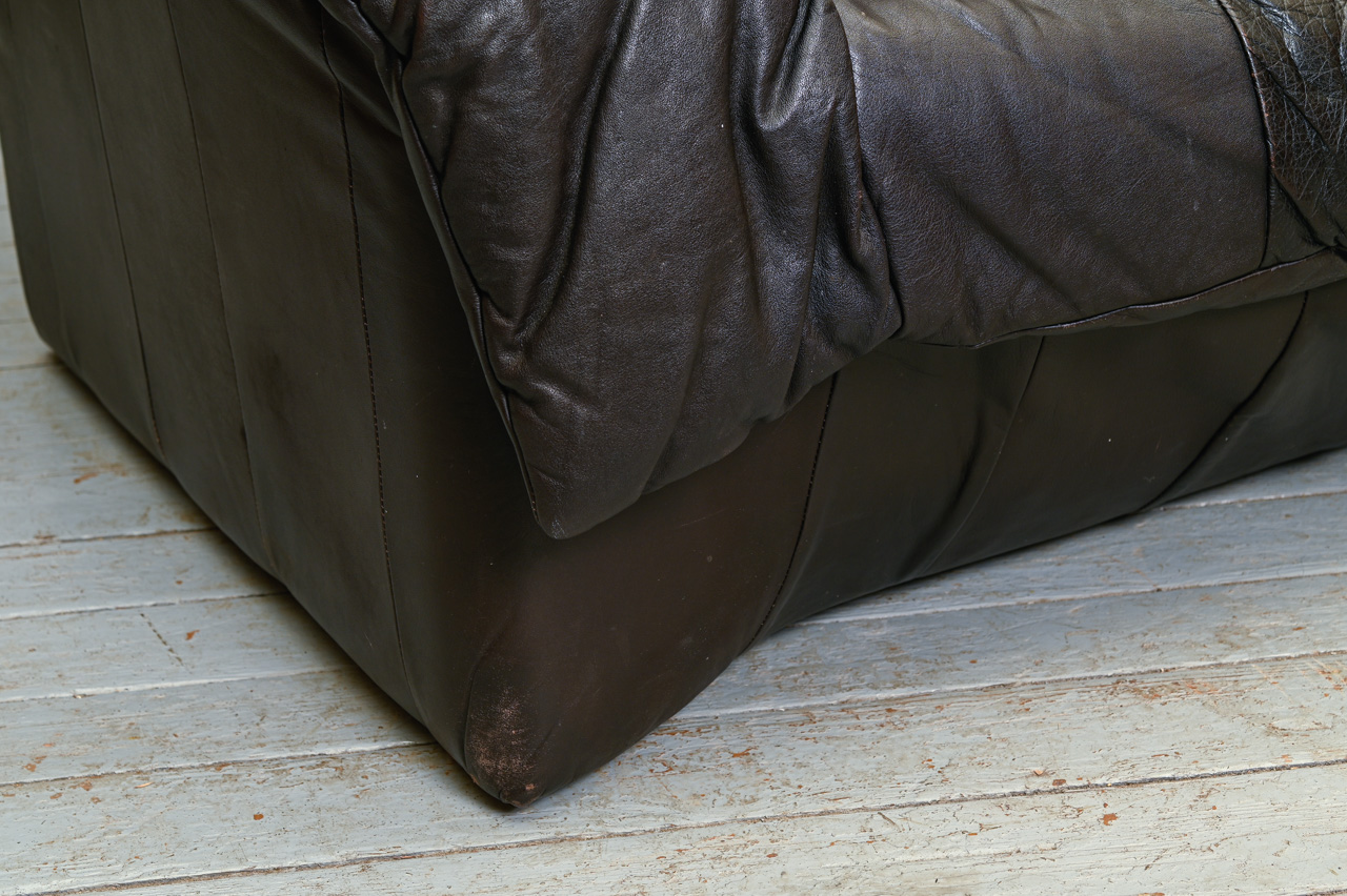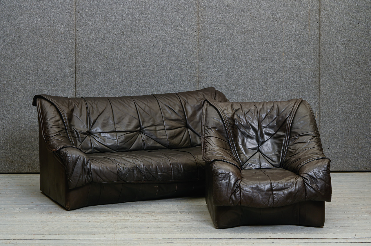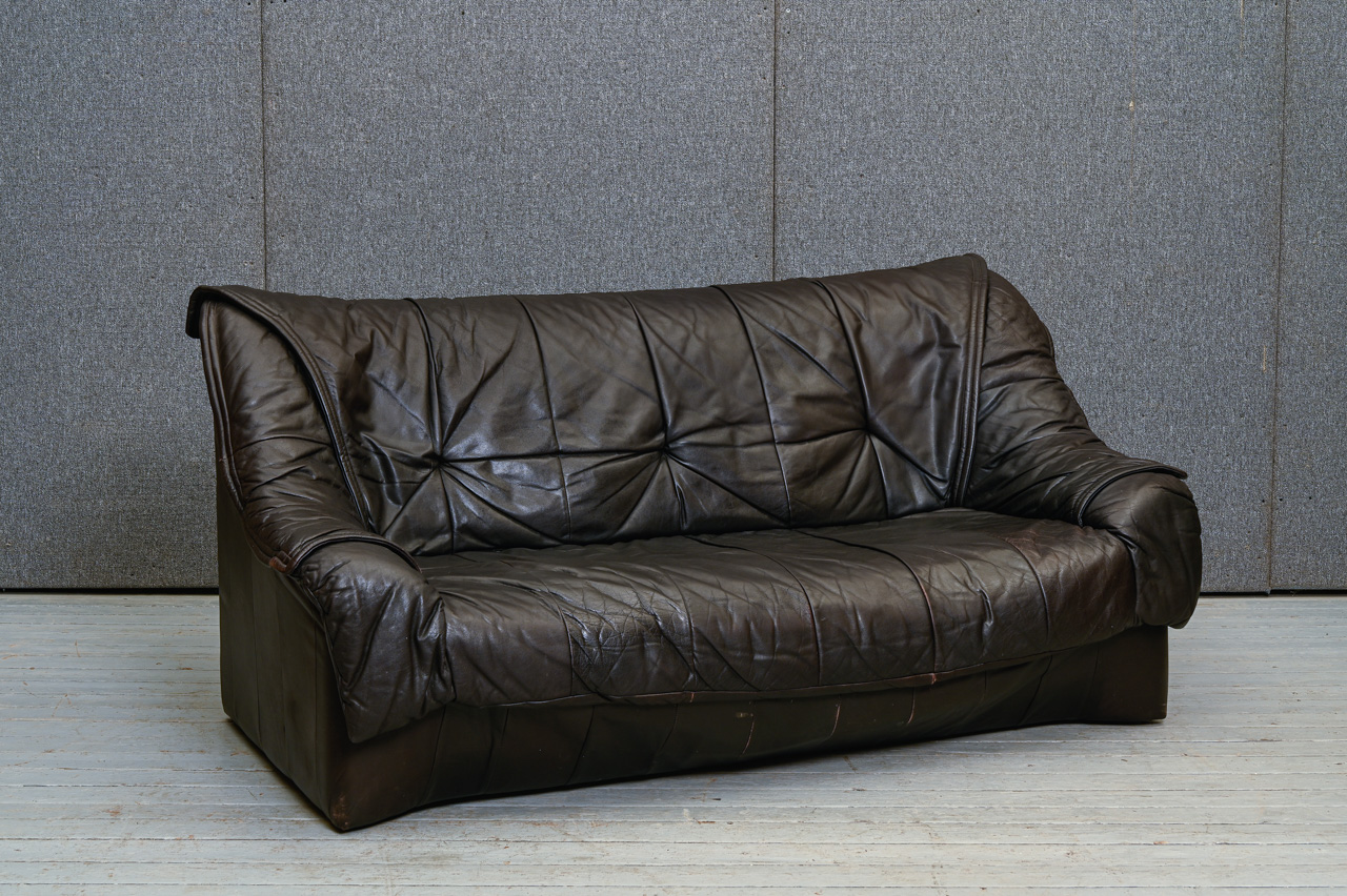 3vietīgs dīvāns, tapsēts ar tumši brūnu, gandrīz melnu dabīgo ādu. Fasādes apakšējā daļa, sāni un aizmugure ar ādas imitācijas tapsējumu. Kods 660039. Pieejams šāds pats dīvāns ar auduma aizmuguri ar bojājumu, kods 660039B. Pieejams šī dīvāna un atpūtas krēsla komplekts. Pērkot komplektu - atlaide. Lai saņemtu komplekta atlaidi, lūdzu, mūsu mājaslapā izvēlēties preci ar kodu 660039k.
