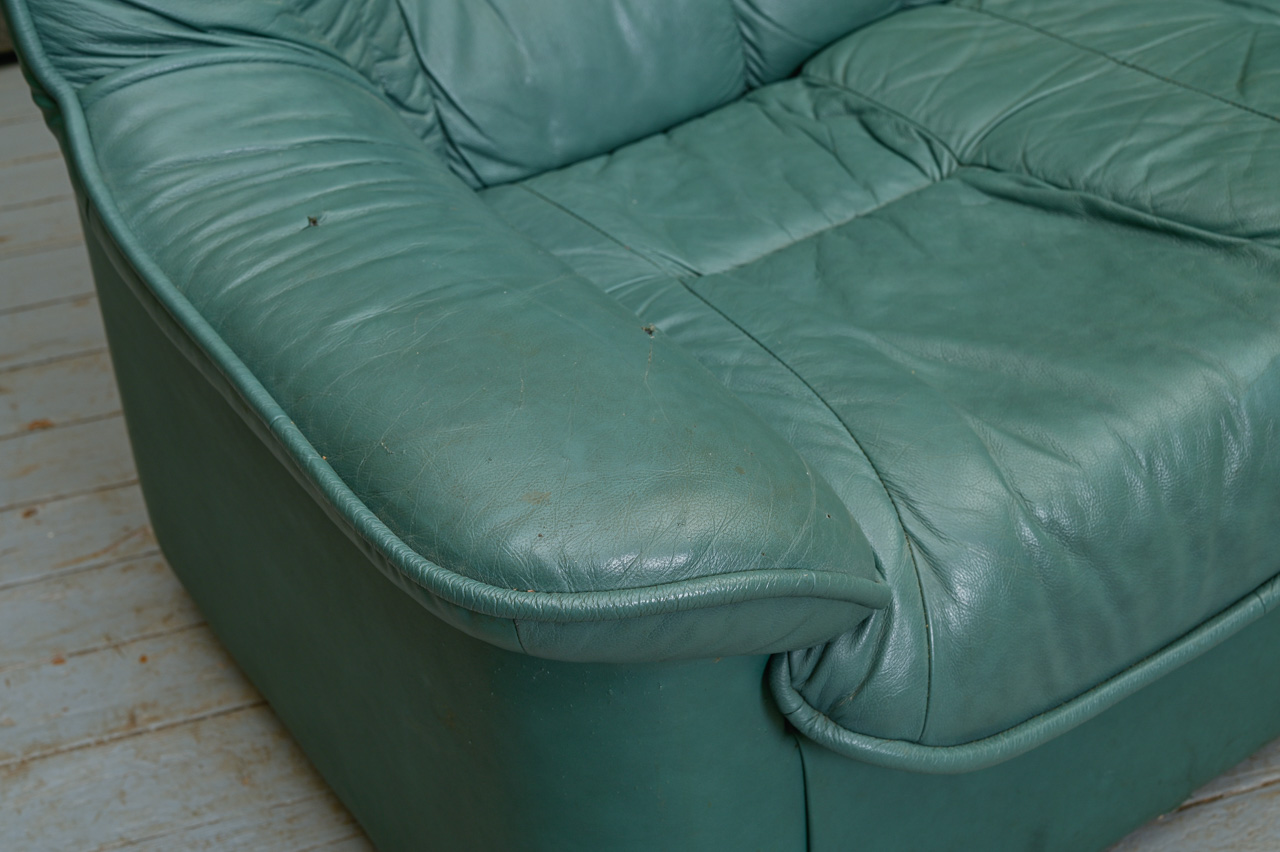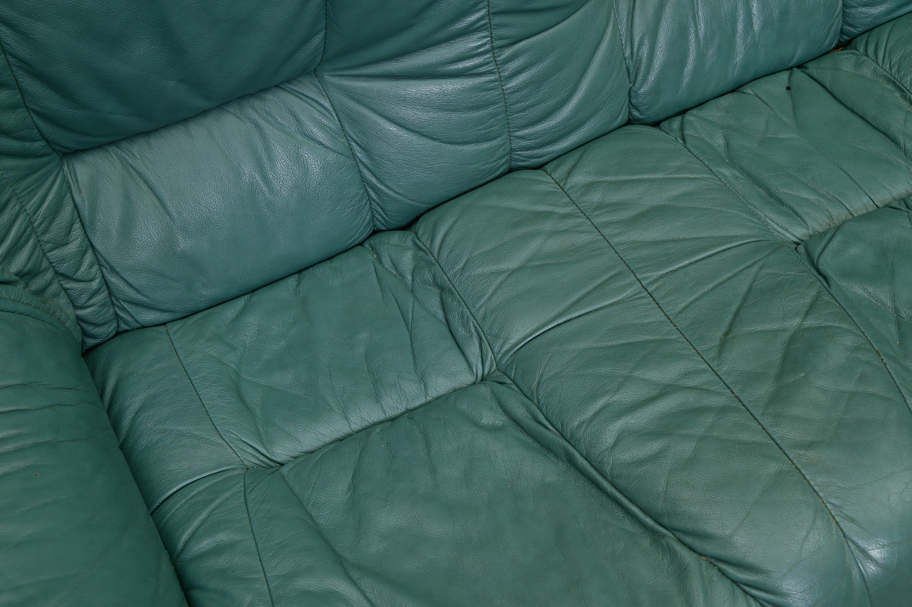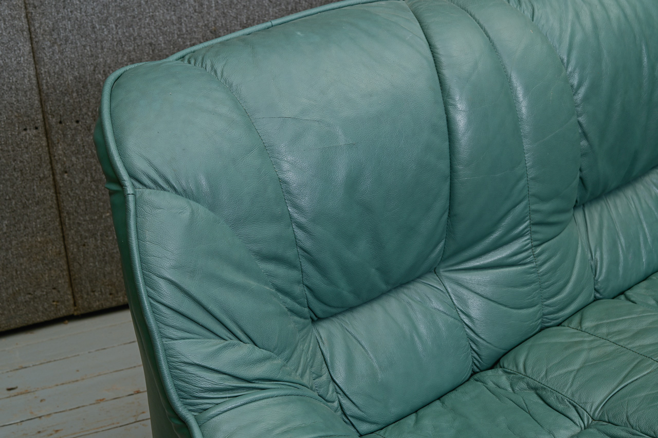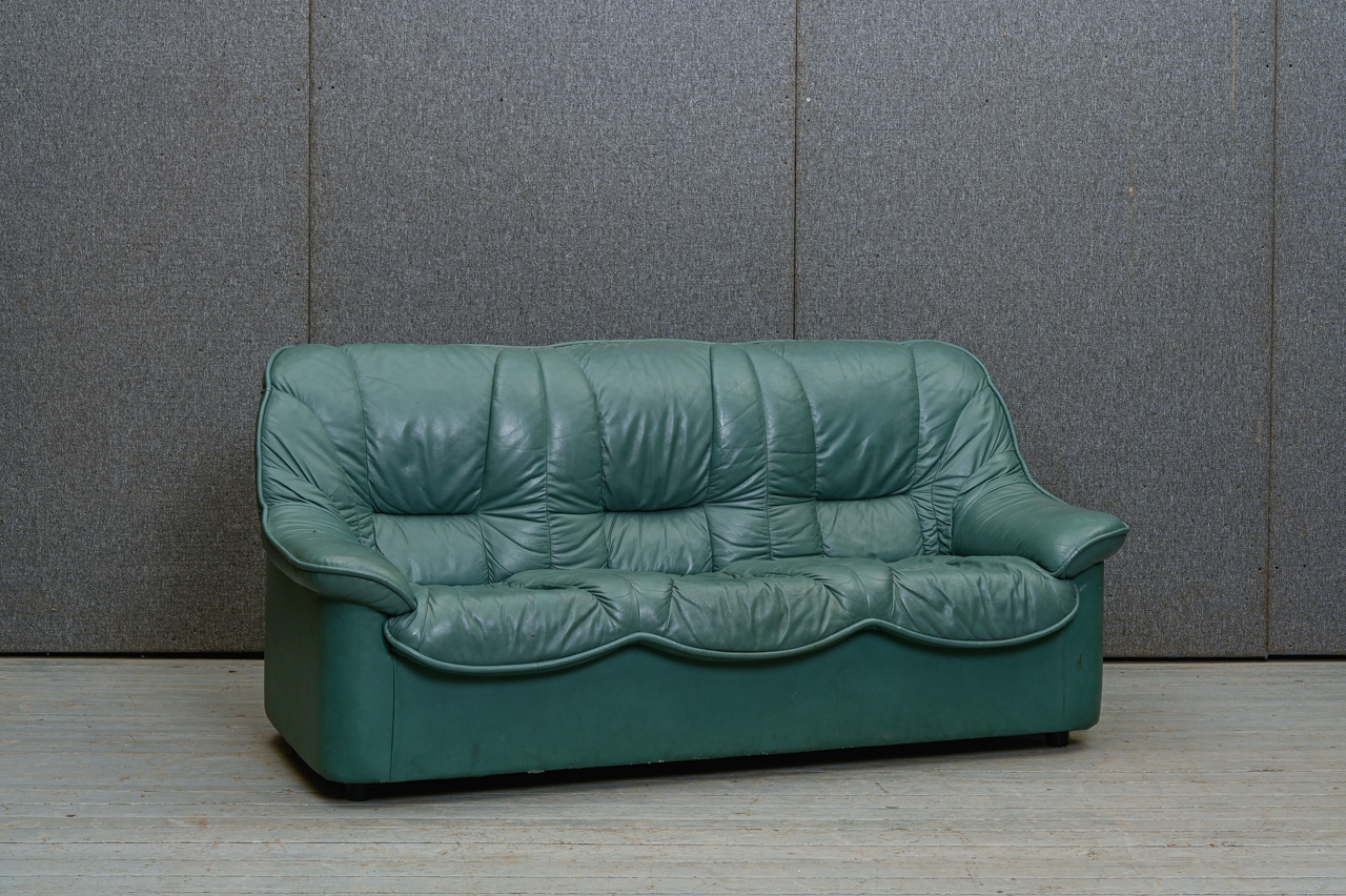 3vietīgs dīvāns, tapsēts ar zaļu dabīgo ādu. Fasādes apakšējā daļa, sāni un aizmugure ar ādas imitācijas tapsējumu. Kods 660046.