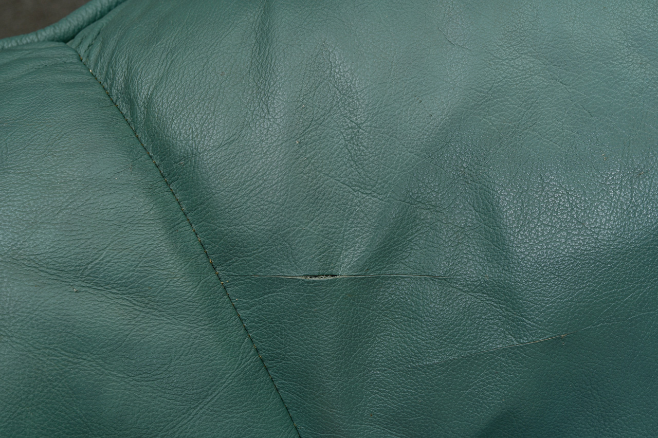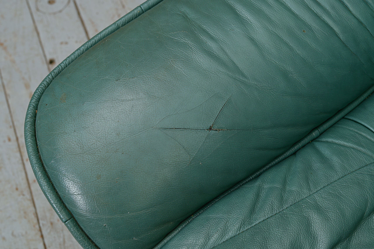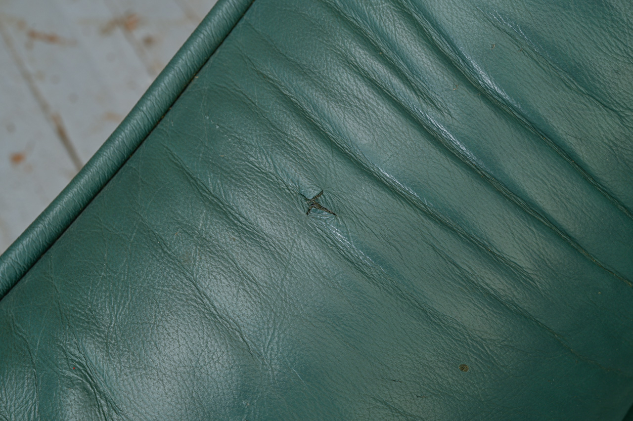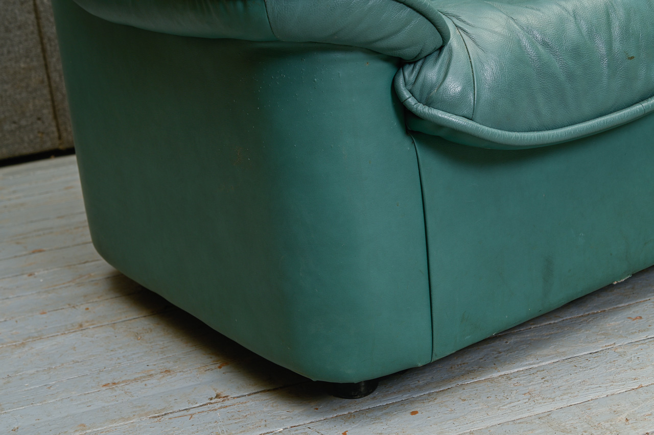 3vietīgs dīvāns, tapsēts ar zaļu dabīgo ādu. Fasādes apakšējā daļa, sāni un aizmugure ar ādas imitācijas tapsējumu. Kods 660046.