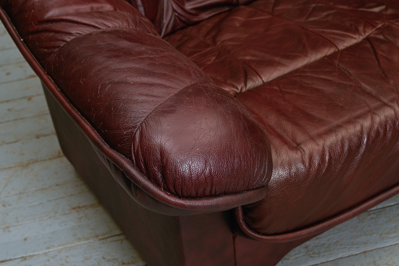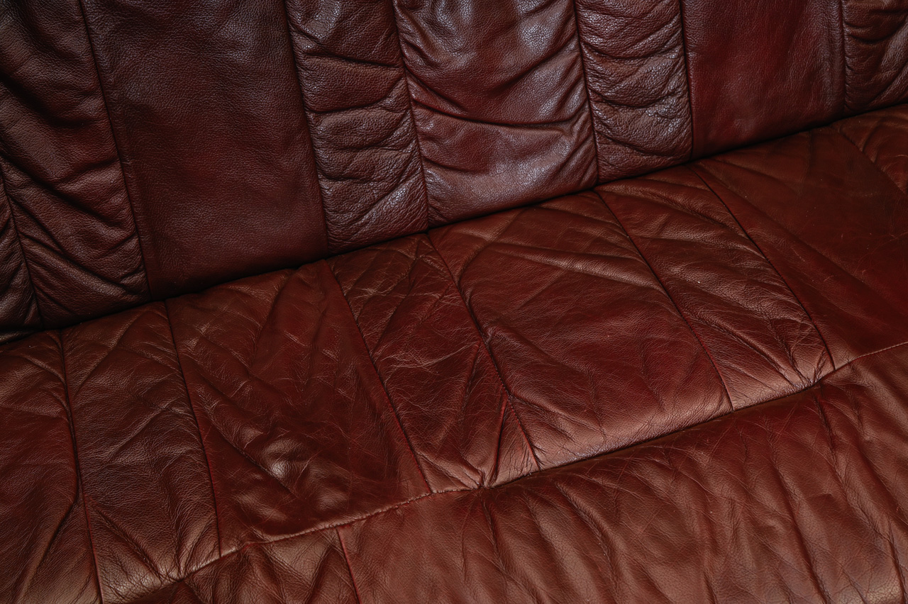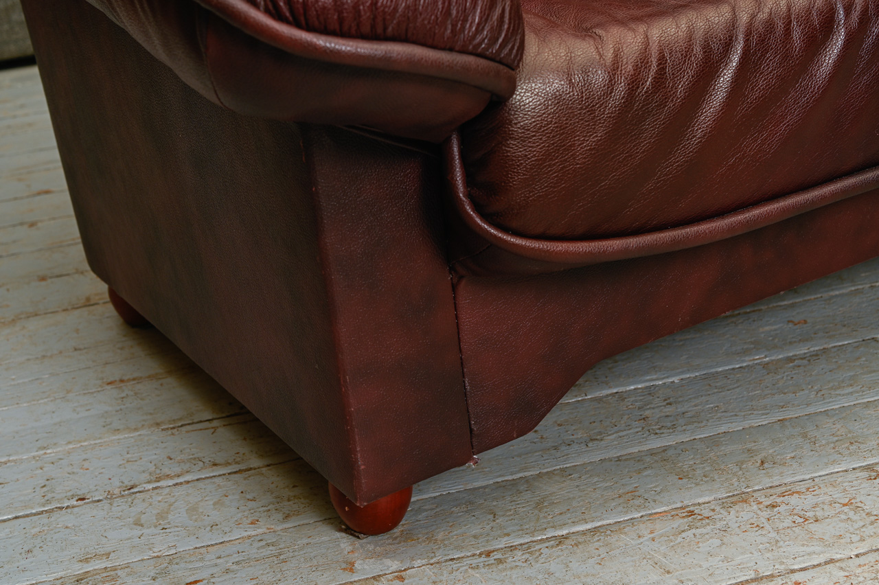 3vietīgs dīvāns, tapsēts ar tumšu, sarkanbrūnu dabīgo ādu. Fasāde zem sēdvirsmas, sāni un aizmugure ar ādas imitācijas tapsējumu. Kods 660048.