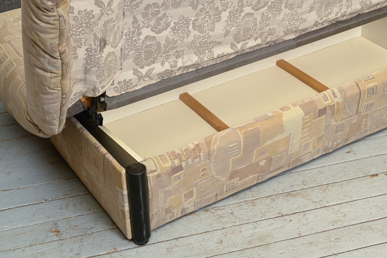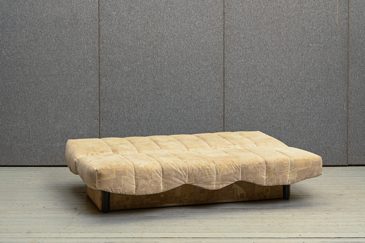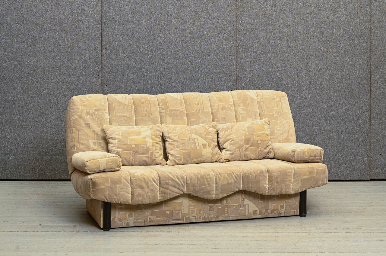 Izlaižams 3vietīgs dīvāns, tapsēts ar divu toņu zaļu mēbeļu audumu. Guļamā platība 135x200cm. Kods 560040.