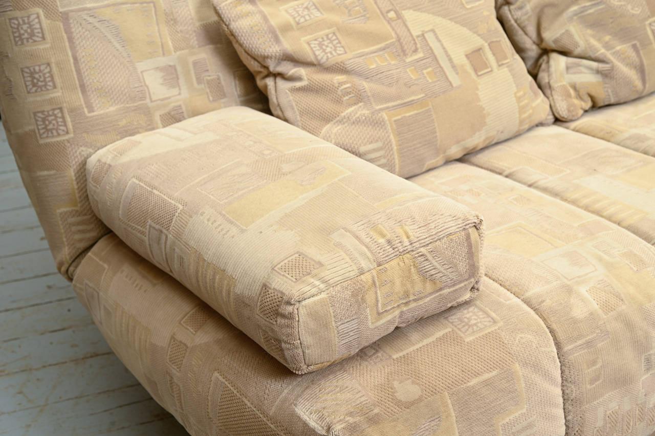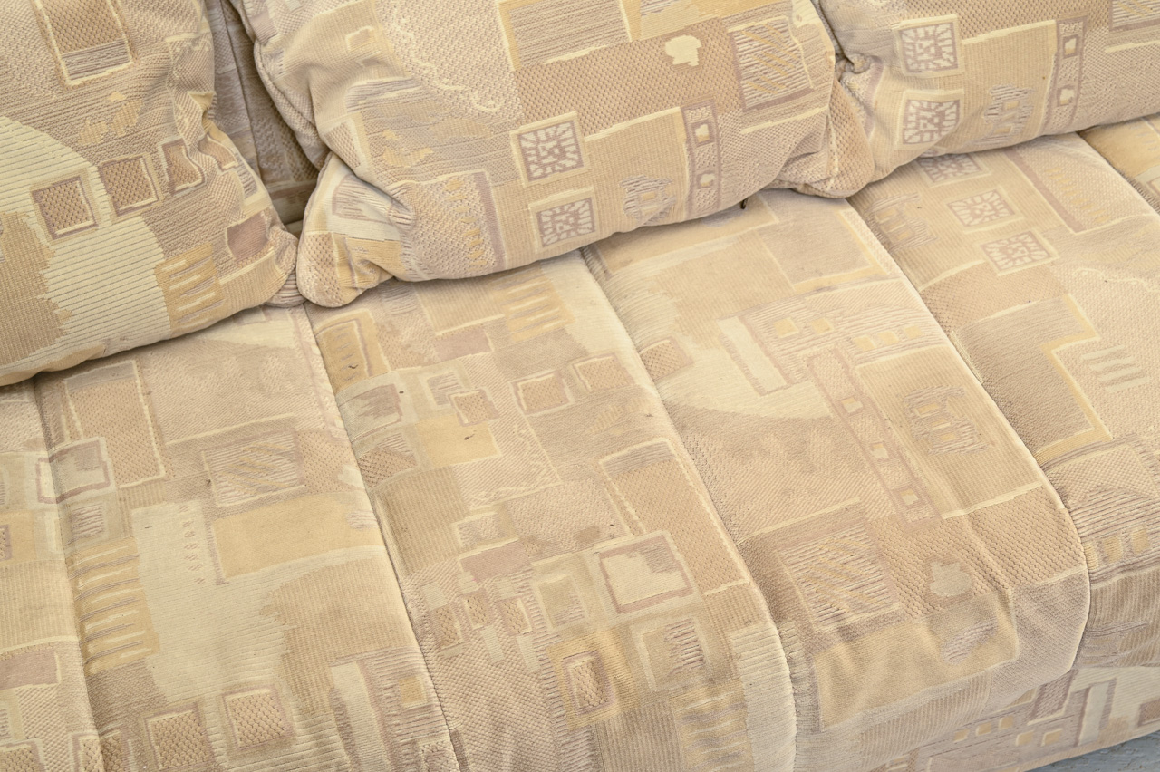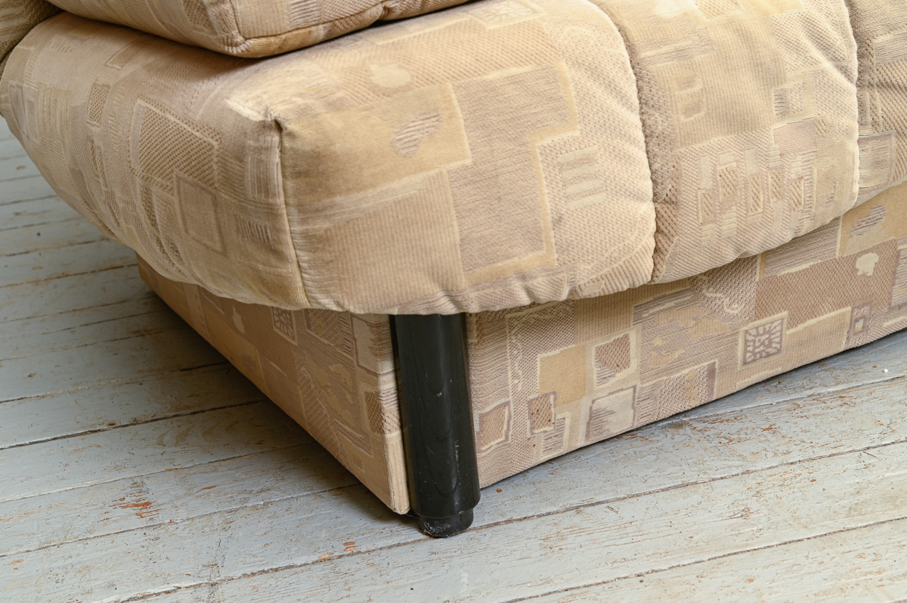 Izlaižams 3vietīgs dīvāns, tapsēts ar divu toņu zaļu mēbeļu audumu. Guļamā platība 135x200cm. Kods 560040.