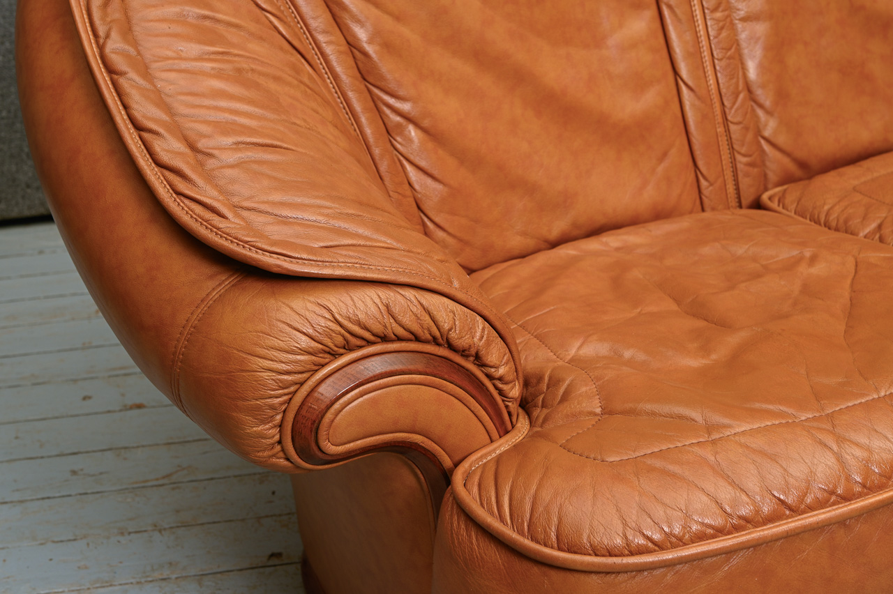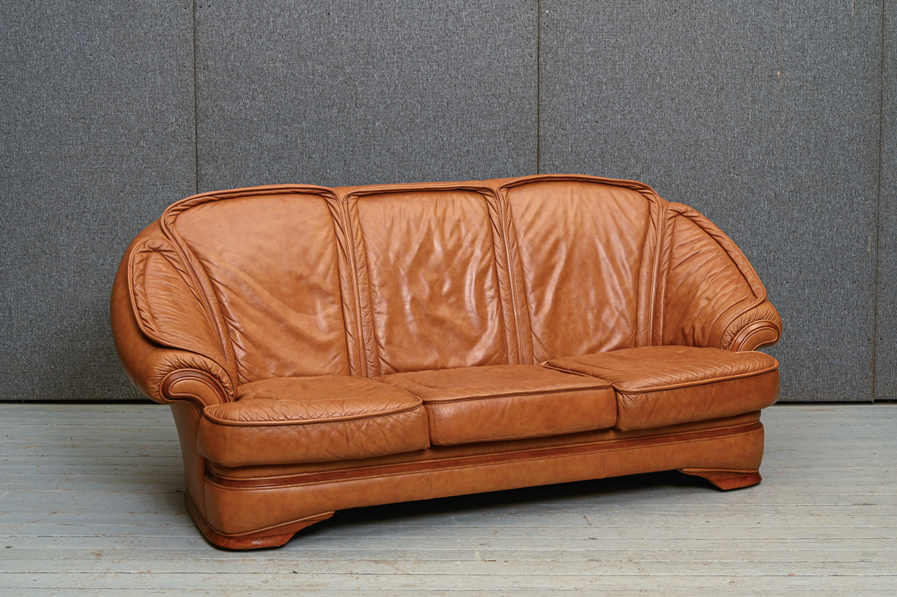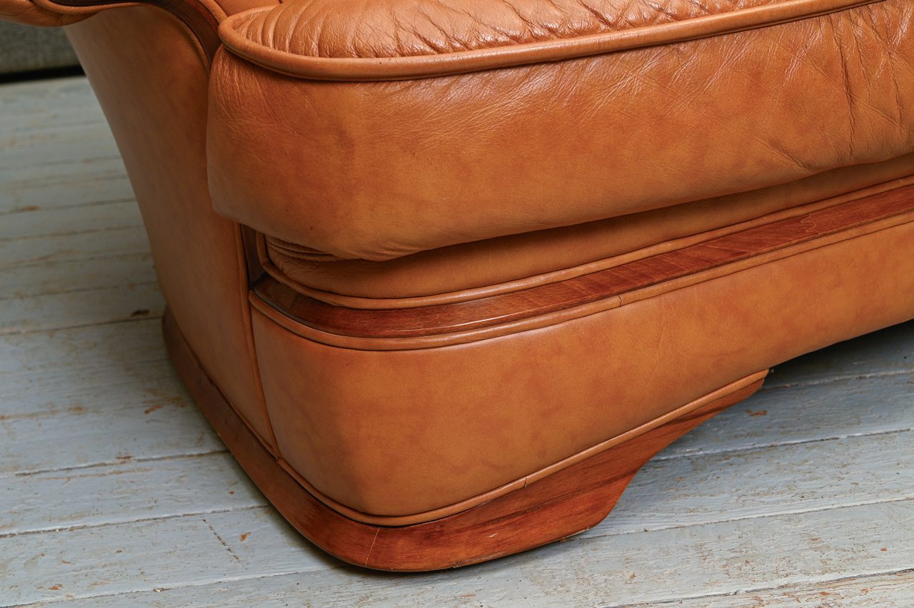 3vietigs dīvāns ar dabīga koka detaļām, tapsēts ar rudu dabīgo ādu. Kods 660031.