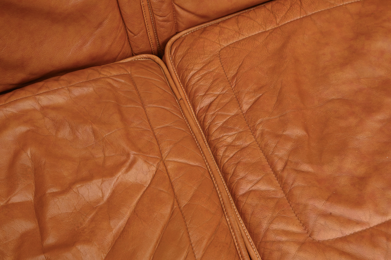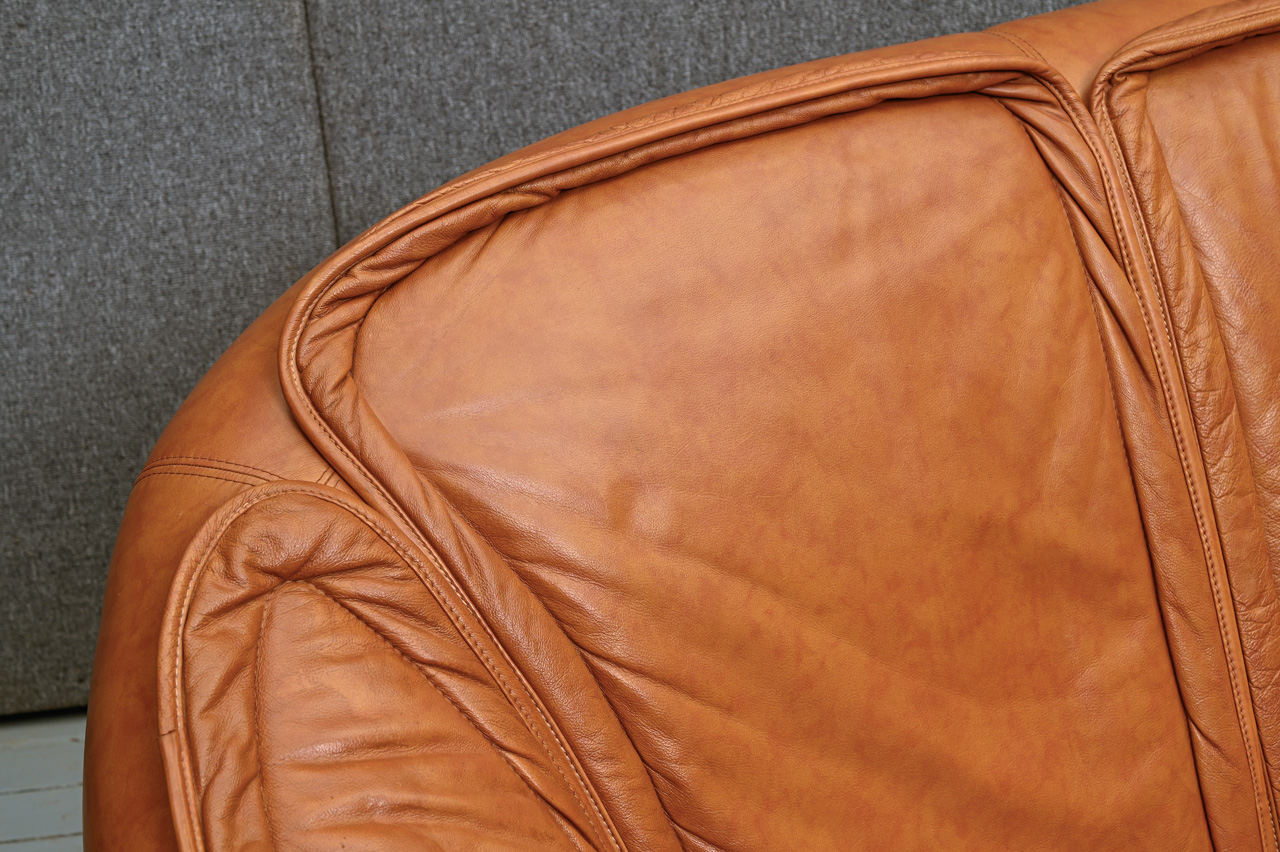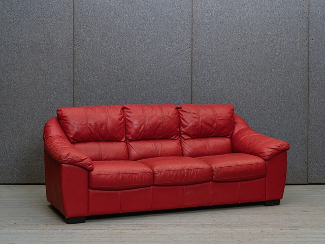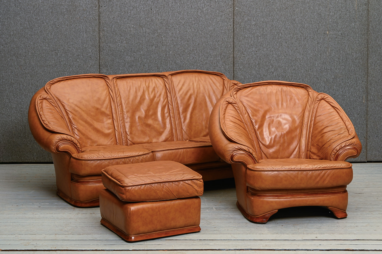 3vietigs dīvāns ar dabīga koka detaļām, tapsēts ar rudu dabīgo ādu. Kods 660031.