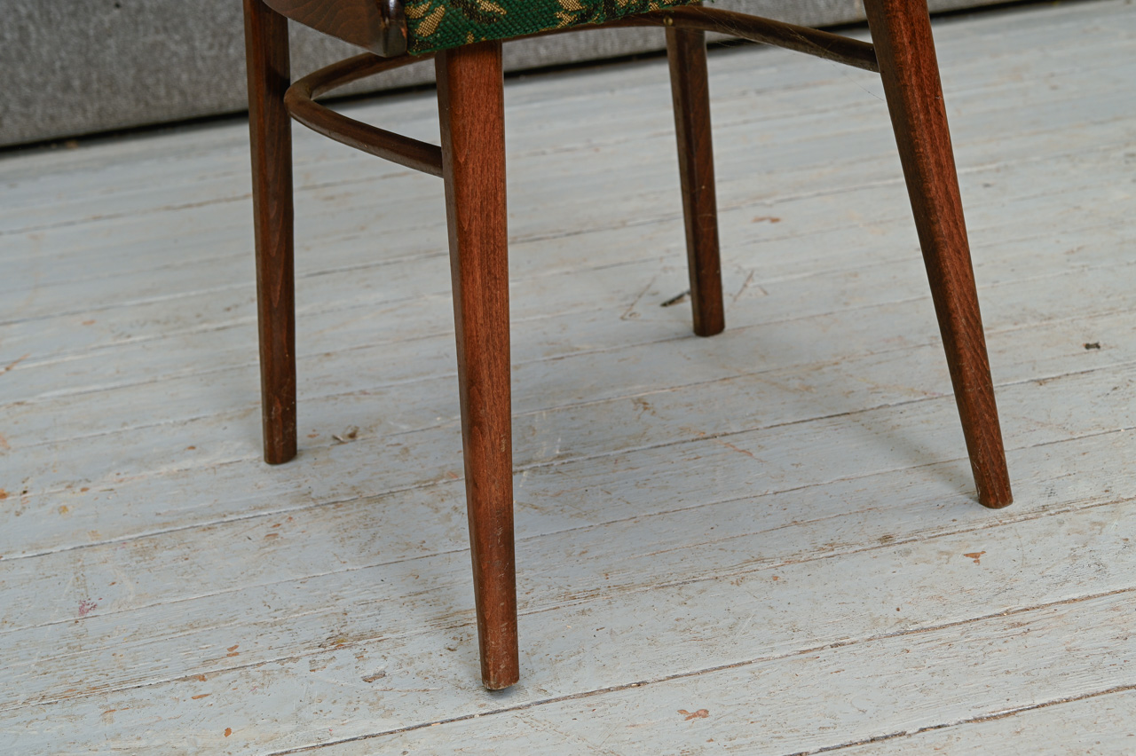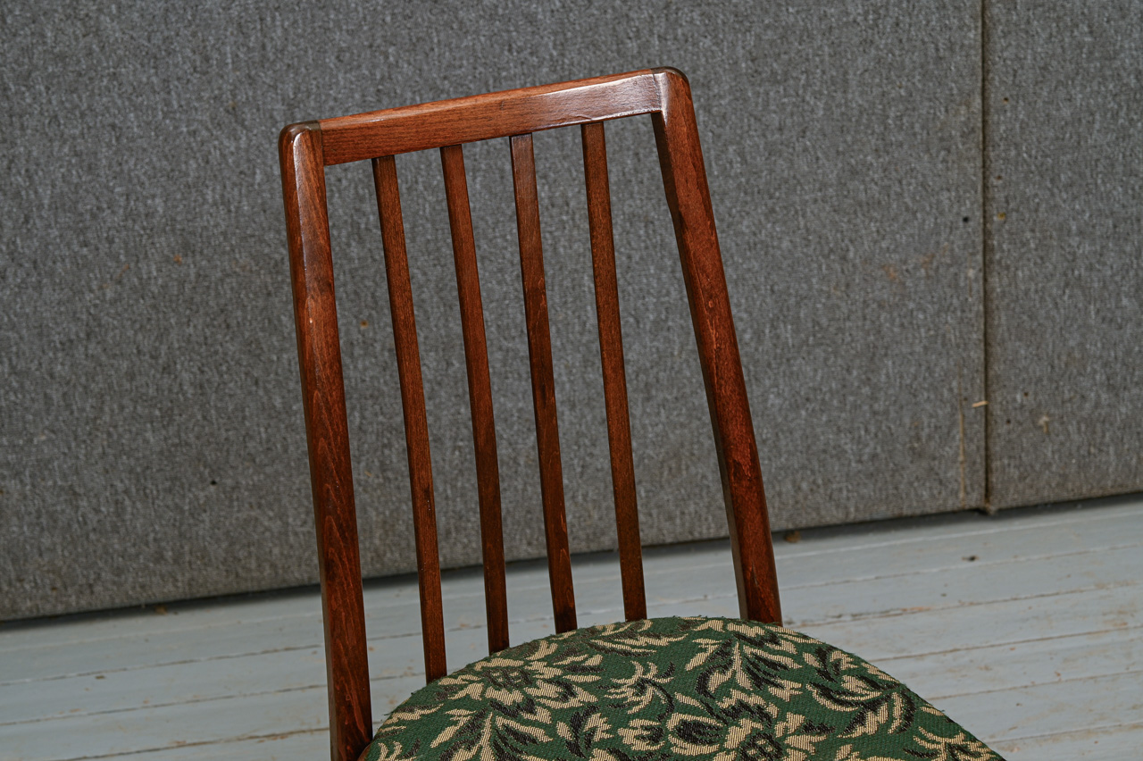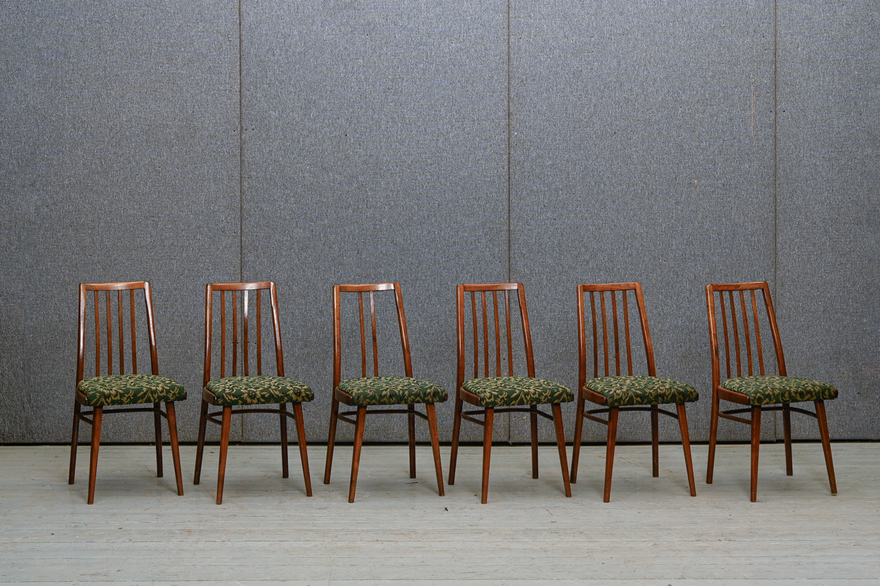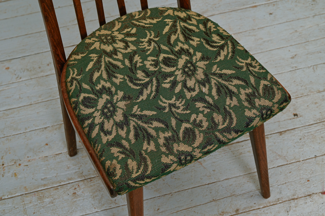 Brūni beicētu ozolkoka krēslu komplekts, sēdvirsmā tapsēti ar zaļu gobelēna audumu ar ziedu rakstu. Vienam krēslam trūkst 2 atzveltnes līstes. Komplekta kods 160169k.