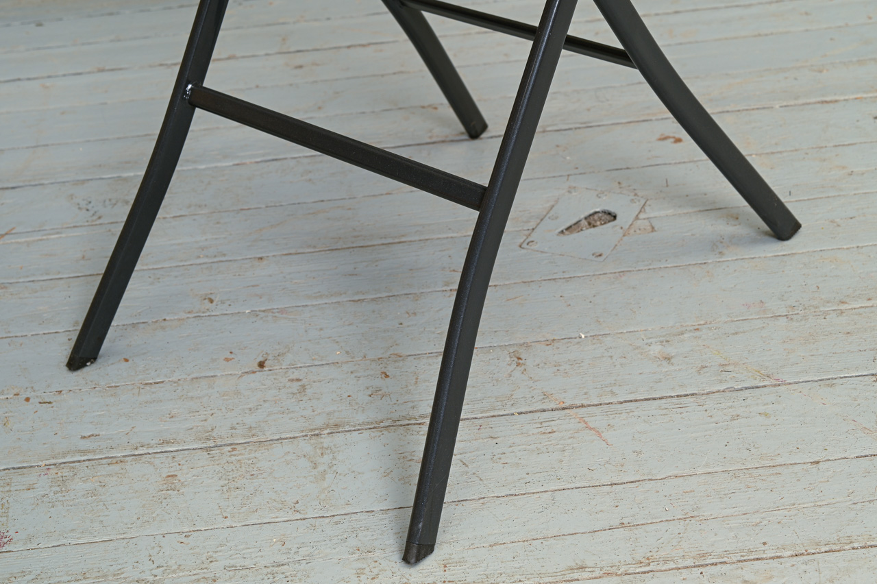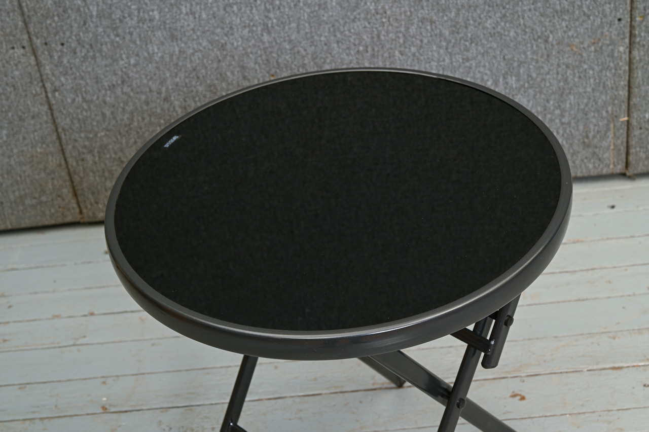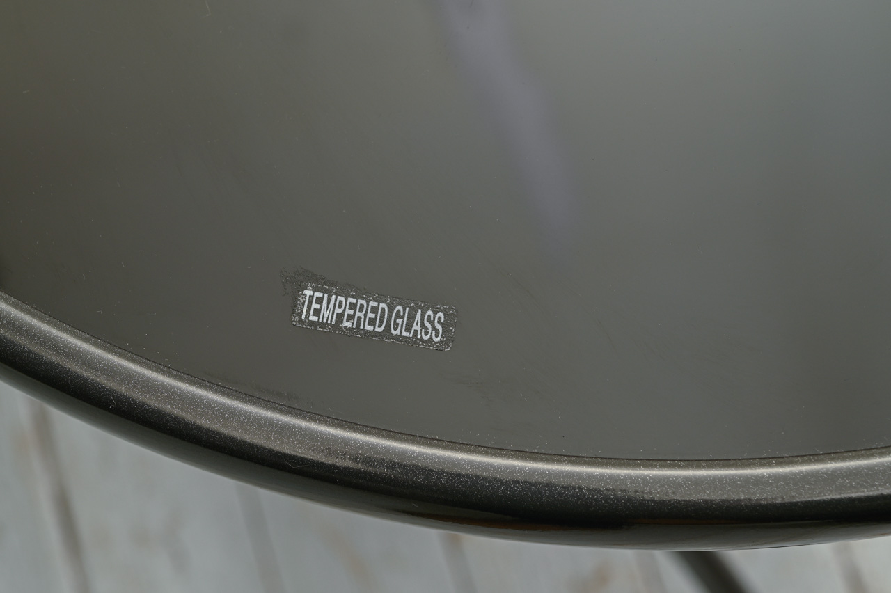 Galdiņš ar saliekamu metāla rāmi. Apaļa rūdītā stikla virsma metāla rāmī. Nelietots, salikts. Kods 308308.