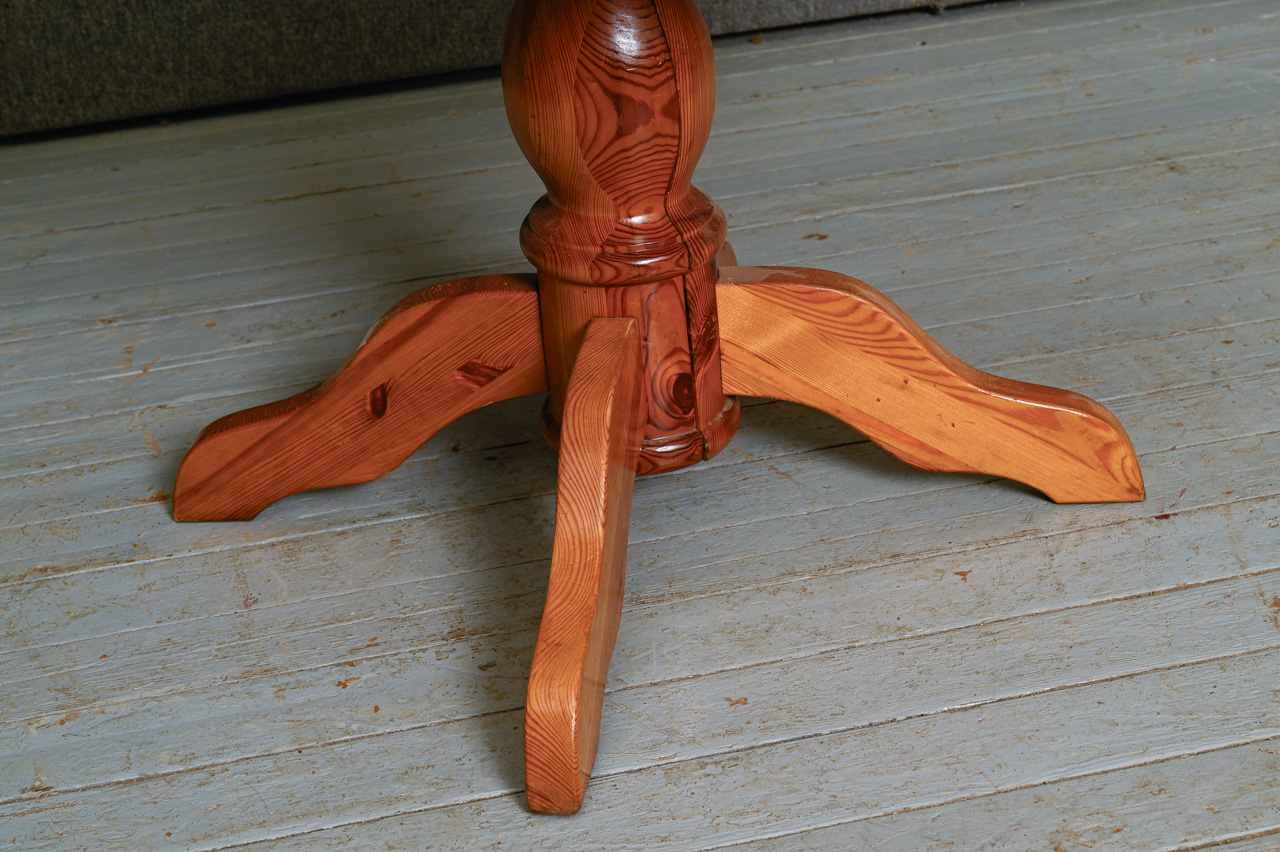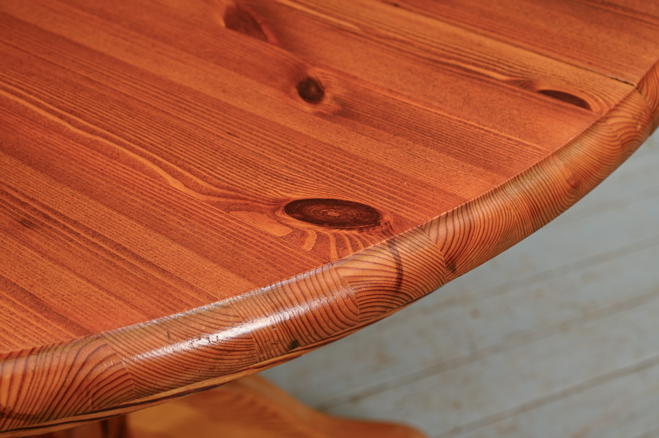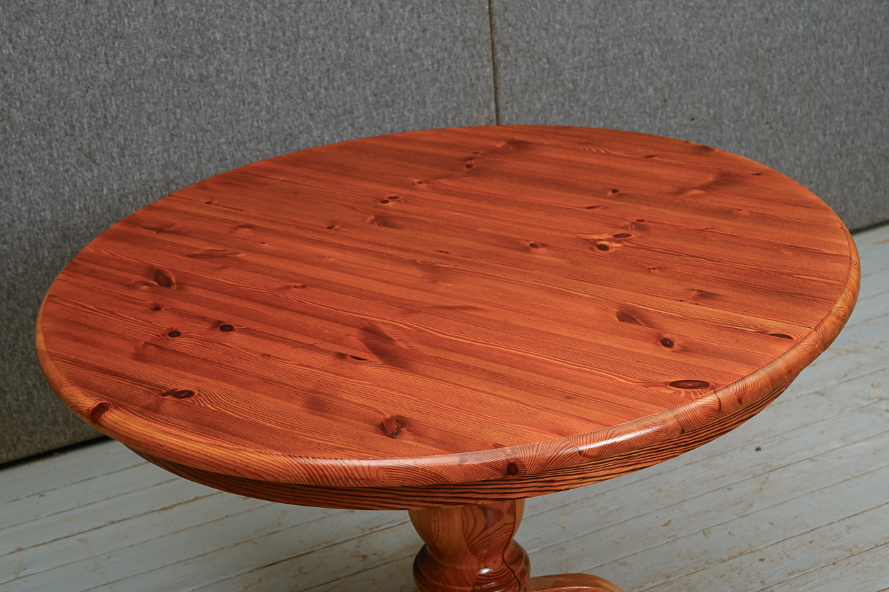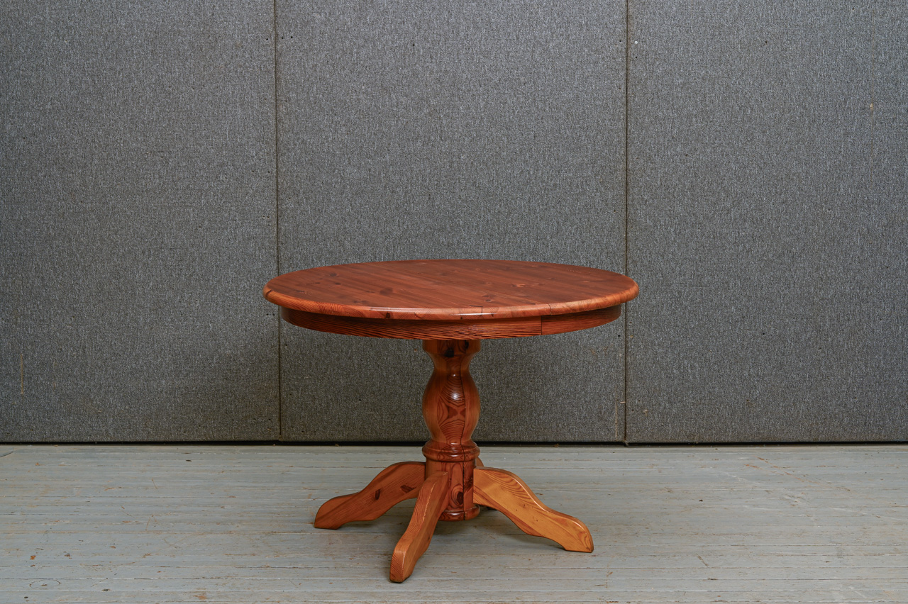Priedes koka galds ar apaļu virsmu ar eļļas pārklājumu. Virsma ir izvelkama ar pagarināšanas fuknciju. Pagarināmā plāksne nav komplektā. Kods 360125.