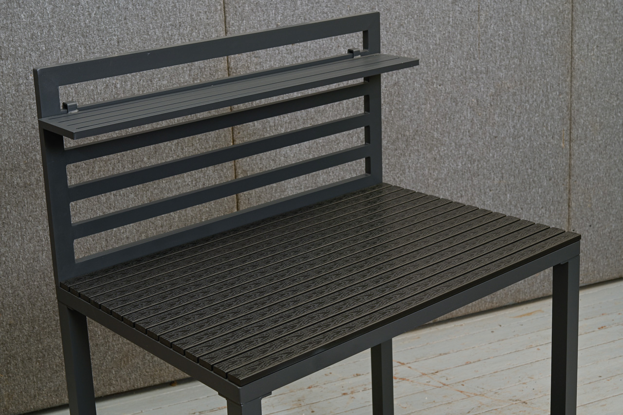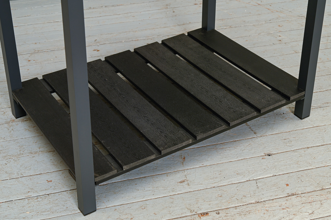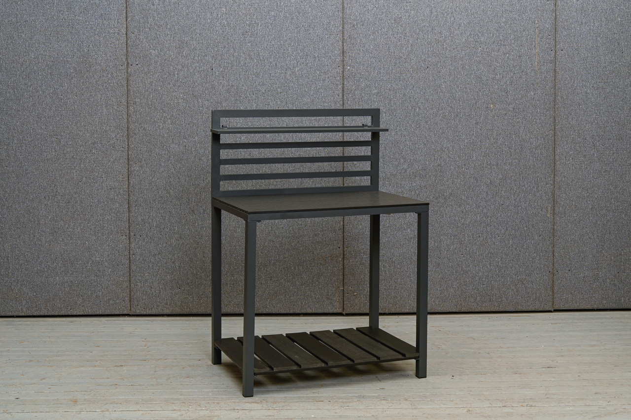 Āra virtuves galds alumīnija rāmī ar polimēra dēļu galda virsmu, apakšējo plauktu un augstumā regulējamu sienas plauktiņu. Apakšējam plauktam neoriģināli polimēra dēļi. Nelietots, salikts. Kods 808359.