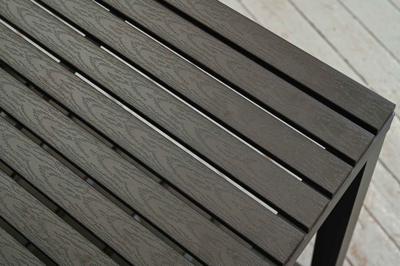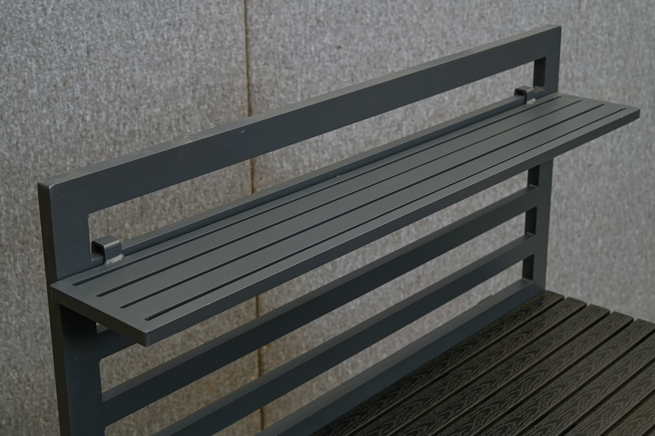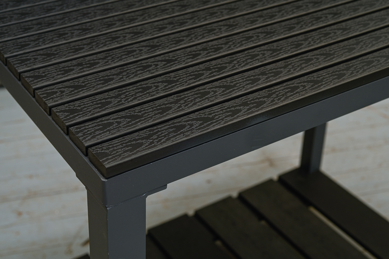 Āra virtuves galds alumīnija rāmī ar polimēra dēļu galda virsmu, apakšējo plauktu un augstumā regulējamu sienas plauktiņu. Apakšējam plauktam neoriģināli polimēra dēļi. Nelietots, salikts. Kods 808359.