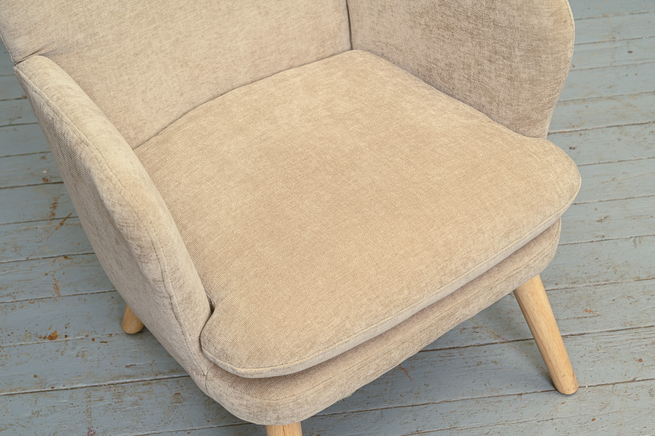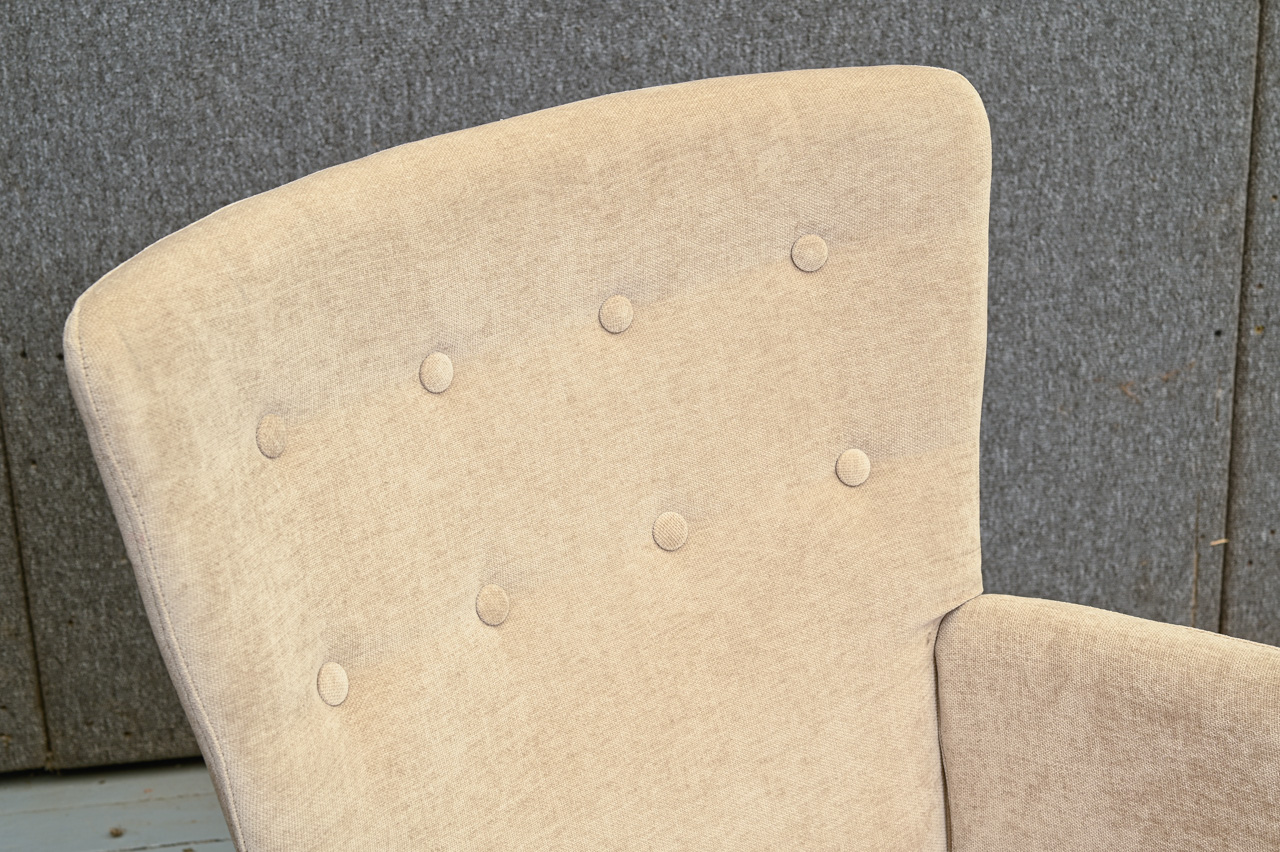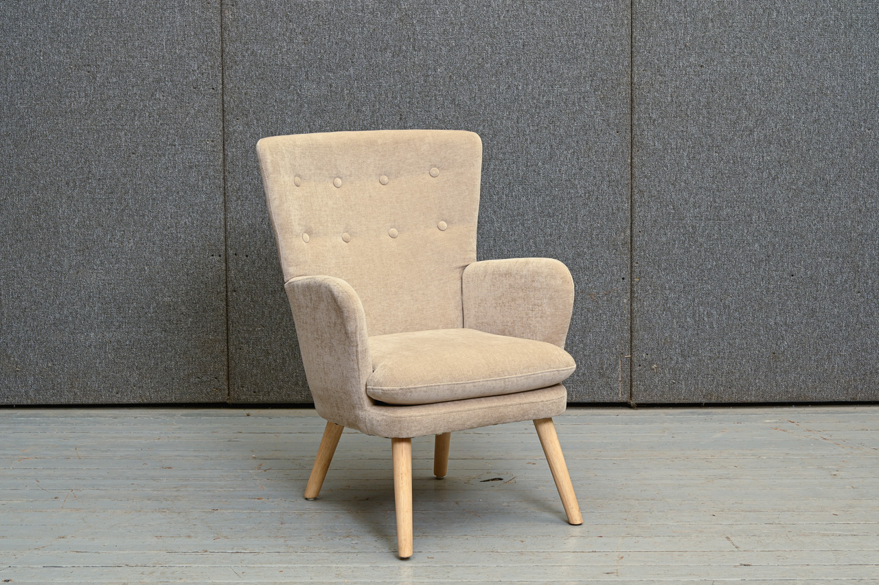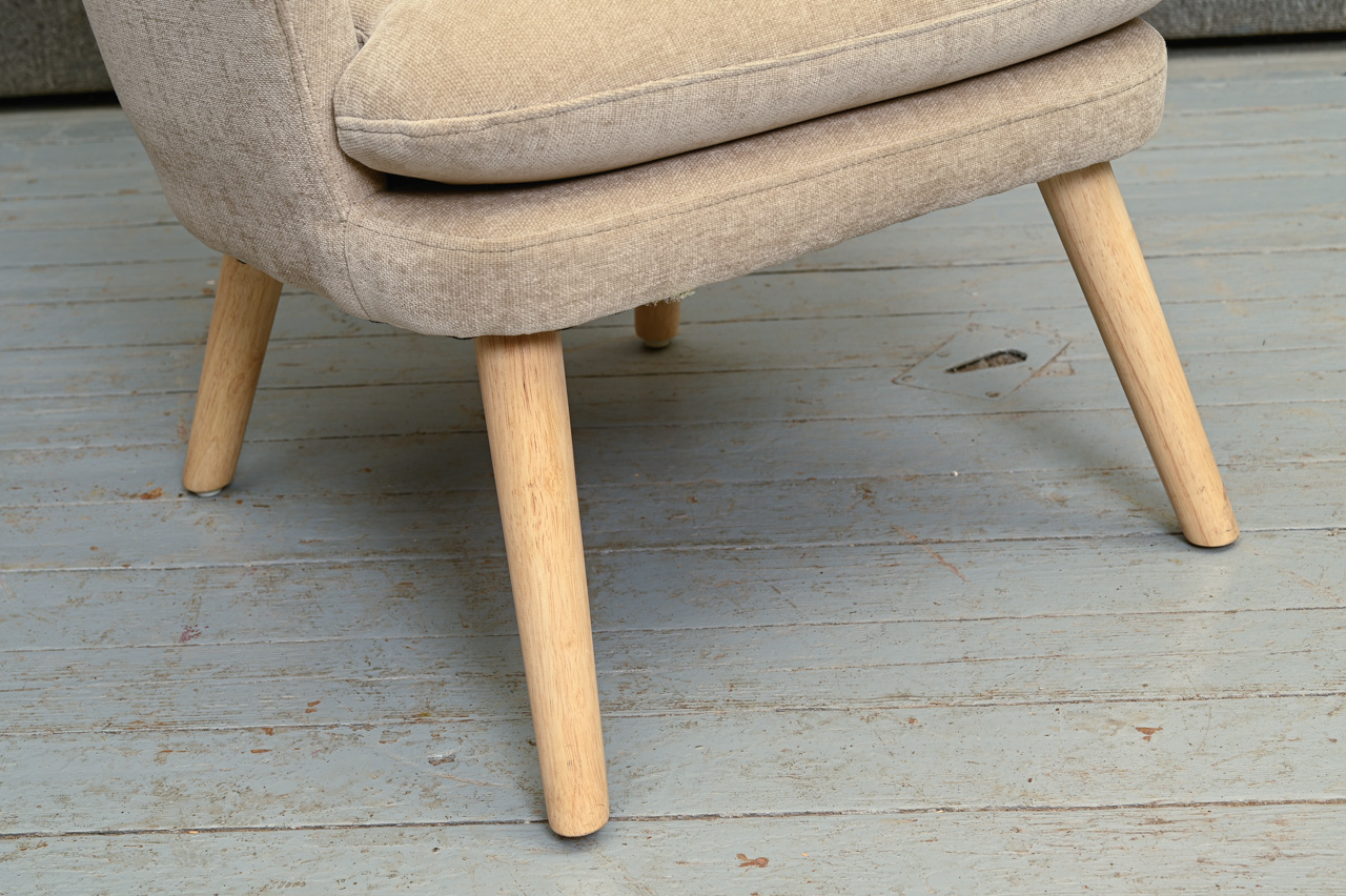 Atpūtas krēsls uz masīvkoka kājiņām, tapsēts ar bēšu, smilšu krāsas mēbeļu audumu. Nelietots, salikts. Kods 108335.