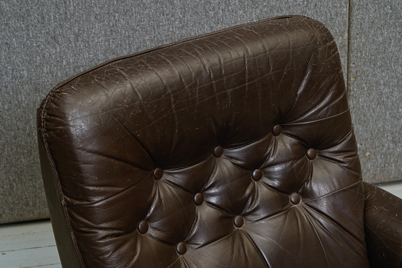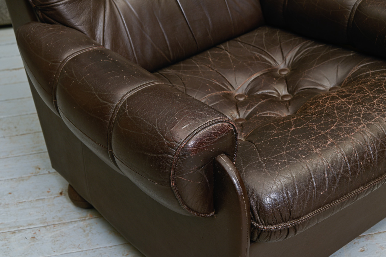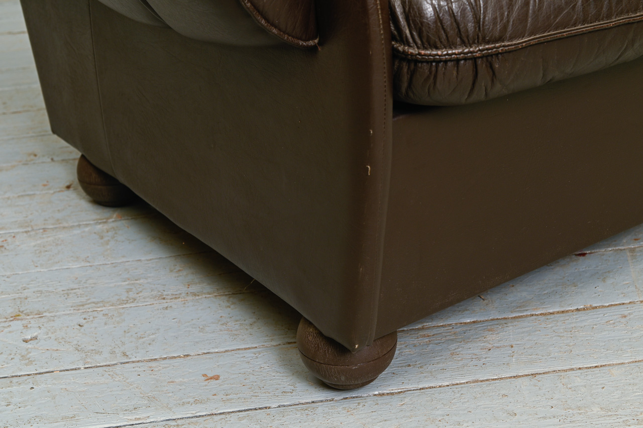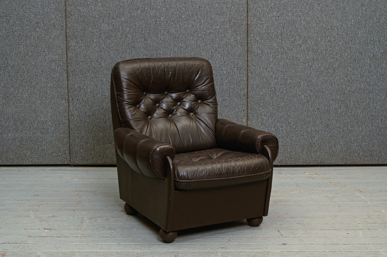 Mīkstais krēsls, tapsēts ar tumši brūnu dabīgo ādu. Kods 260038.