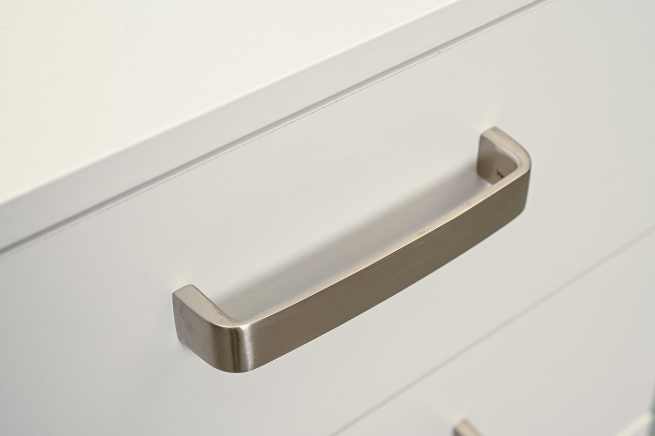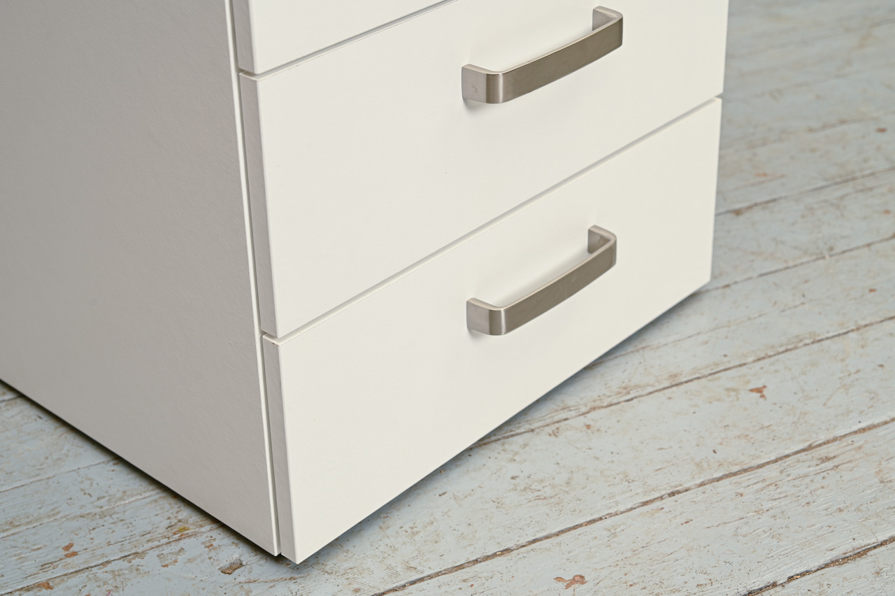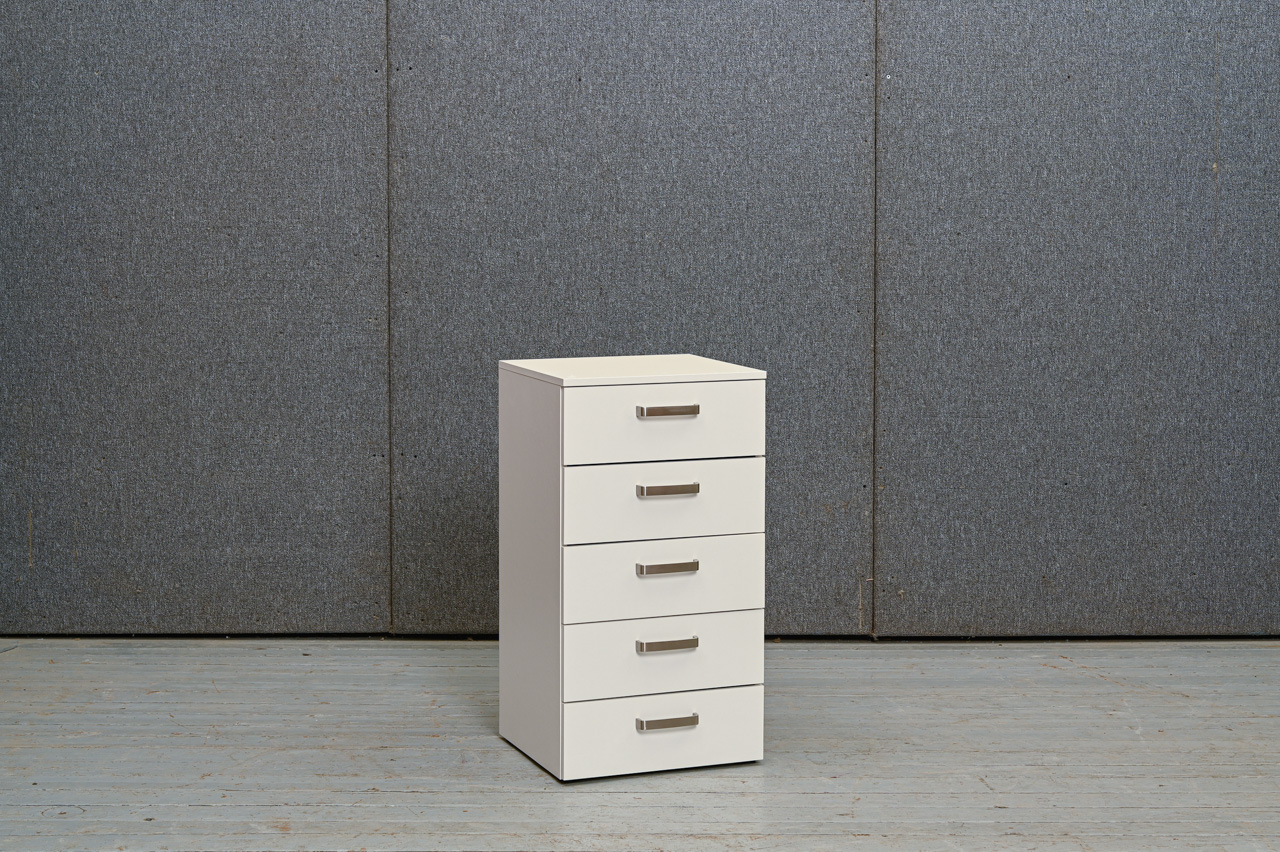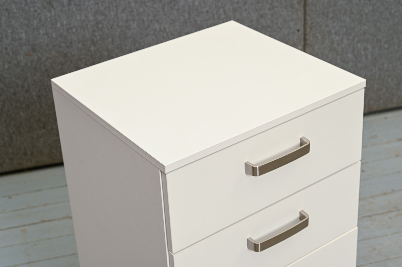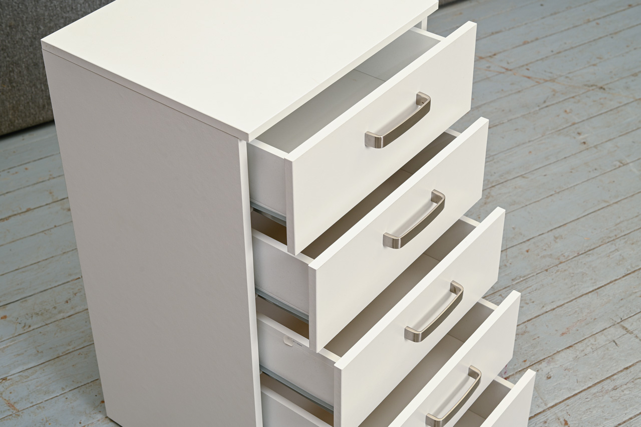 Balts kokskaidu plātnes atvilktņu bloks ar 5 atvilktēm un metāla furnitūru. Nelietots, salikts. Kods 408320.