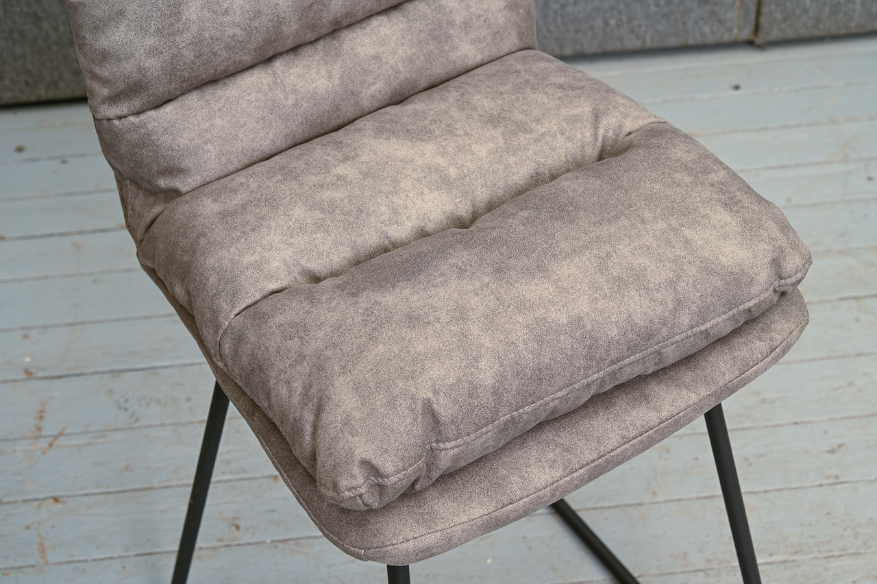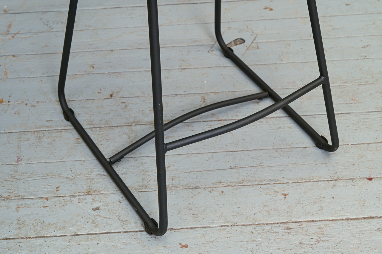 Bāra krēsls uz melnām metāla kājām ar kāju balstu, tapsēts ar pelēku mēbeļu audumu. Nelietots, salikts. Kods 108350.