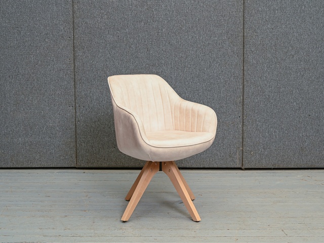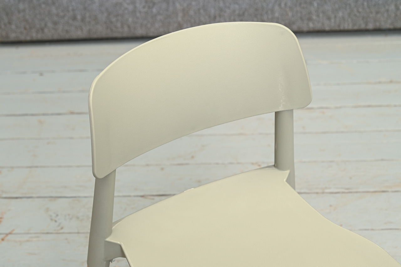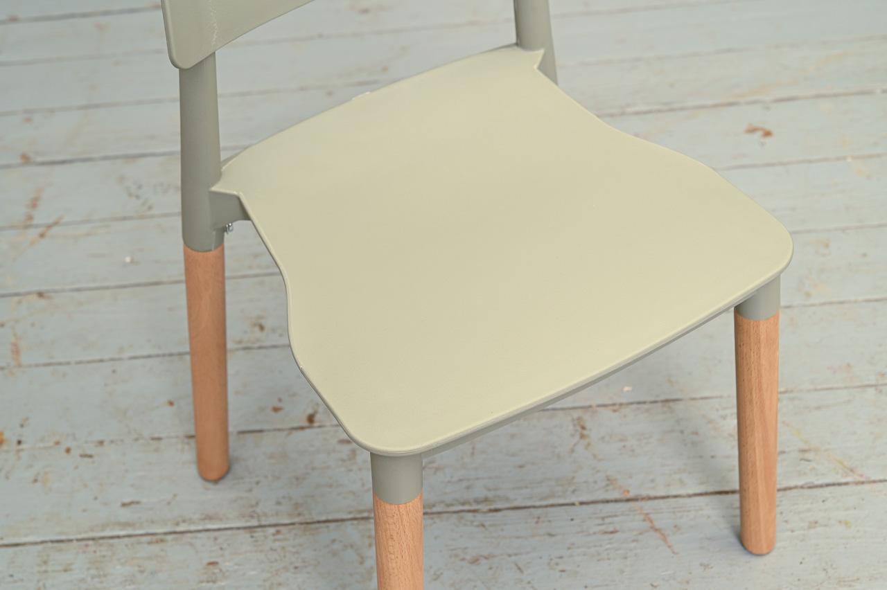 Pelēks plastmasa krēsliņš uz dižskābarža kājiņām. Nelietots, salikts. Kods 108376.