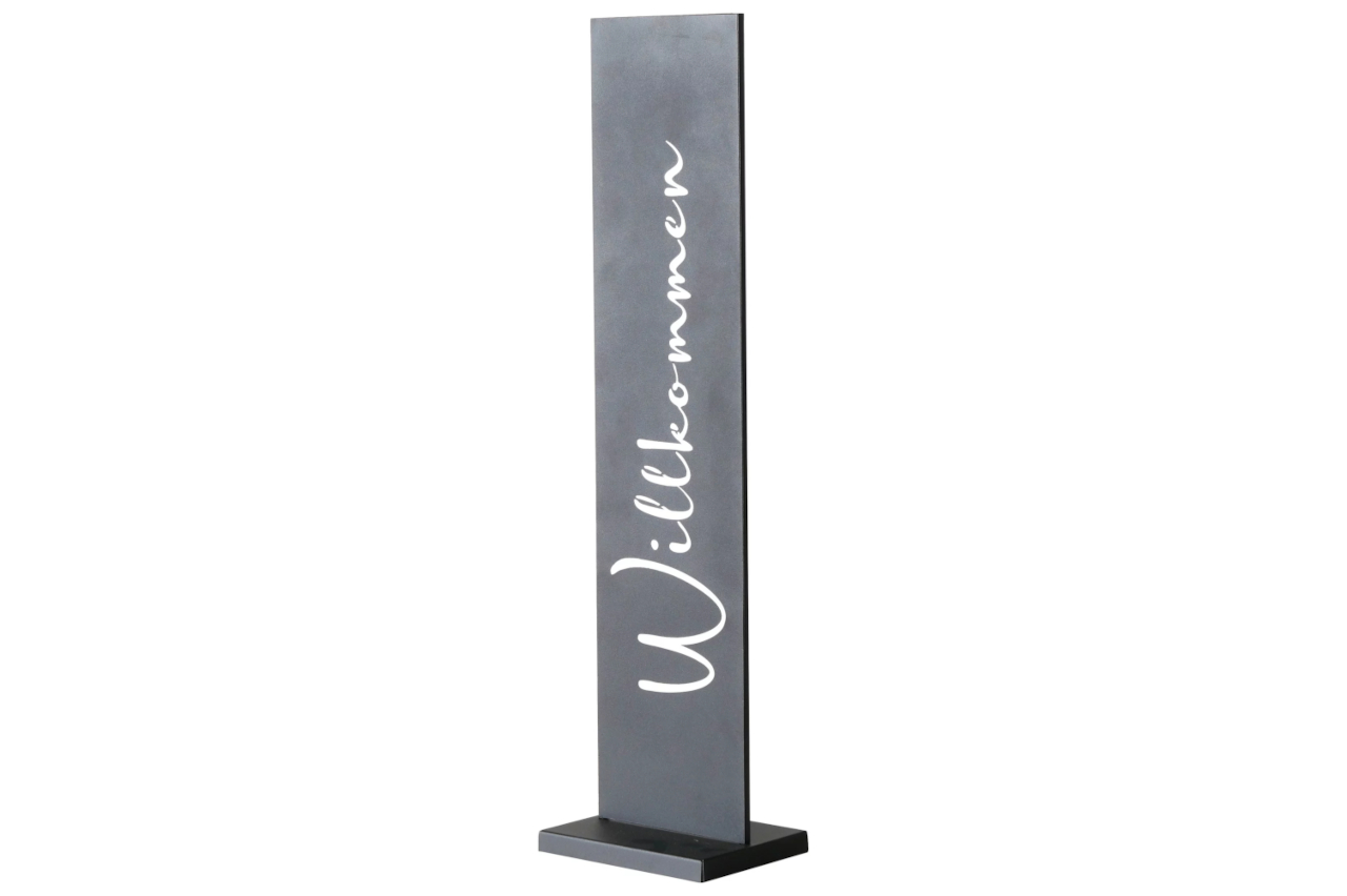 Melns, matēts metāla dekoratīvs statīvs ar izgrieztu uzrakstu "WILLKOMMEN" (vācu val. - laipni lūgti). Nelietots. Kods 808327.