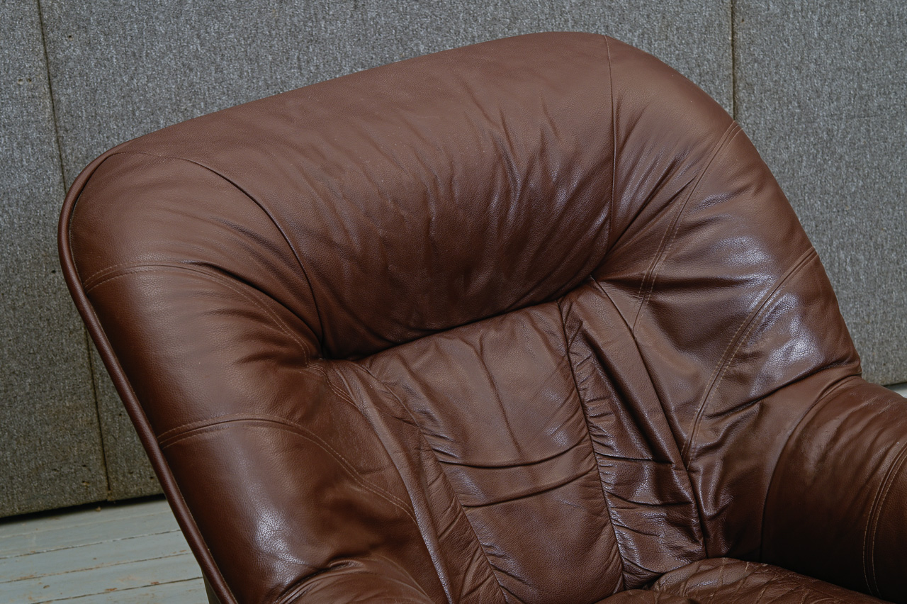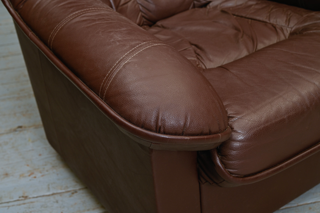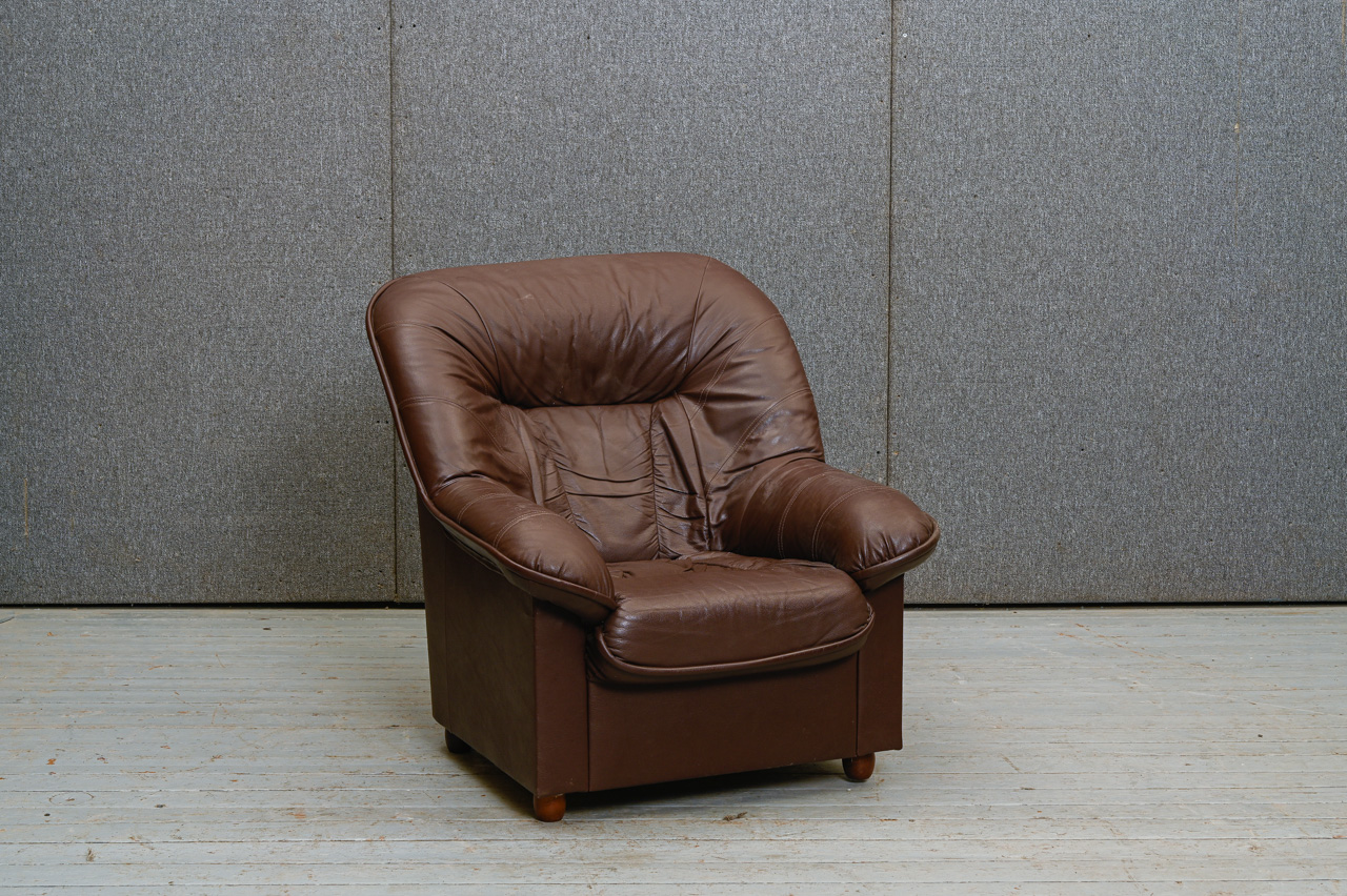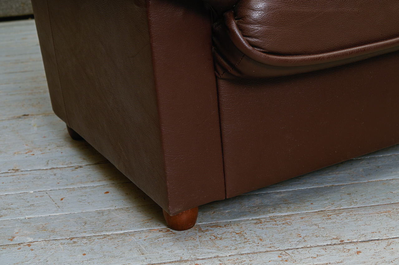 3vietīga dīvāna (kods 660043) un mīkstā krēsla (kods 260042) komplekts. Tapsēti ar tumši brūnu dabīgo ādu. Fasāde zem sēdvirsmas, sāni un aizmugure ar ādas imitācijas tapsējumu. Komplekta kods 660043k.