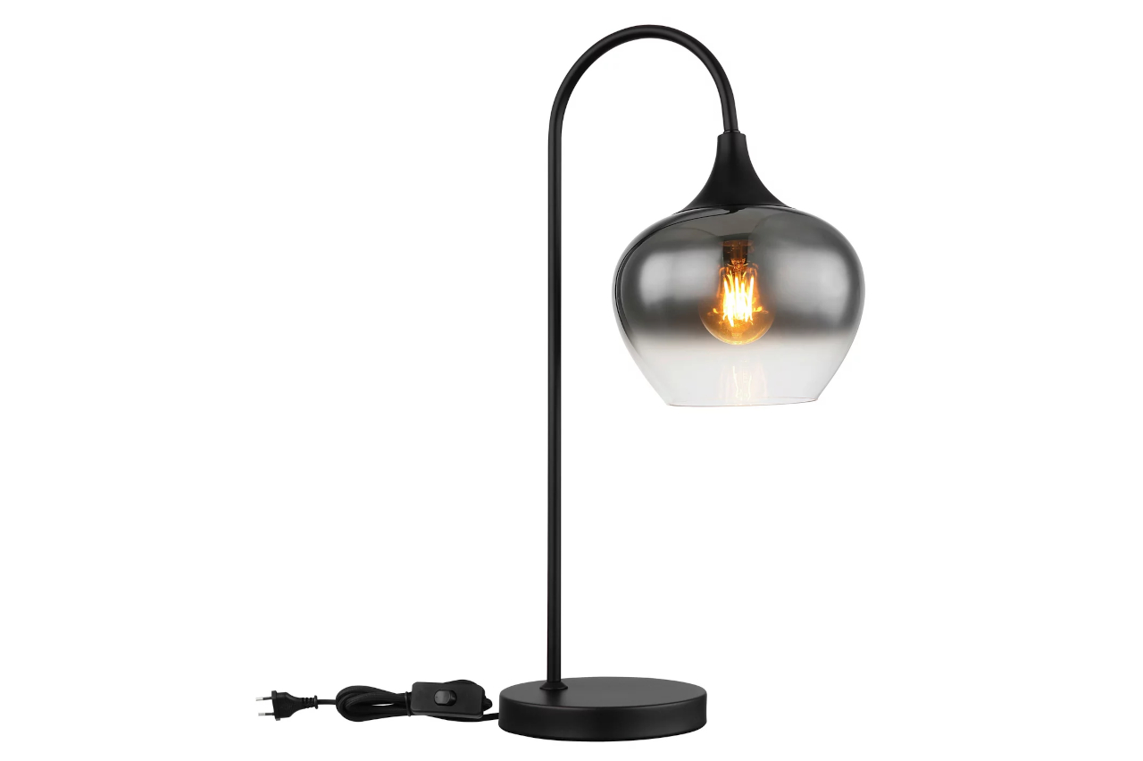 Melna, matēta metāla galda lampa ar tonēta stikla kupolu. Kupola apkārtmērs 60cm. Spuldzes atveres diametrs 18cm. Lampas ieslēgšana/izslēgšana ar kabelī iestrādātu slēdzi. Paredzēta lietošanai iekštelpās. Spuldze nav iekļauta komplektā. Nelietota, bez iepakojuma. Kods 708415.
