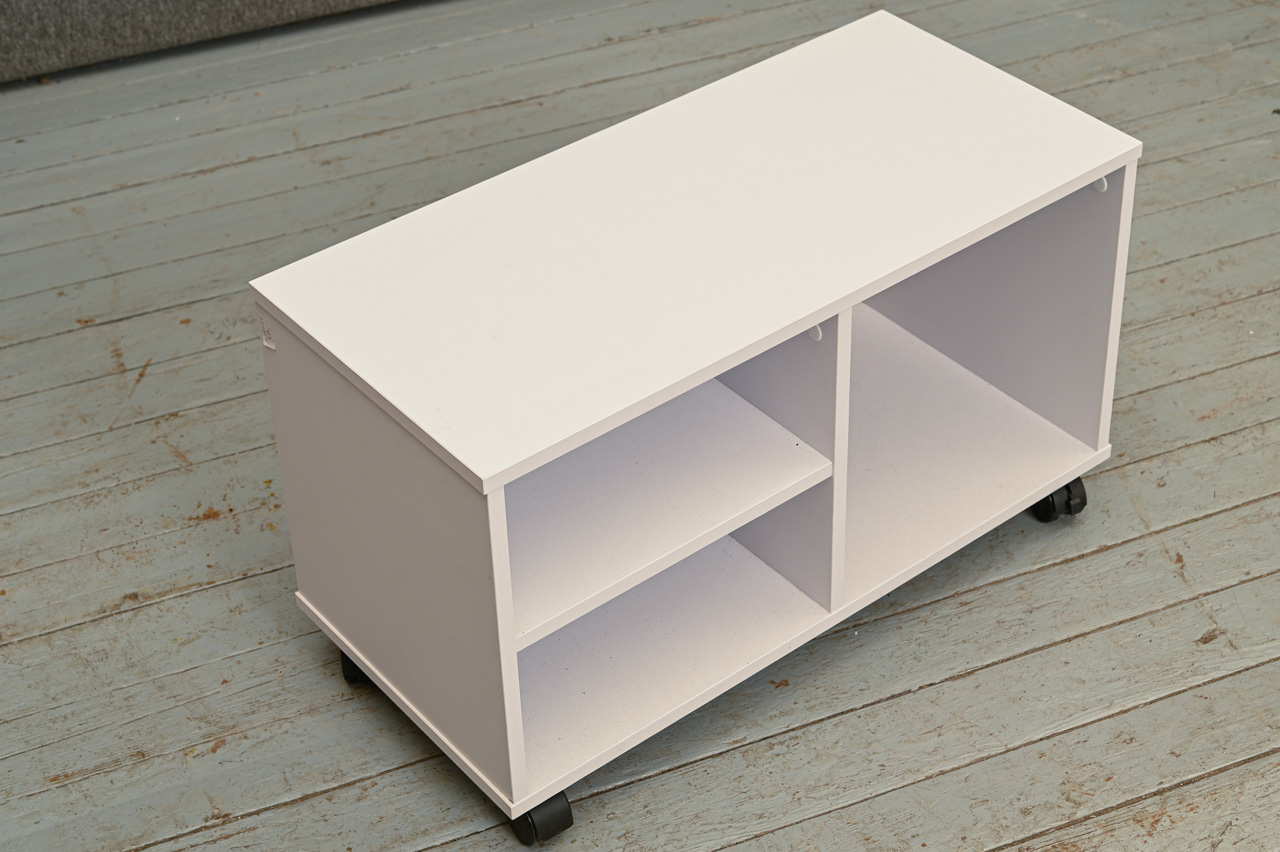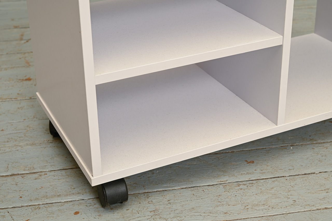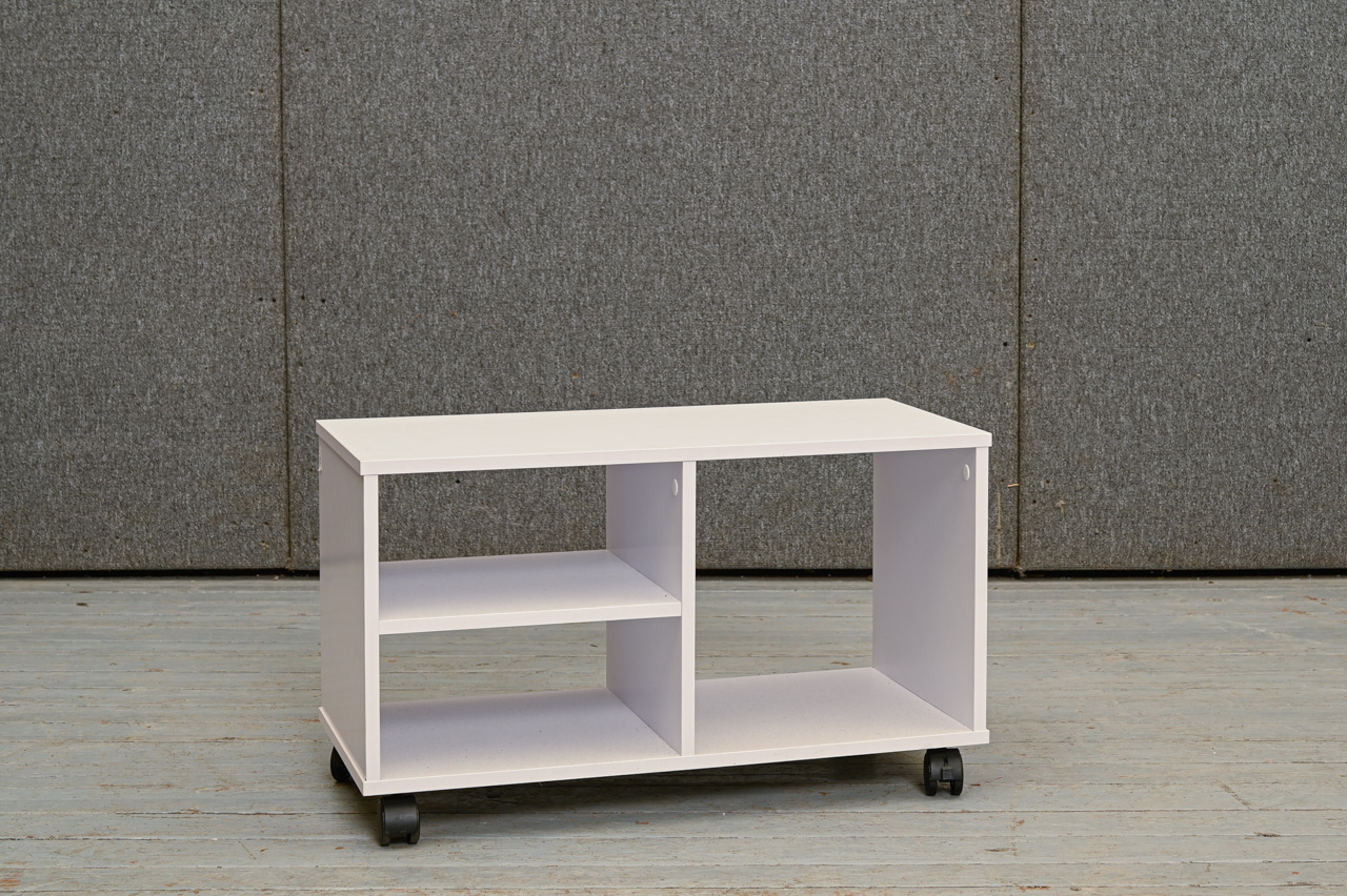 Balts kokskaidu plātnes galdiņš - plauktiņš uz riteņiem. Nelietots, salikts. Kods 308321.