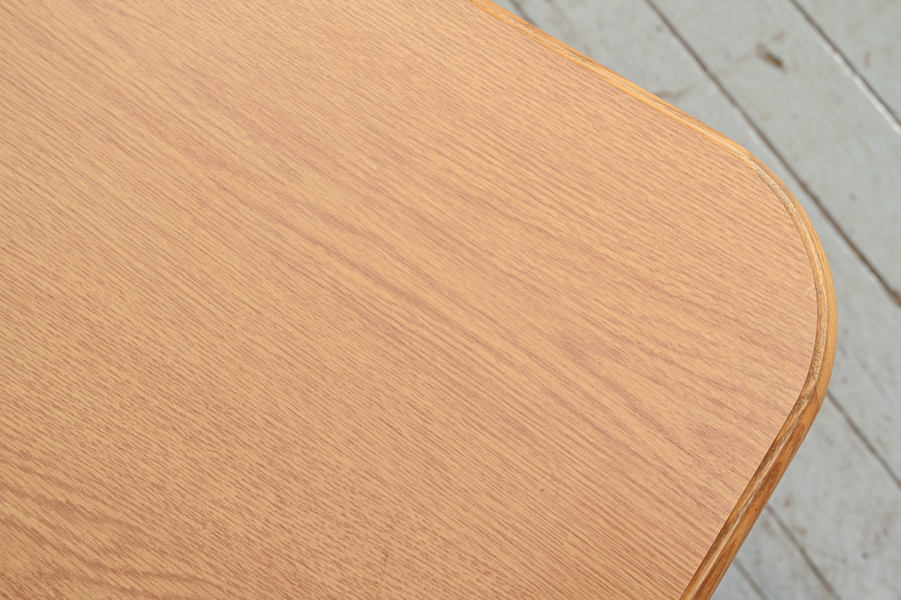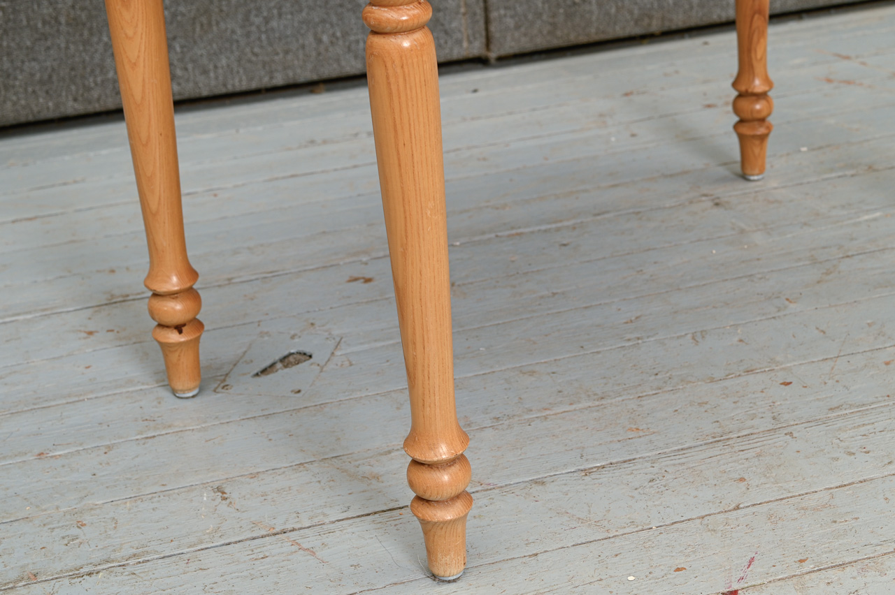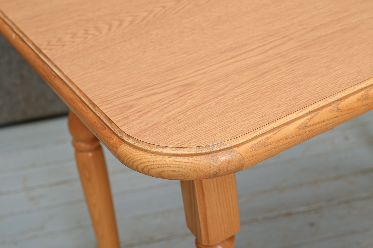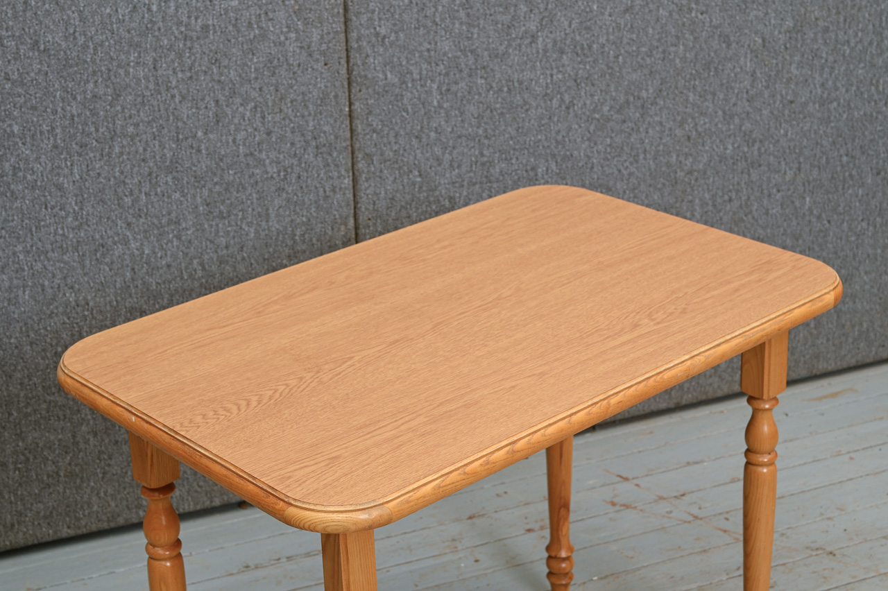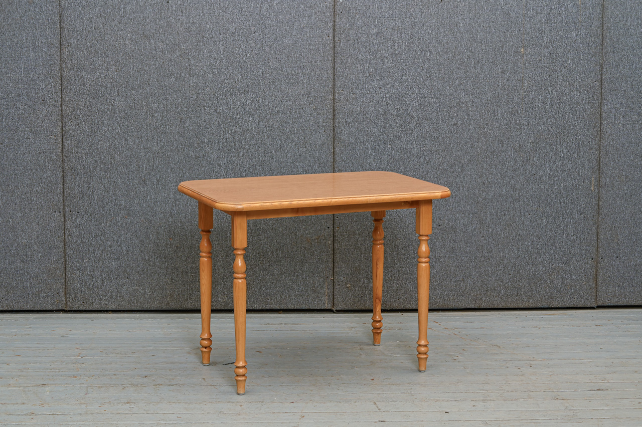 Neliels galdiņš uz virpotām masīvkoka kājām. Ar koka imitāciju laminētas kokskaidu plātnes virsma. Kods 360120.