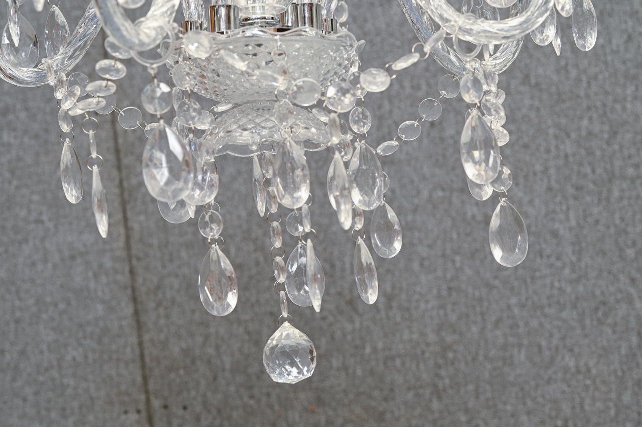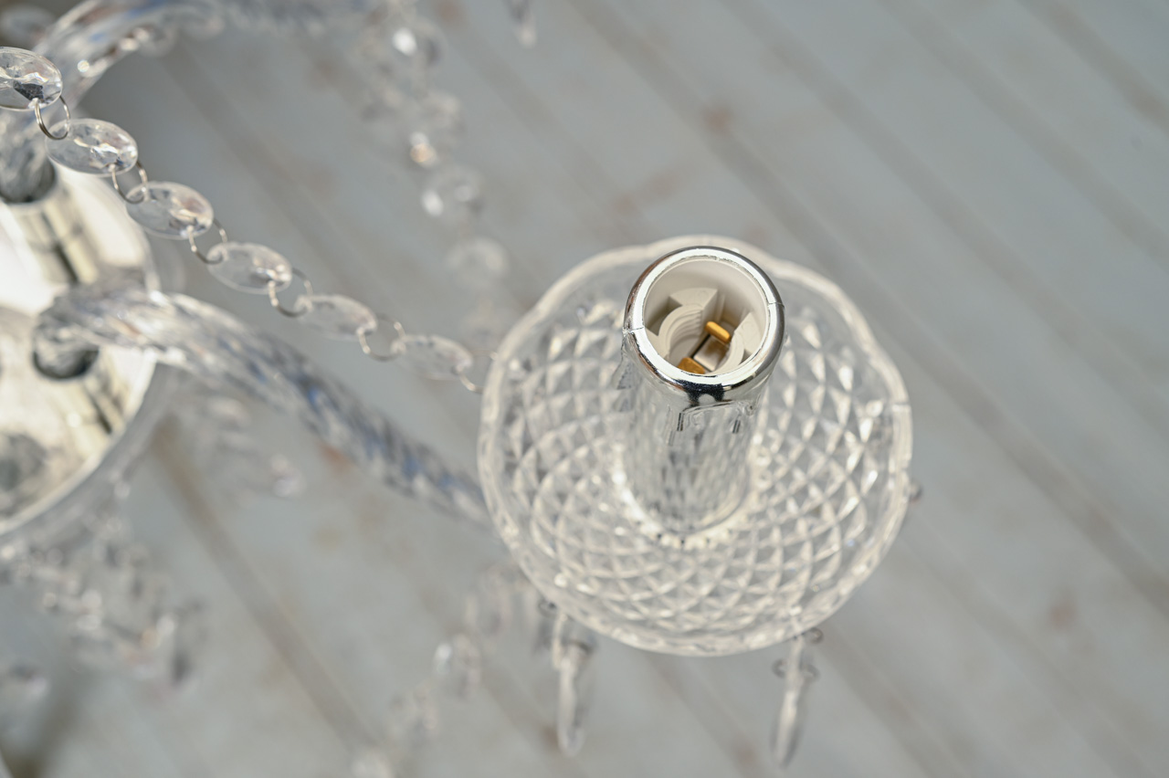 Kristāla imitācijas griestu lampa ar caurspīdīgām akrila un hromētām plastmasa detaļām. Lampa paredzēta 5 E14 spuldzēm ar maksimālo jaudu 40W. Lampa ir paredzēta lietošanai iekštelpās. Nelietota. Kods 708407. 1 saliktā veidā, pārējās izjauktā veidā ražotāja iepakojumā.