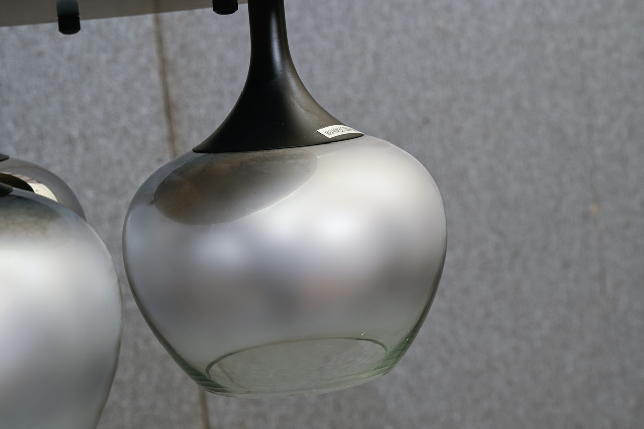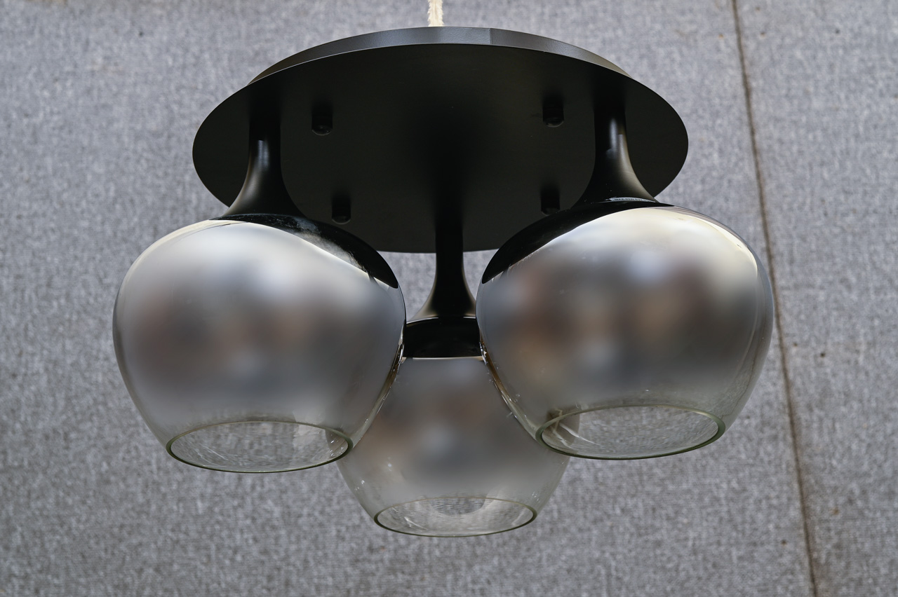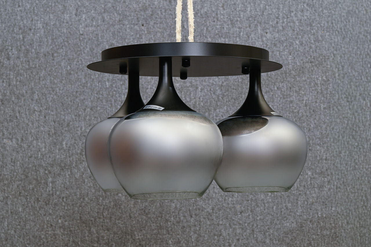 Griestu lampa ar apaļu, melni krāsotu metāla pamatni ar pelēki tonētiem, caurspīdīgiem stikla kupoliem ar spoguļa pārklājumu. Nelietota, ražotāja iepakojumā. Kods 708417.
