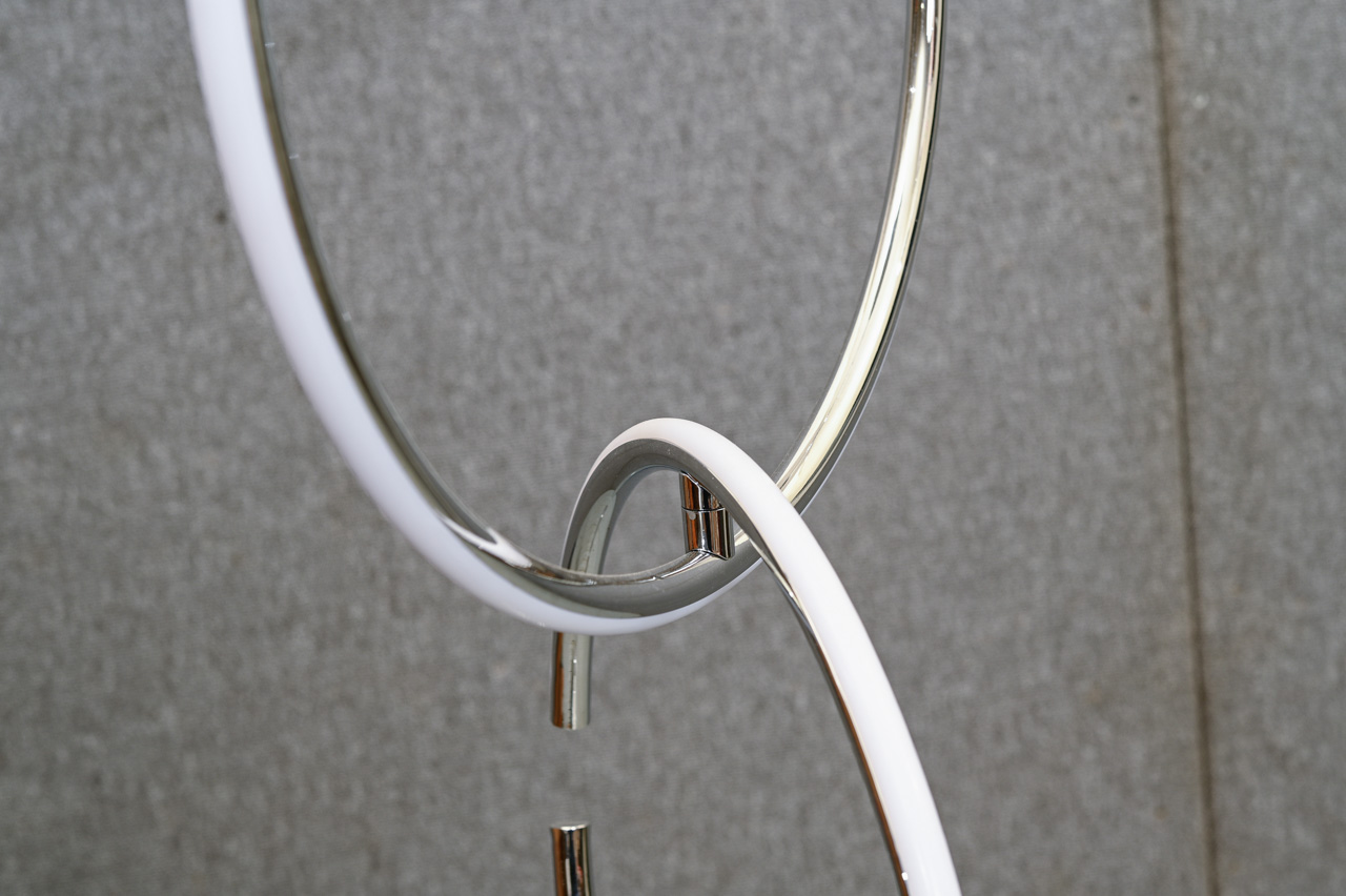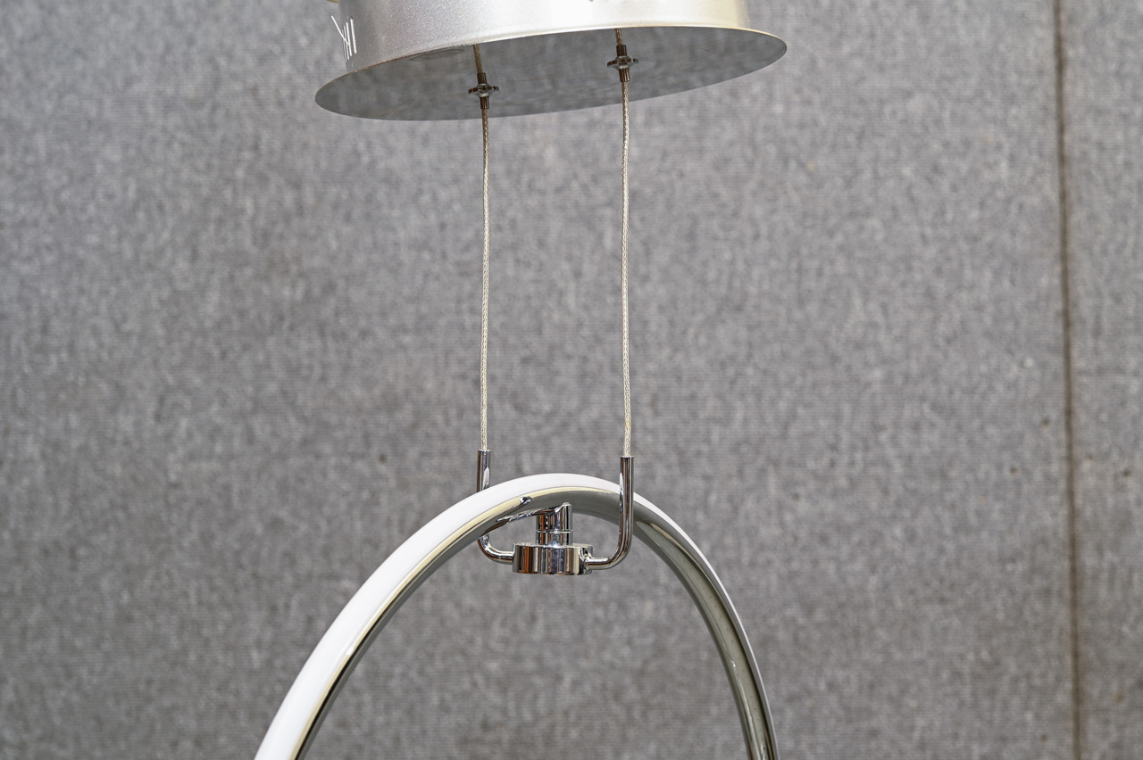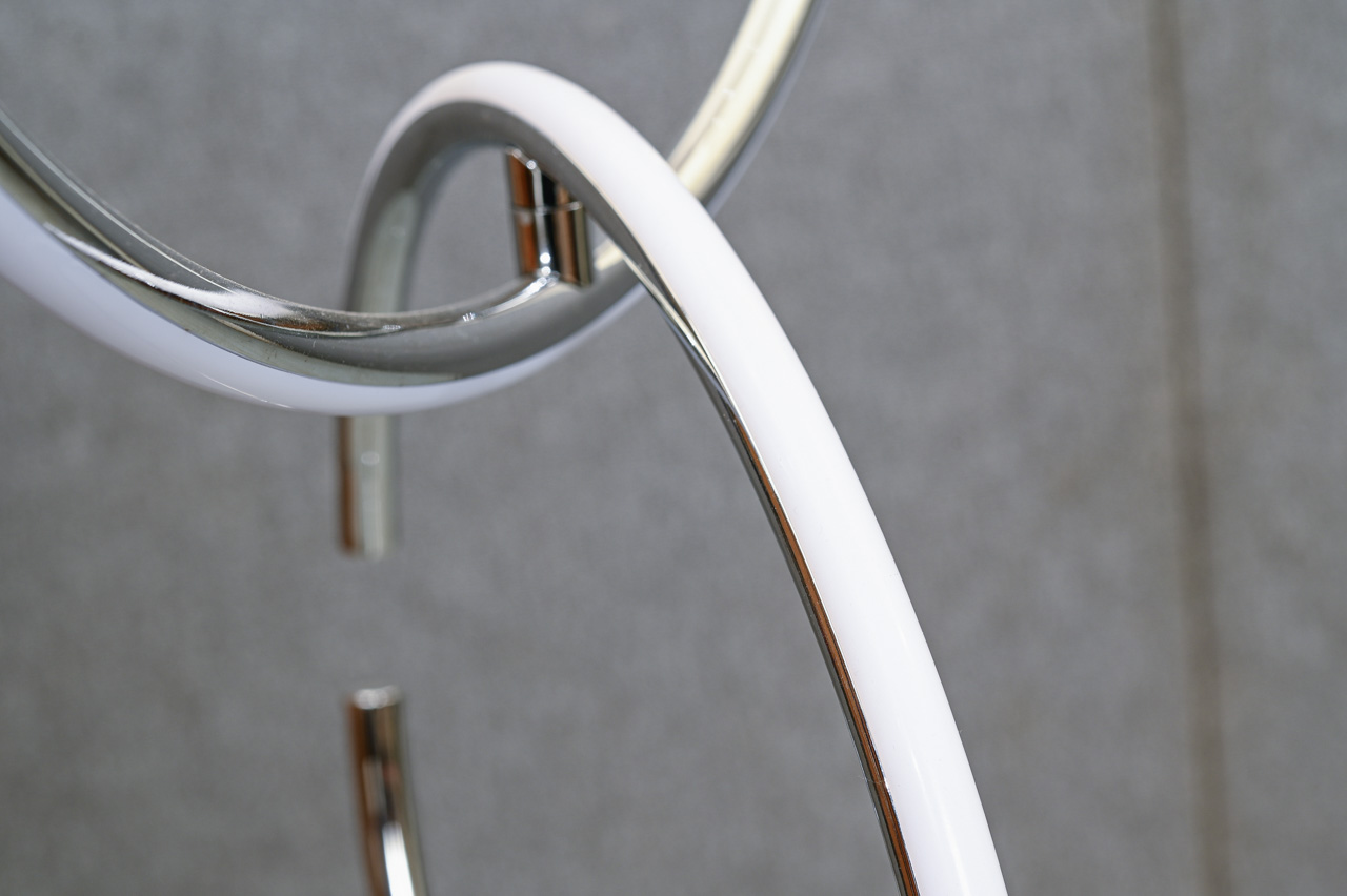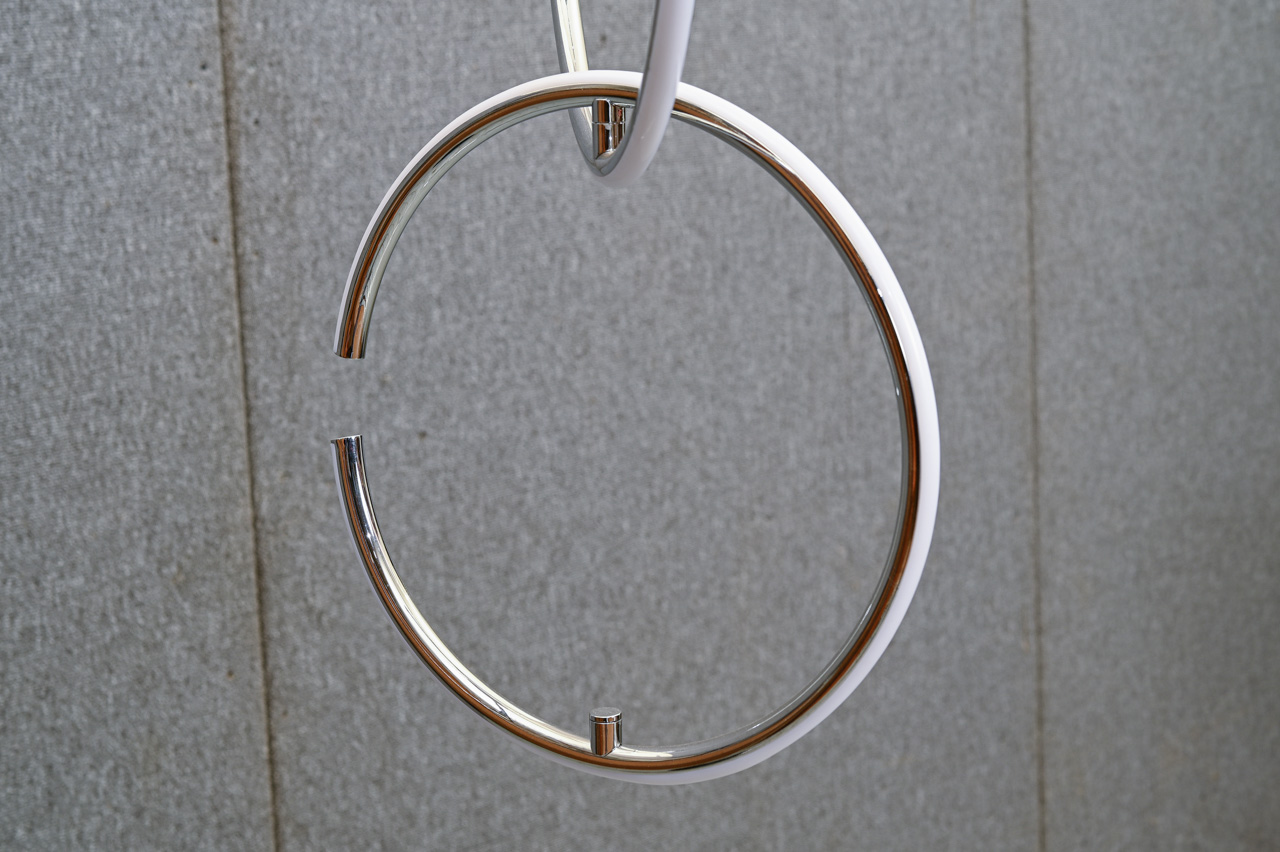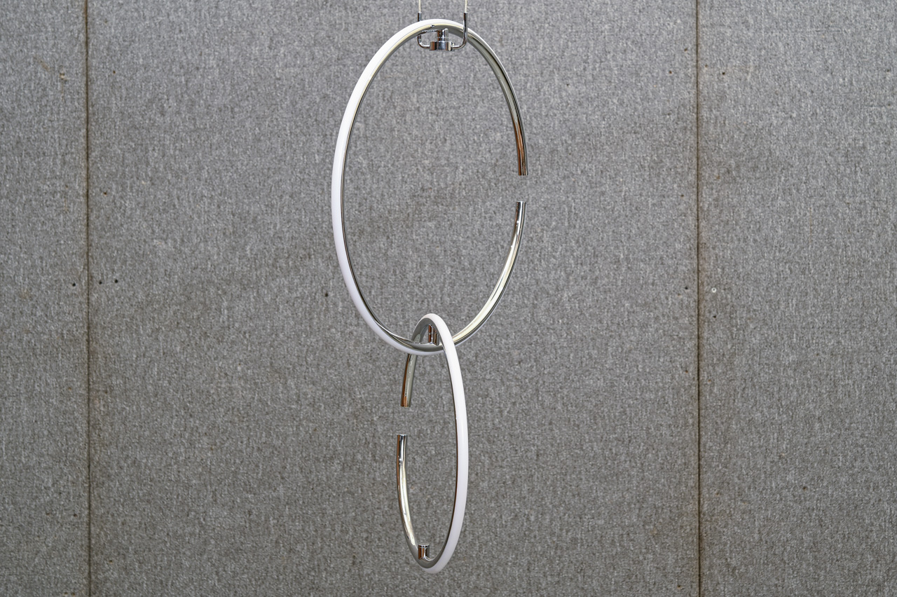 Griestu lampa ar trosēs iekarināmiem, ar magnētu stiprināmiem gredzena tipa LED gaismekļiem. Komplektā pults ar iespēju ieslēgt, izslēgt apgaismojumu unmainīt gaismas intensitāti. Gredzenus iespējams mainīt vietām. Gredzenu Ø42cm un Ø34cm. Nelietots, salikts. Kods 708418.