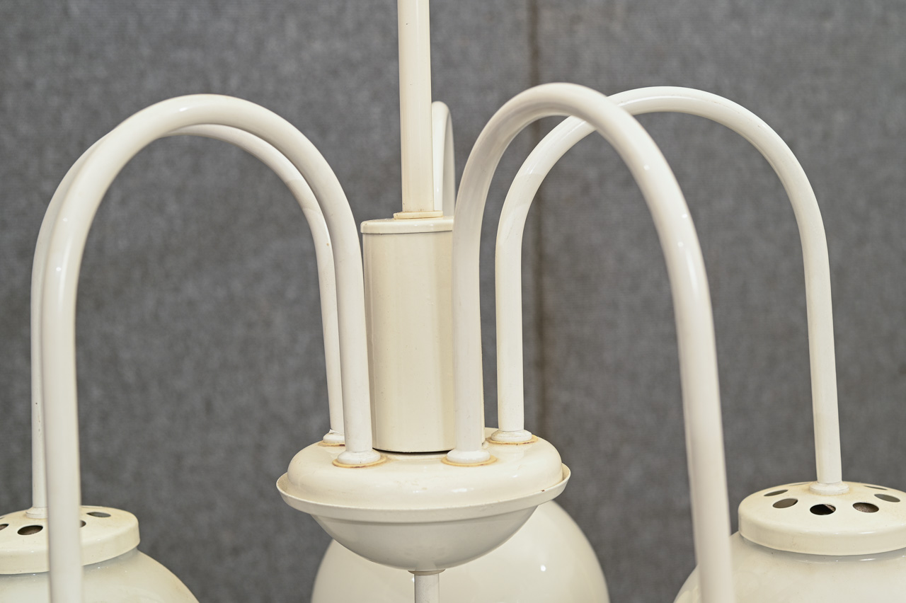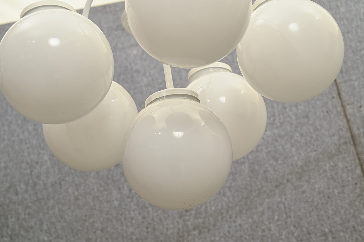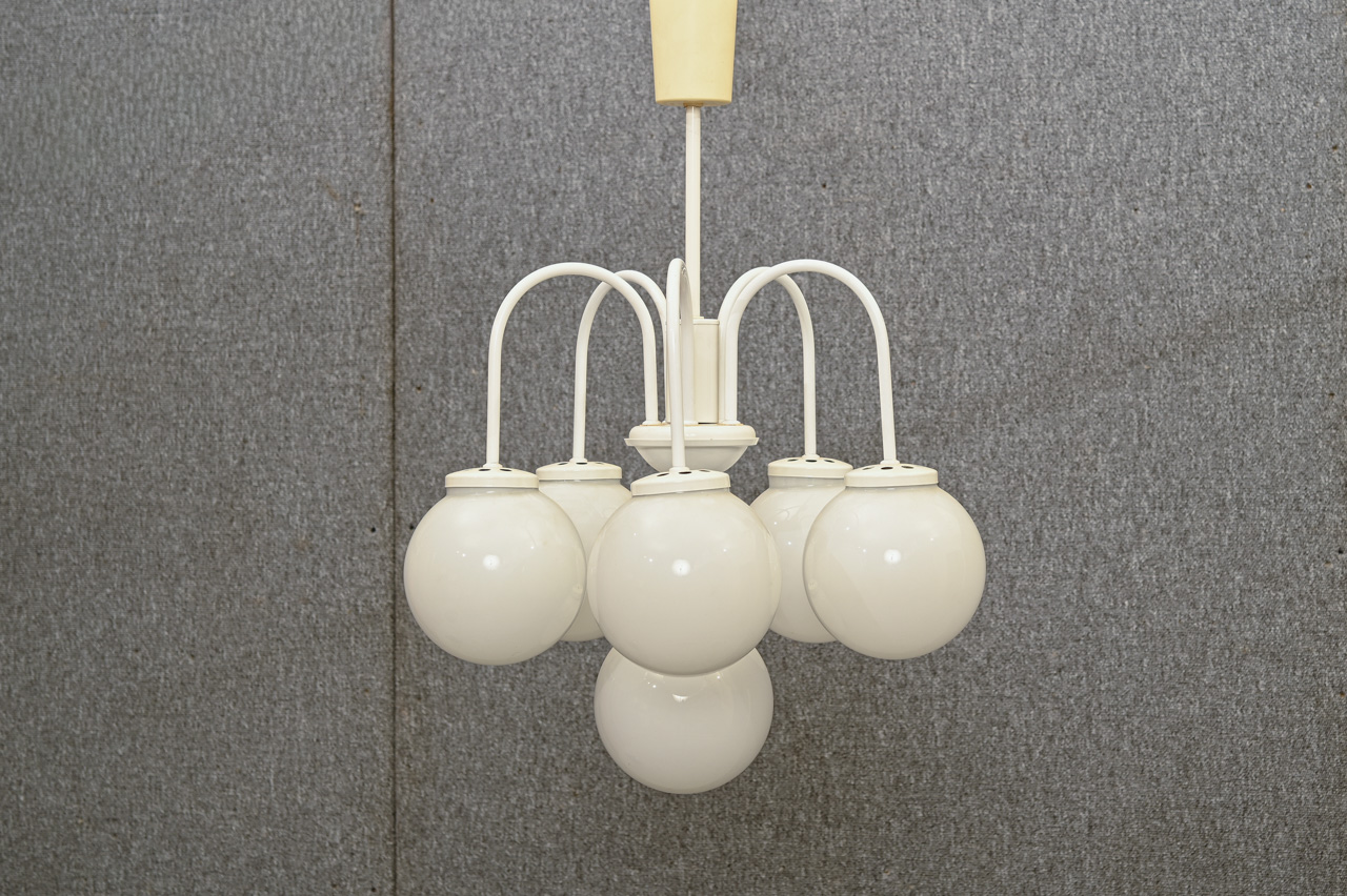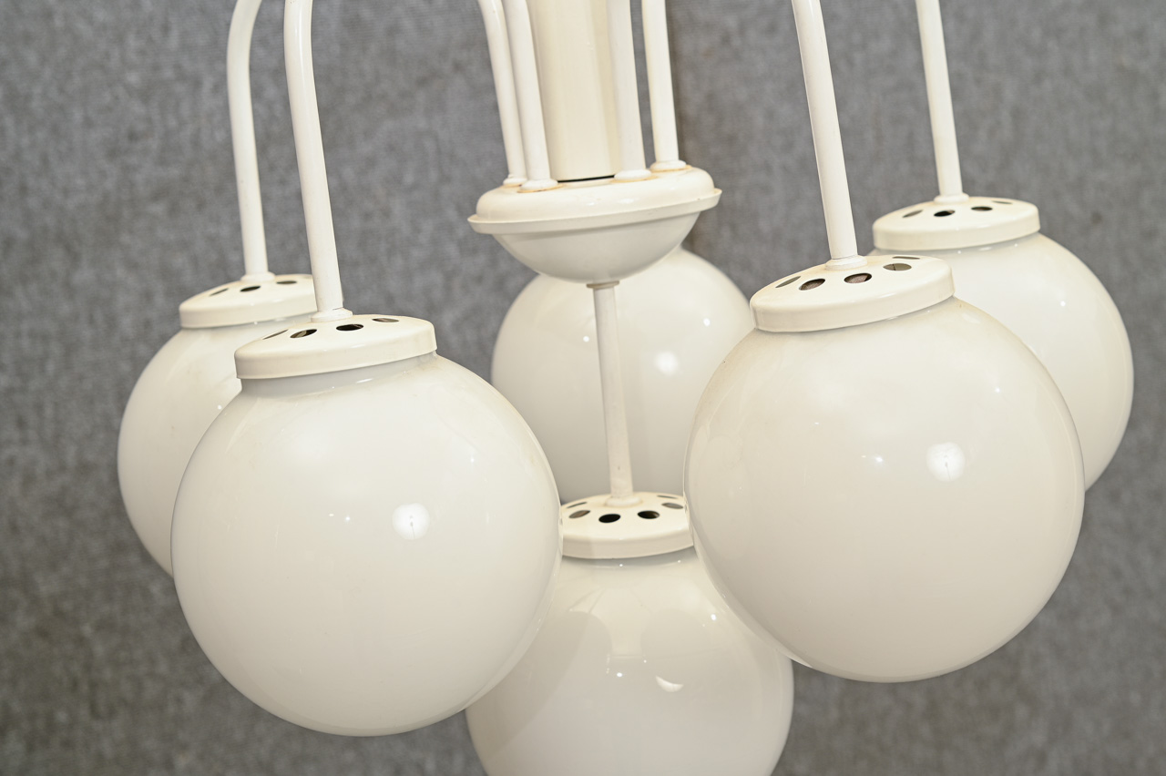 Griestu lampa ar 6 baltiem, apaļiem stikla kupoliem. Kupola apkārtmērs ~56cm. Kods 860153. Pieejama līdzīga griestu lampa, kods 860153B.