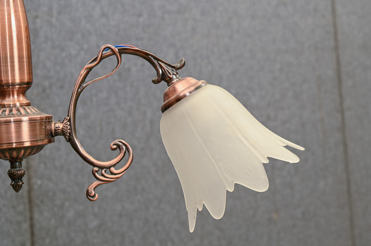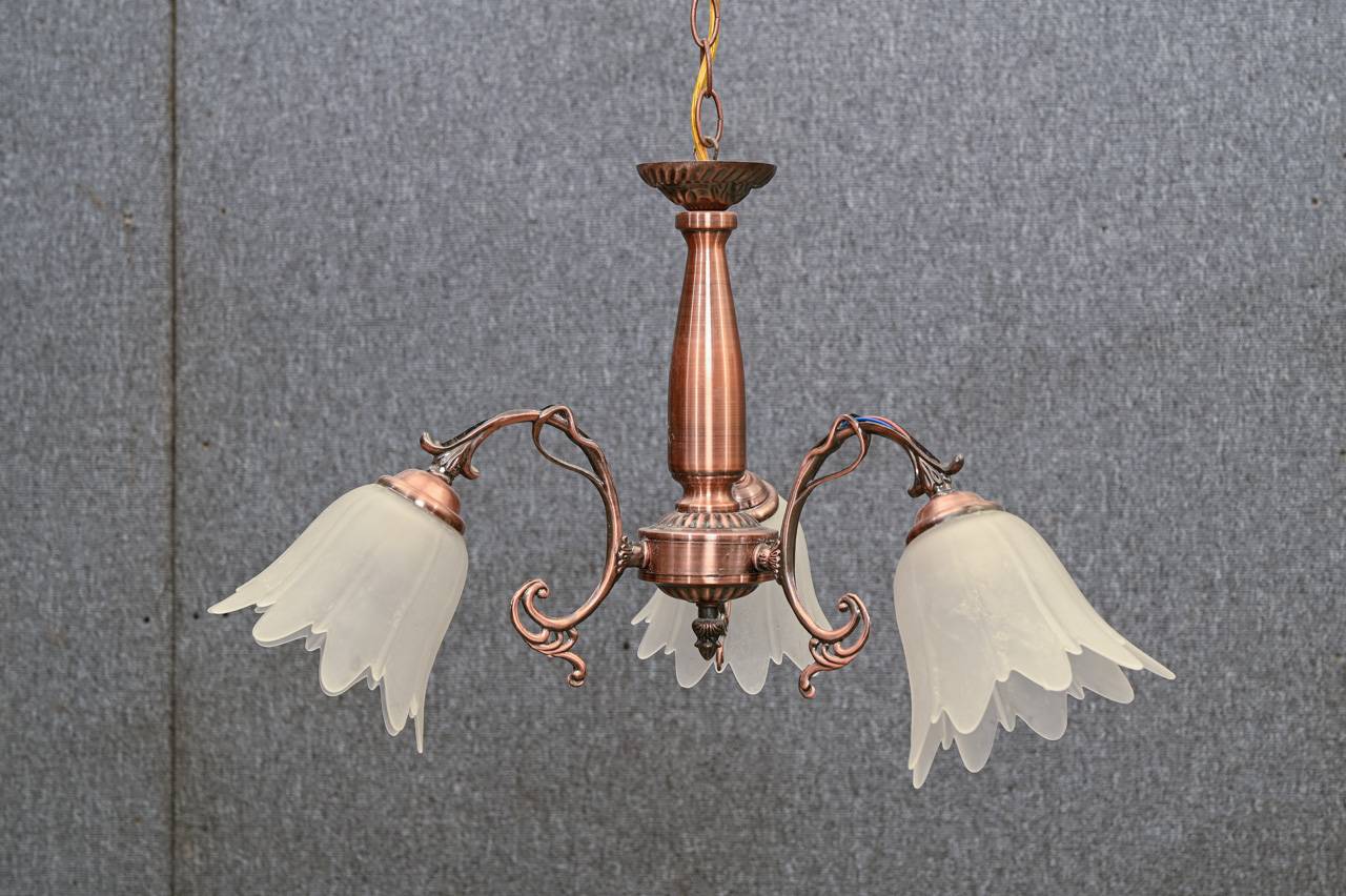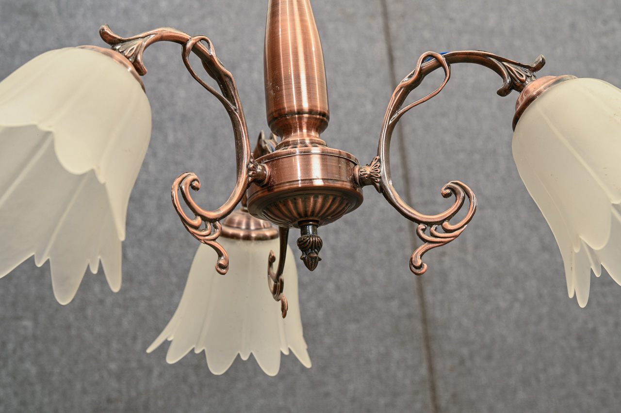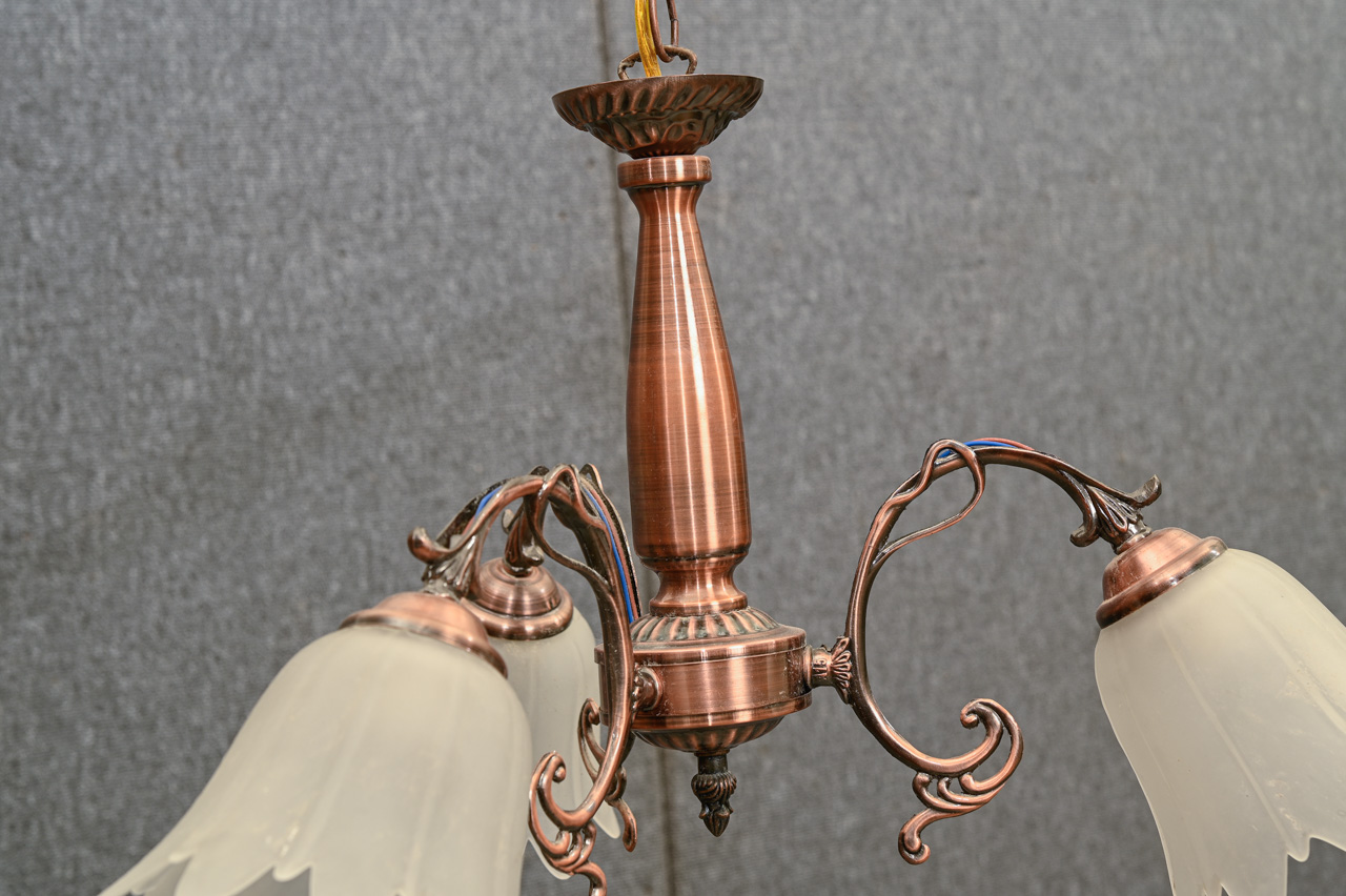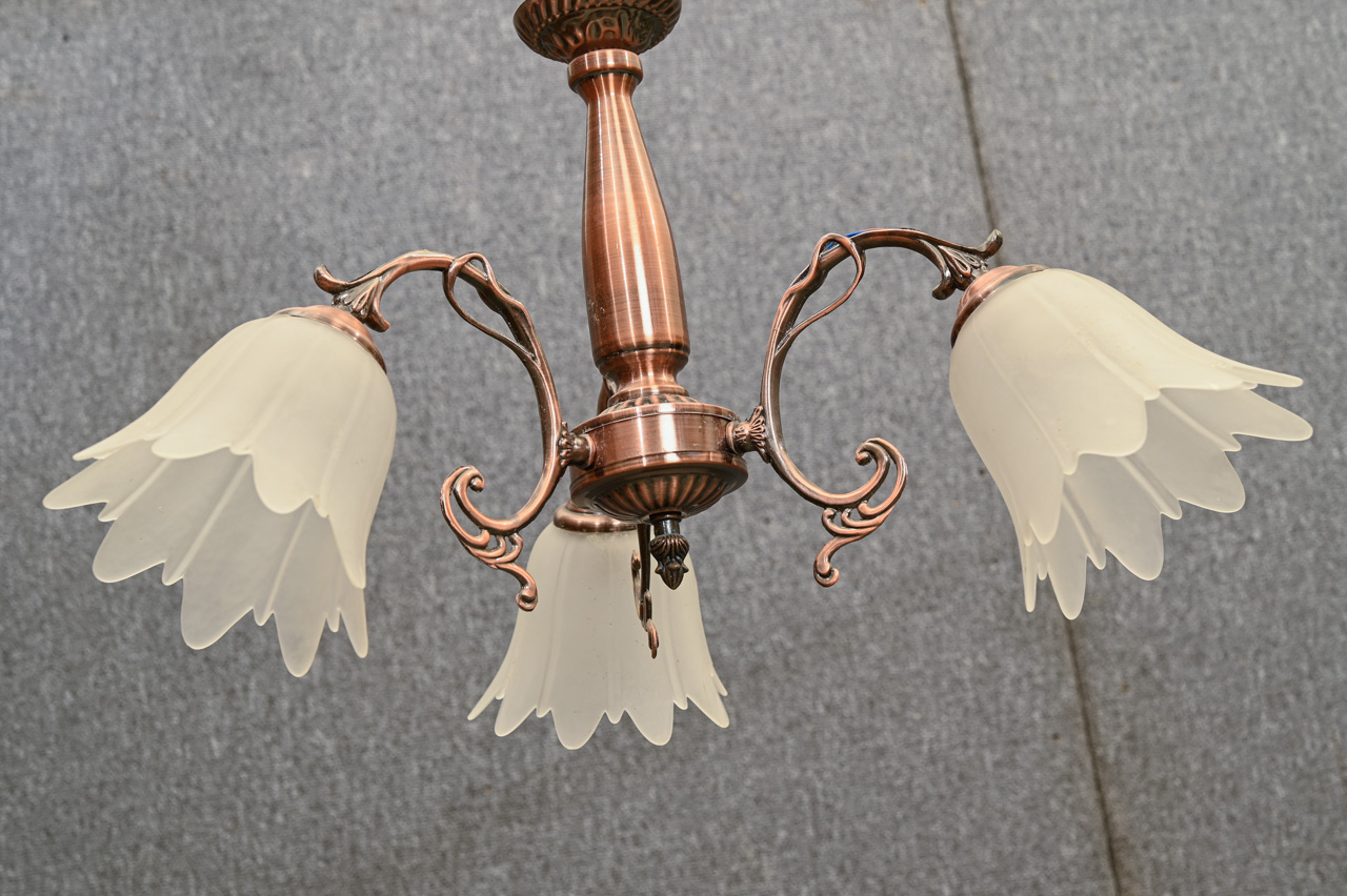 Griestu lampa ar vara krāsas detaļām. 3 matēta stikla kupoli. Kupola platums 15cm. Kods 860176.
