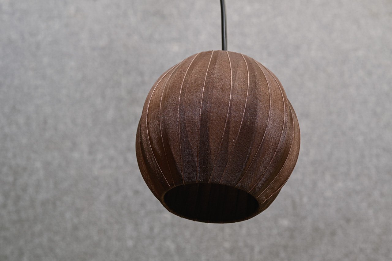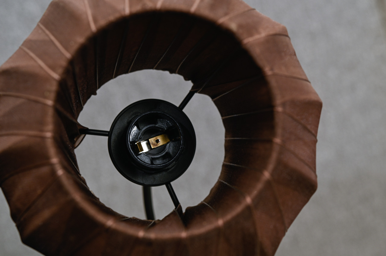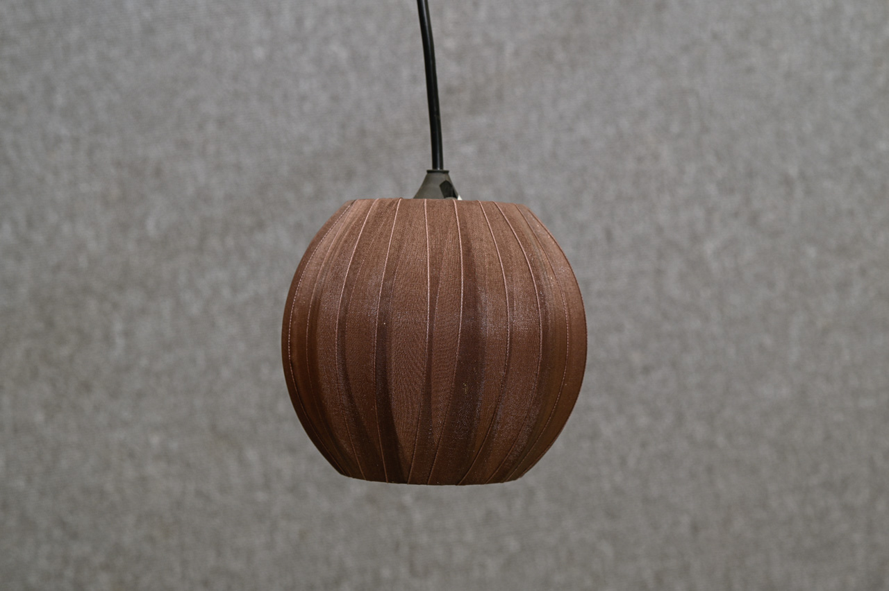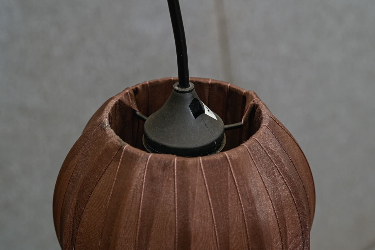 Griestu lampa ar nelielu, brūna auduma abažūru Abažūra apkārtmērs 46cm, augstums 13cm.. Kabelis bez kontaktdakšas, garums ~1m. Kods 860195.