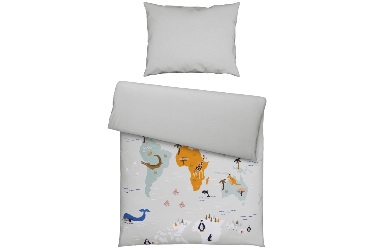 Kokvilnas gultas veļas komplekts ar rāvējslēdzēja aizdari. Komplektā 1 spilvendrāna 80x80cm un segas pārvalks 135x200cm. Nelietots, ražotāja iepakojumā. Kods 708355.