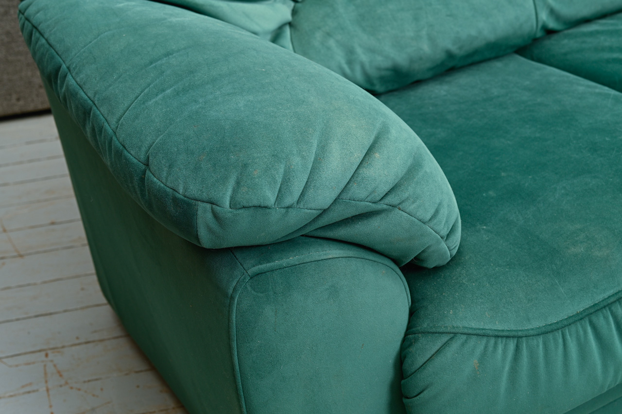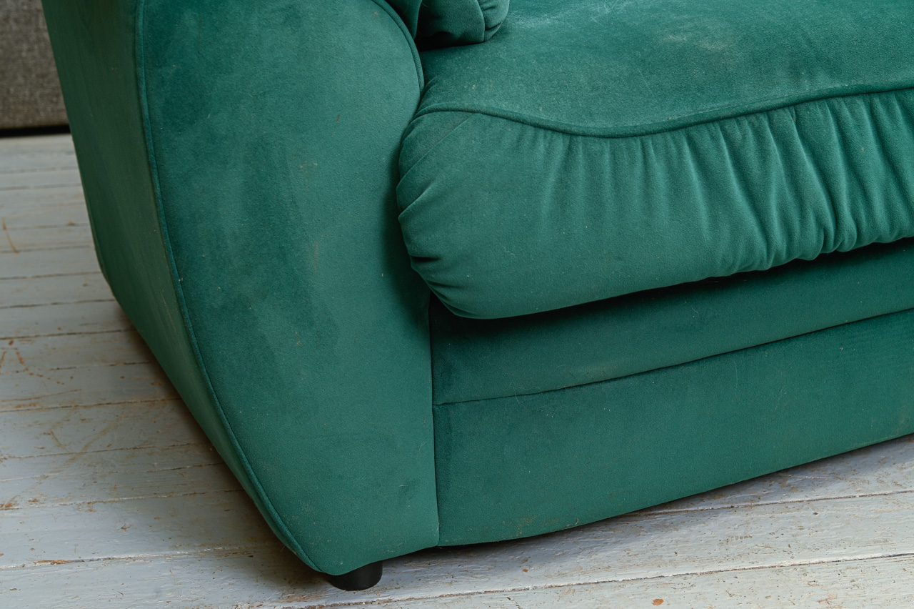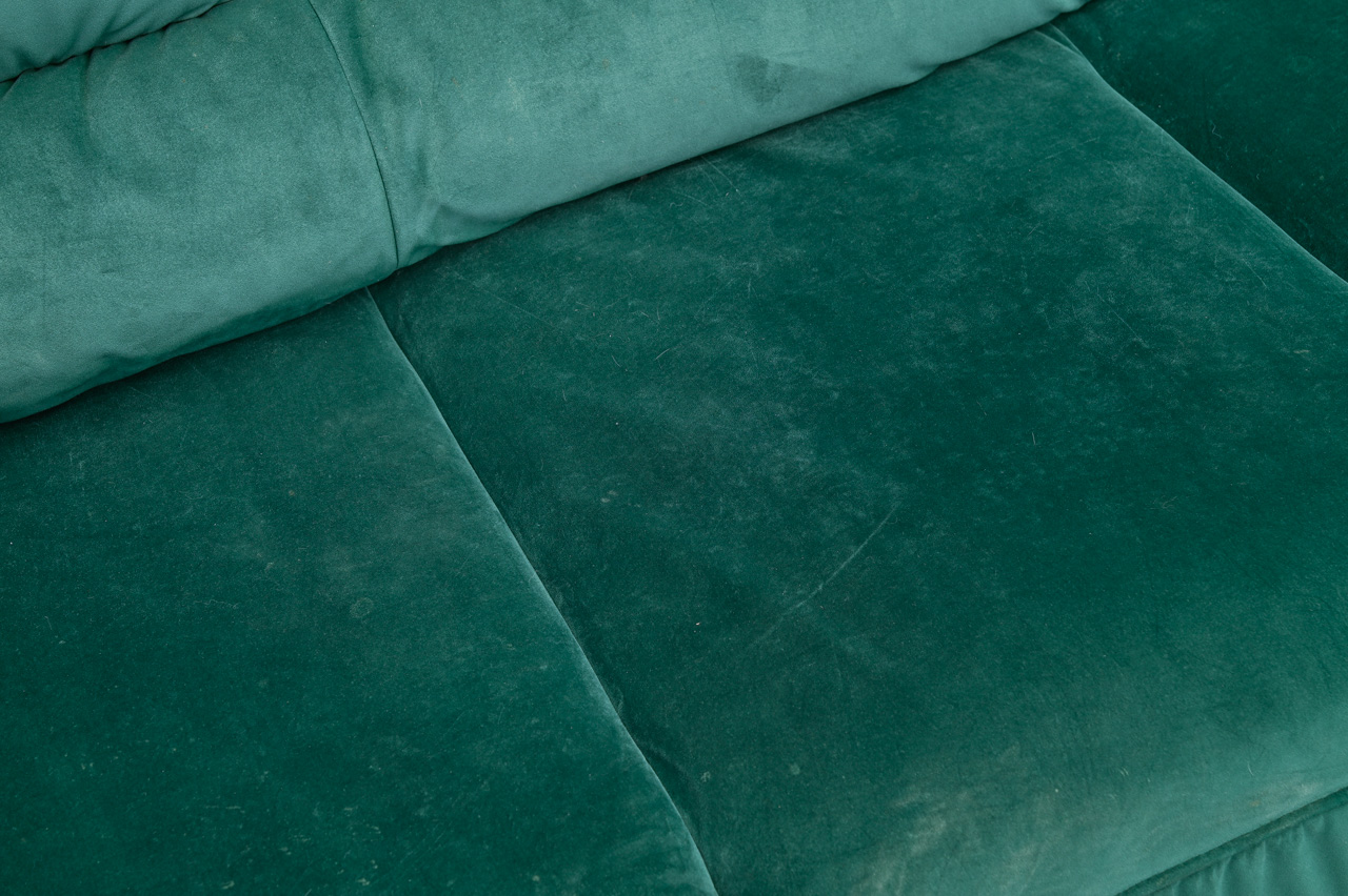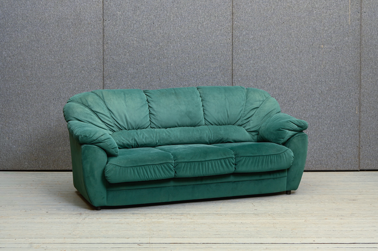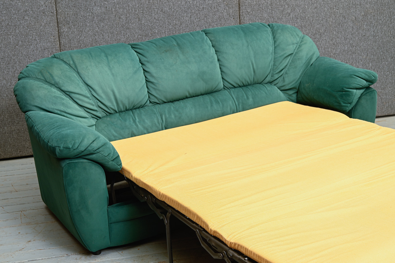 Izlaižams 3vietīgs dīvāns, tapsēts ar zaļu samtainu audumu. Zem dīvāna sēdvirsmas Iestrādāts izvelkams mehānisms ar matraci. Guļamā platība 139x180cm. Kods 560039.