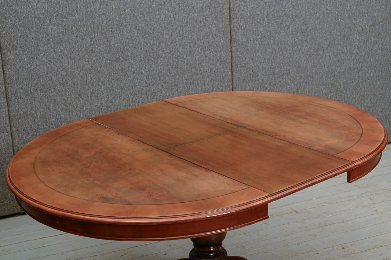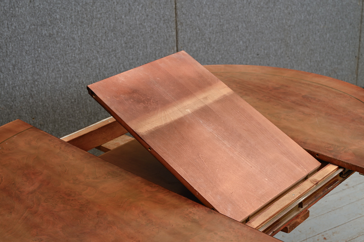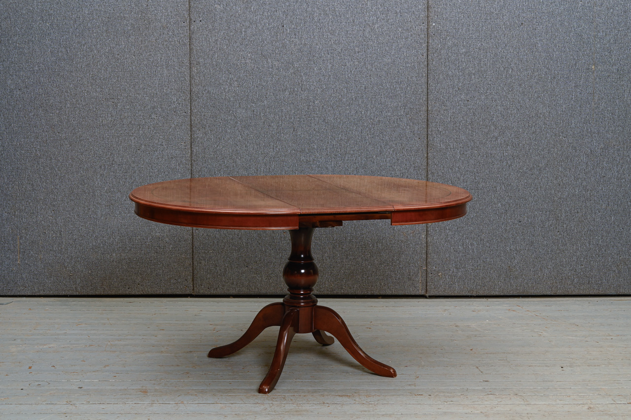 Galds uz masīvkoka kājas ar apaļu MDF virsmu ar dabīga koka finierējumu. Komplektā zem galda virsmas uzglabājama 38cm plata pagarināmā plāksne. Galda garums izvilktā veidā 147cm. Kods 303120.