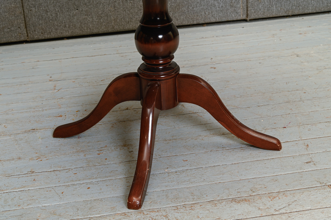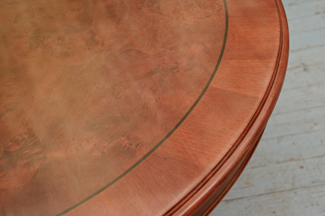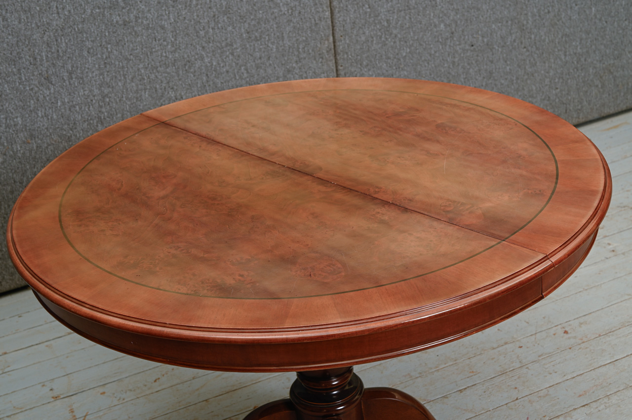 Galds uz masīvkoka kājas ar apaļu MDF virsmu ar dabīga koka finierējumu. Komplektā zem galda virsmas uzglabājama 38cm plata pagarināmā plāksne. Galda garums izvilktā veidā 147cm. Kods 303120.