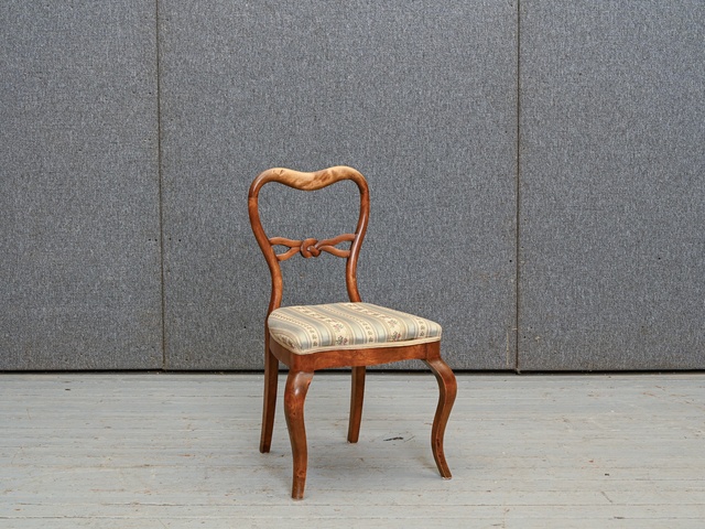 Balti krāsots krēsls koka rāmī. Sēdvirsma un atzveltne tapsēti ar raibu mēbeļu audumu. Kods 10102. Cena norādīta vienam krēslam. Pieejami 2 šādi krēsli. Pērkot 2 krēslu komplektu - atlaide. Lai saņemtu komplekta atlaidi, lūdzu, mūsu mājaslapā izvēlēties preci ar kodu 101012k.