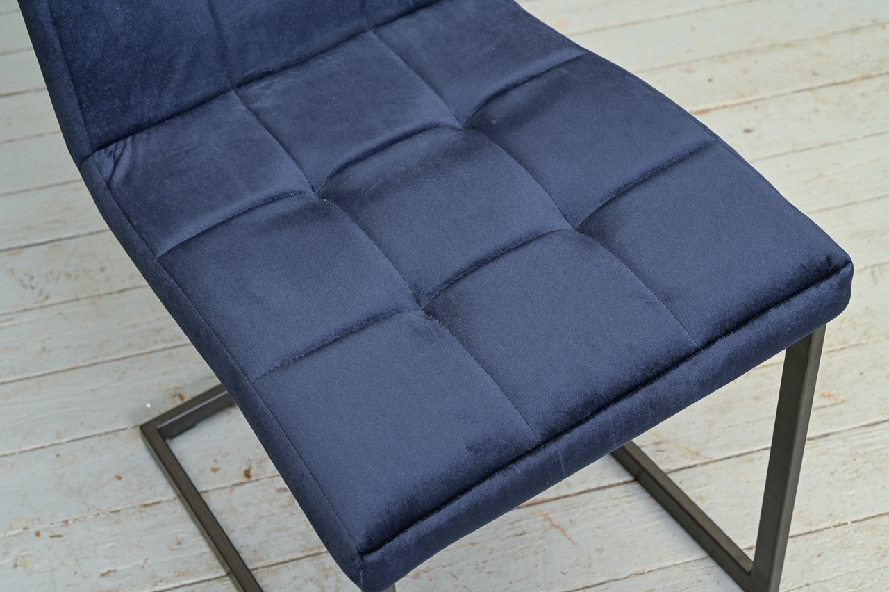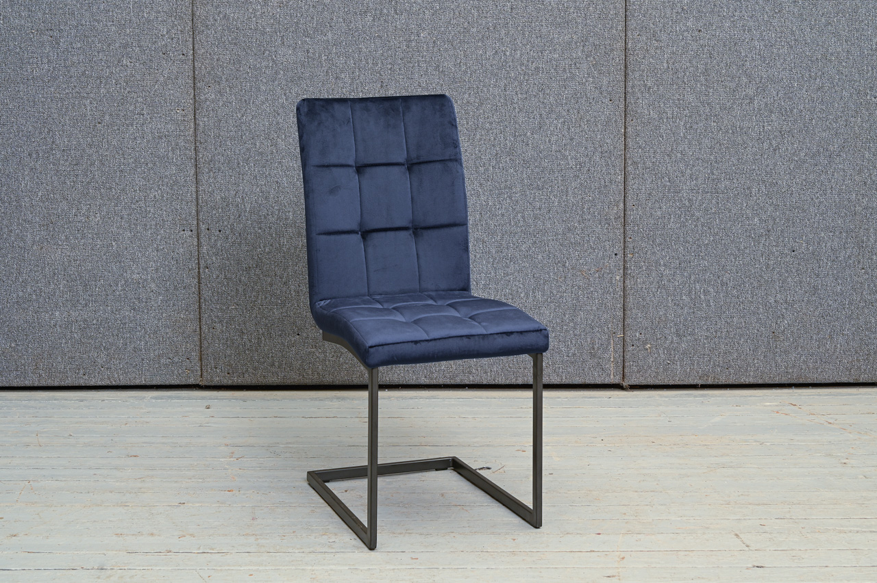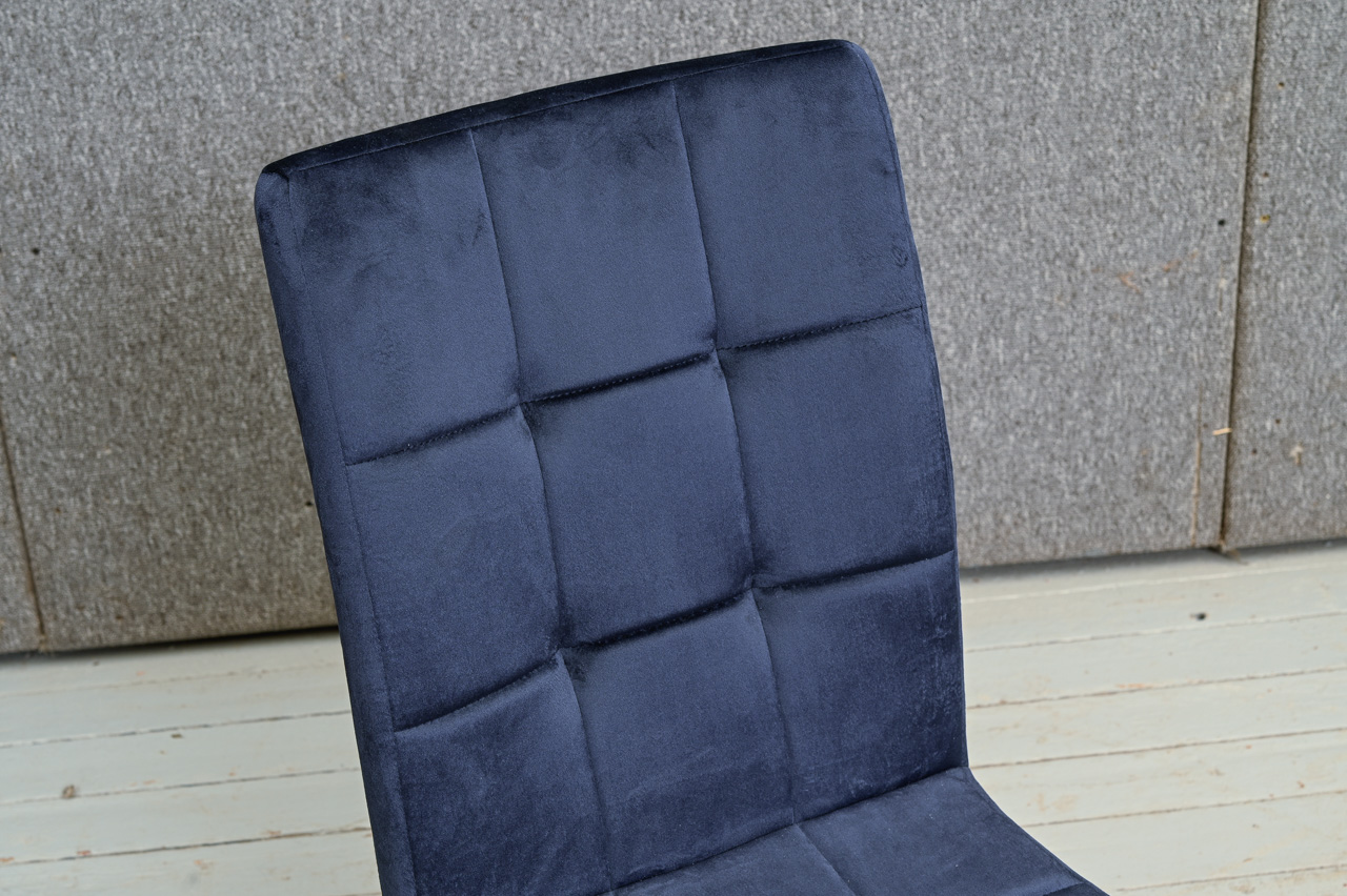 Krēsls uz melnas, matētas kājas, tapsēts ar tumši zilu, samtainu mēbeļu audumu. Nelietots, salikts. Kods 108310.
