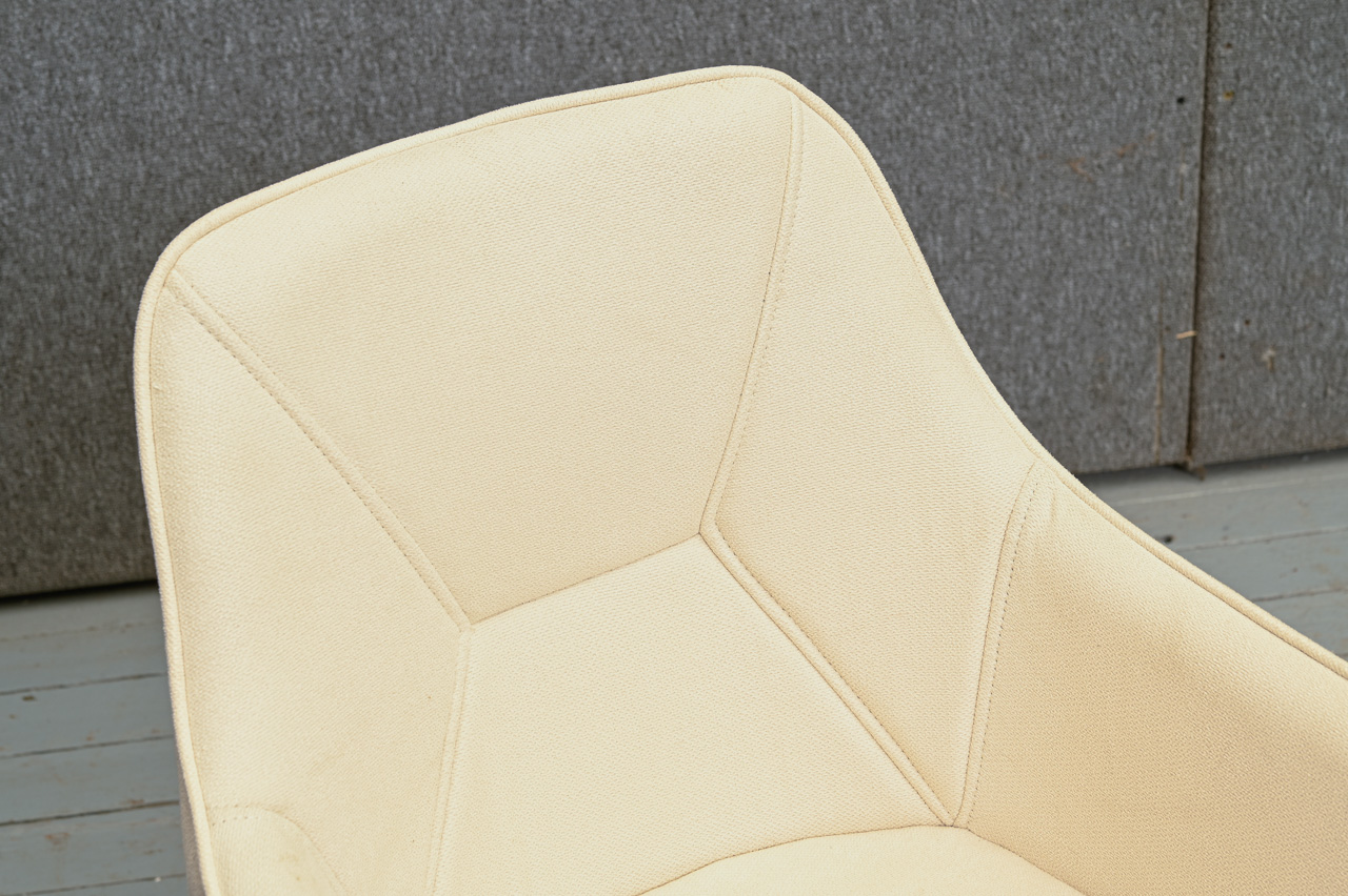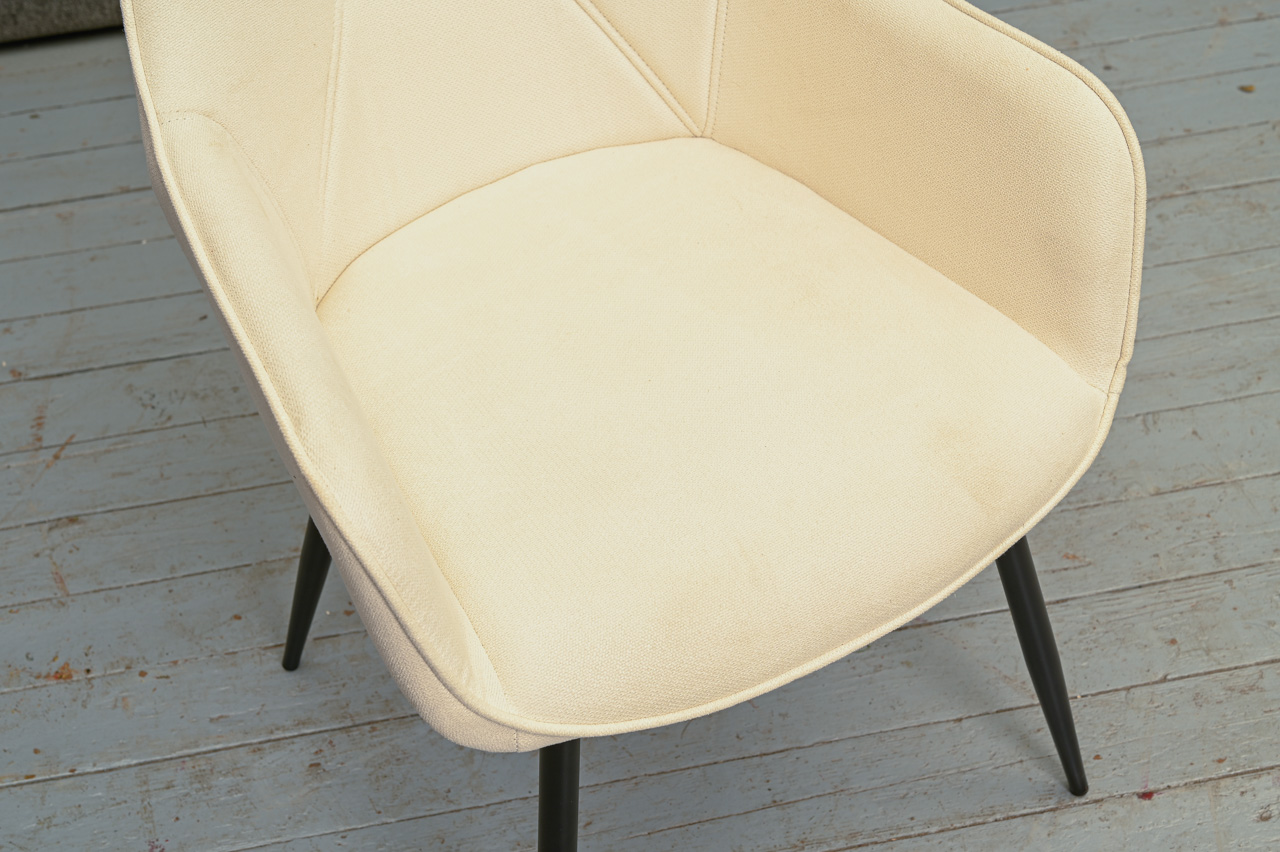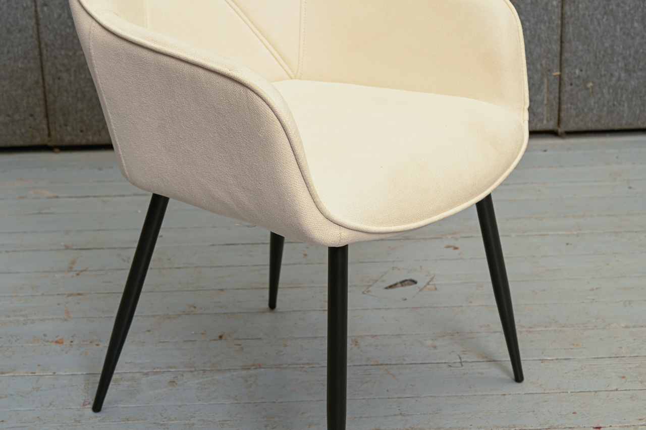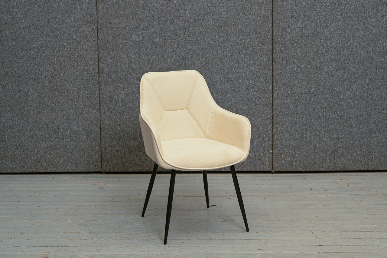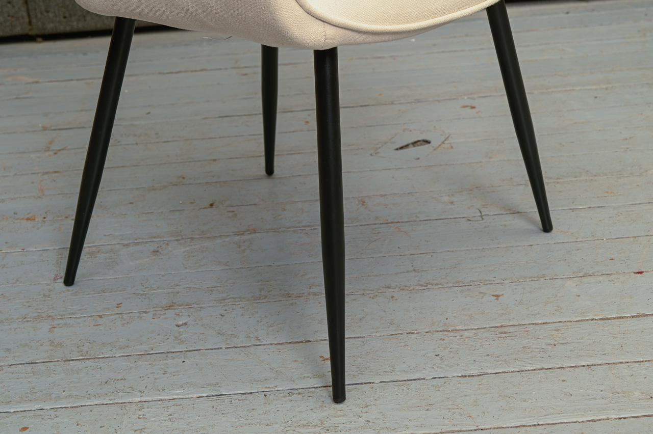 Krēsls ar paroceņiem uz melnām metāla kājām, tapsēts ar bēšu mēbeļu audumu. Nelietots, salikts. Kods 108311. Pieejams šāds pats krēsls ar pelēka mēbeļu auduma tapsējumu, kods 108330.