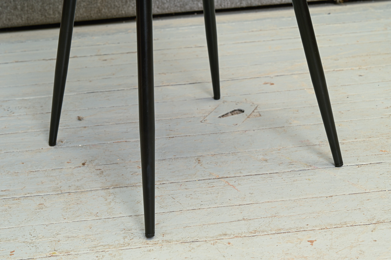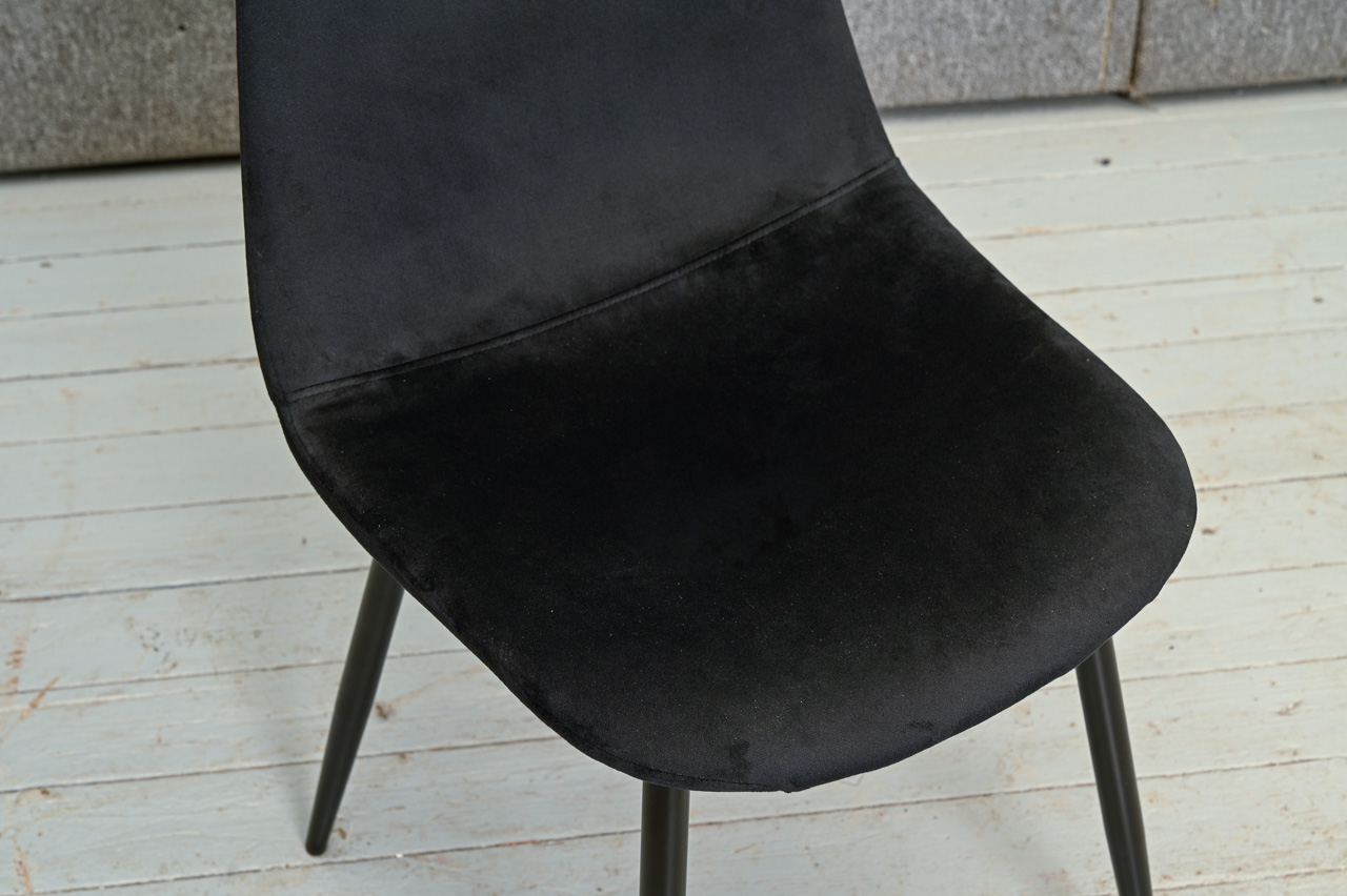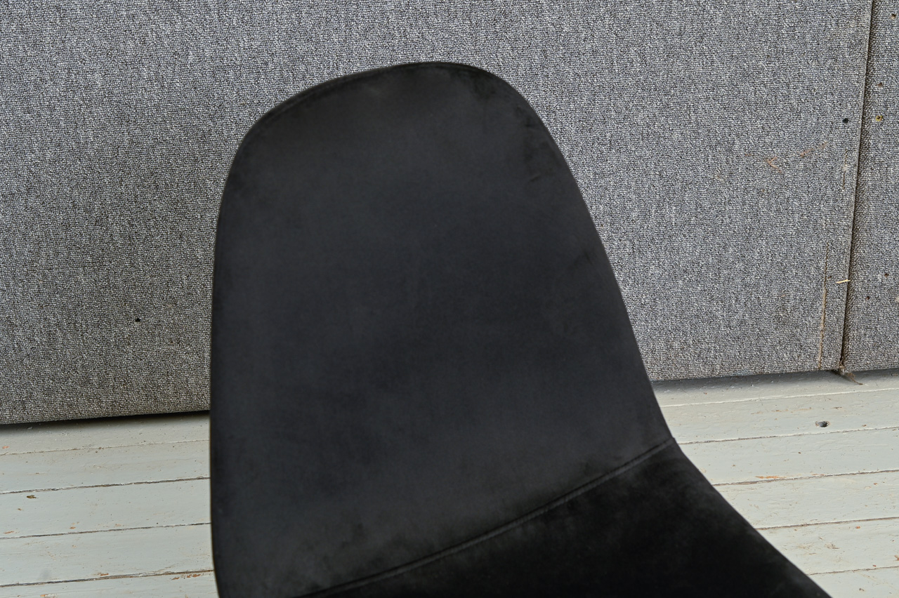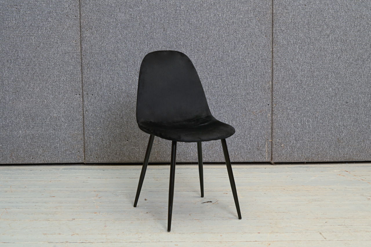 Krēsls uz melnām metāla kājām, tapsēts ar melnu, samtainu mēbeļu audumu. Nelietots, salikts. Kods 108313.