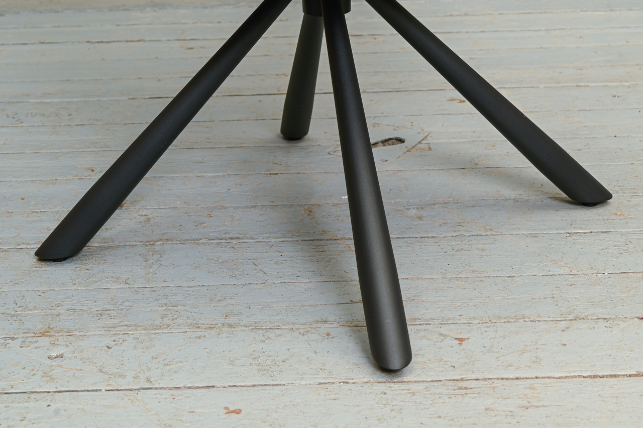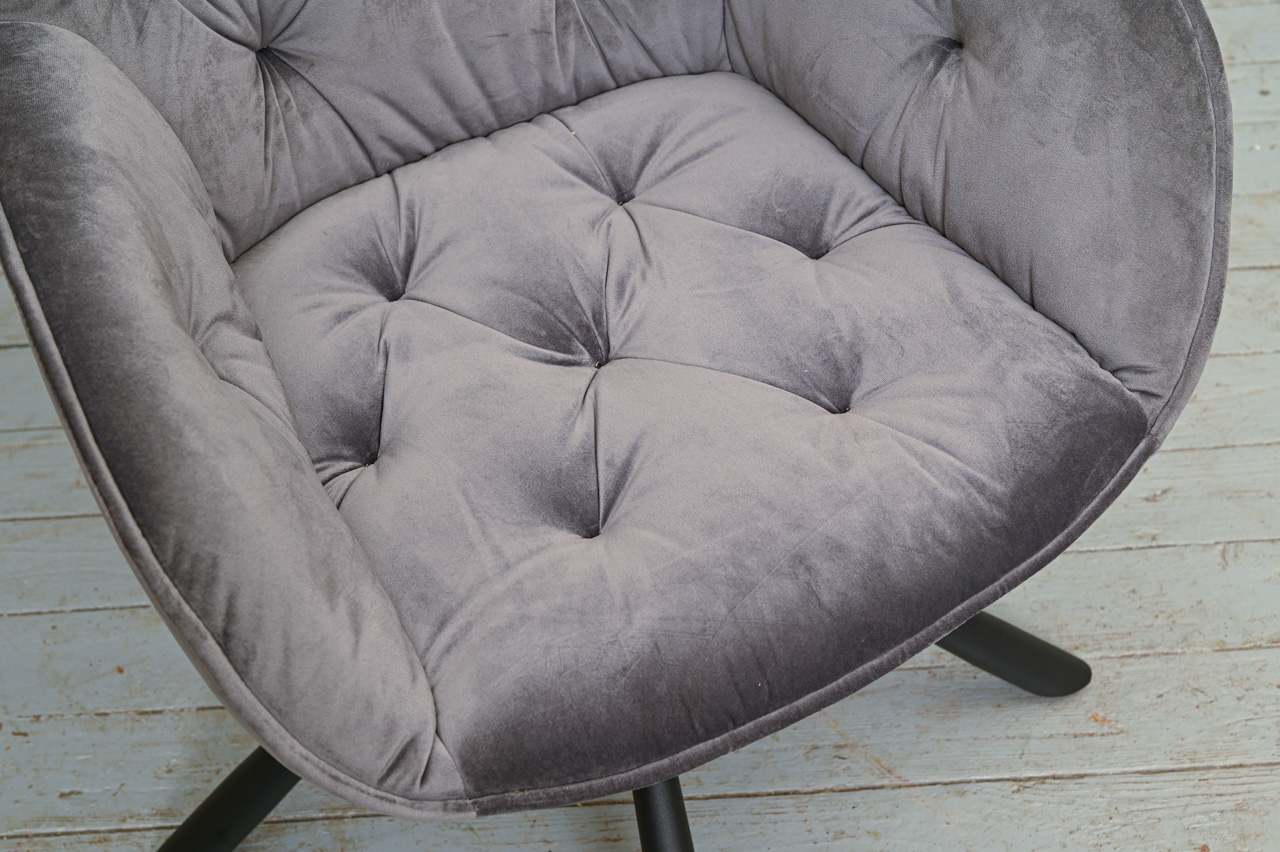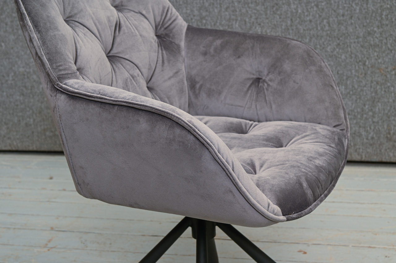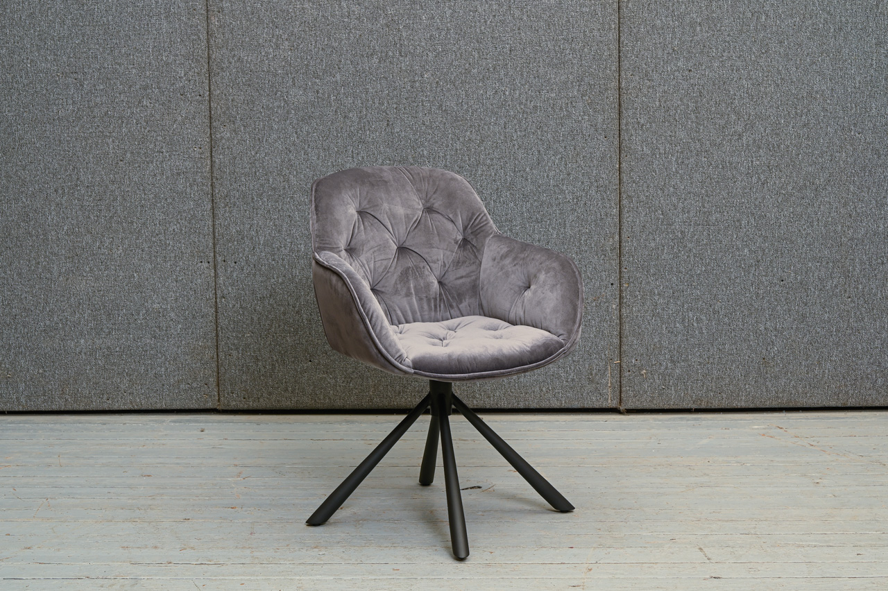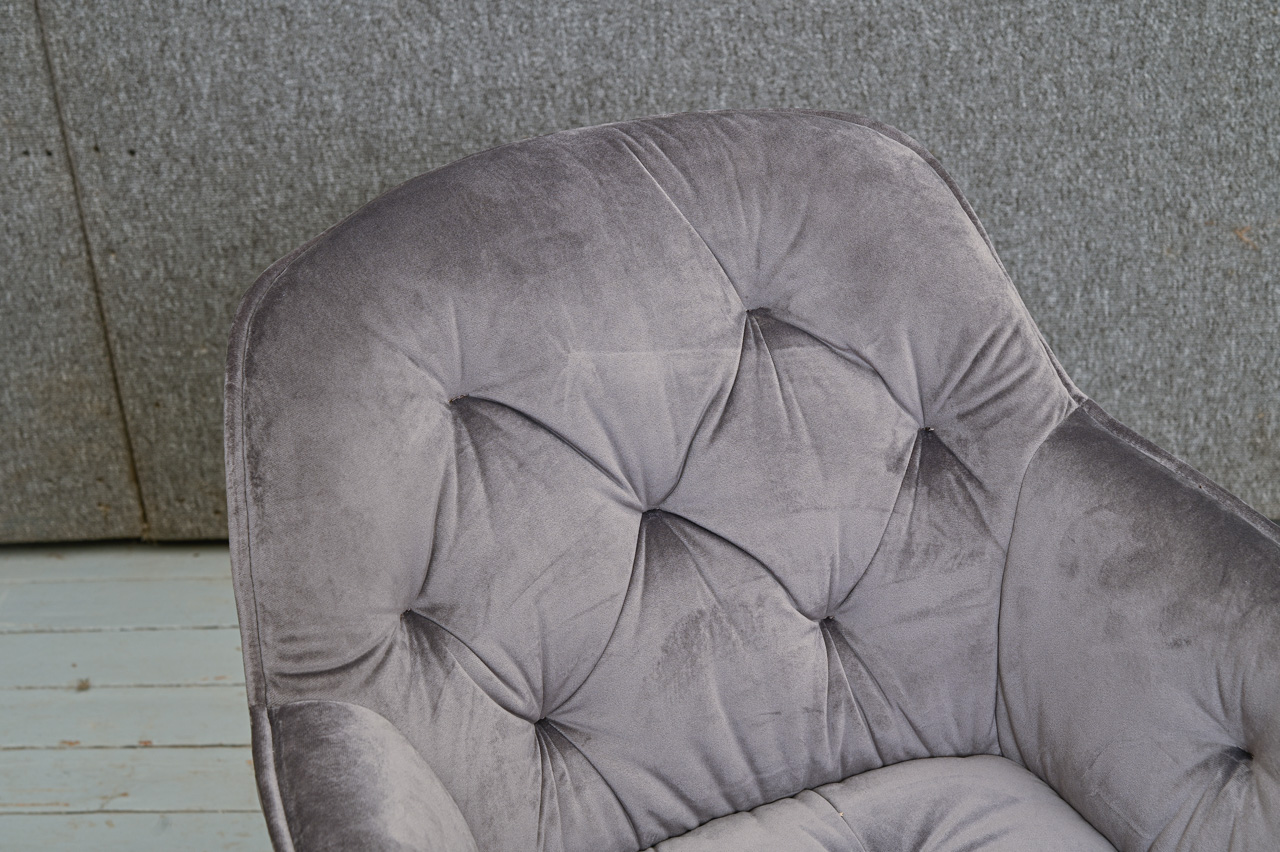 Krēsls ar paroceņiem, tapsēts ar stepētu, samtainu, pelēku mēbeļu audumu. Sēdvirsma pagriežama 360 grādos ap kāju. Nelietots, salikts. Kods 108326. Pieejams šāds pats krēsls ar oranža auduma tapsējumu, kods 108375.