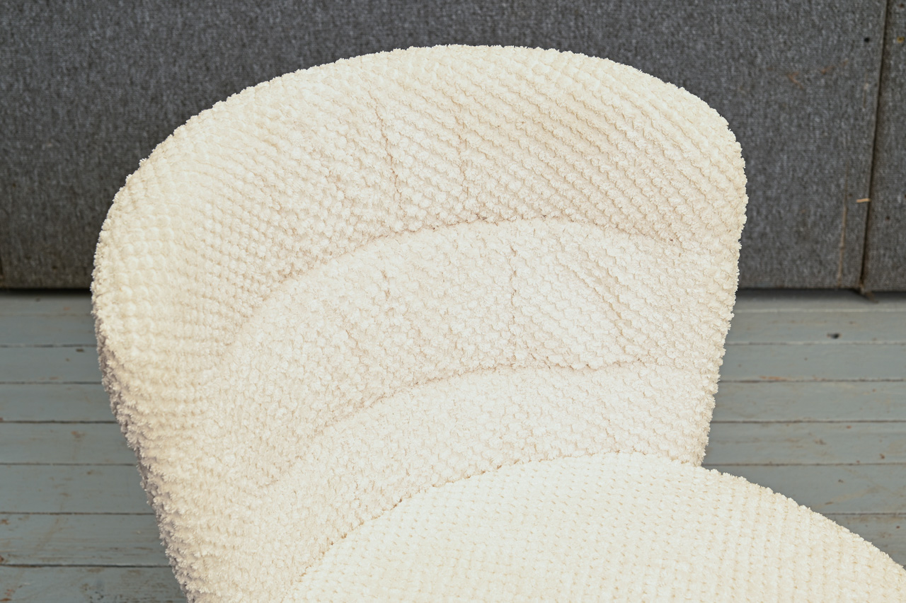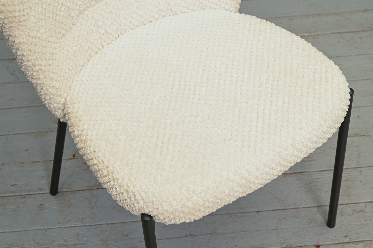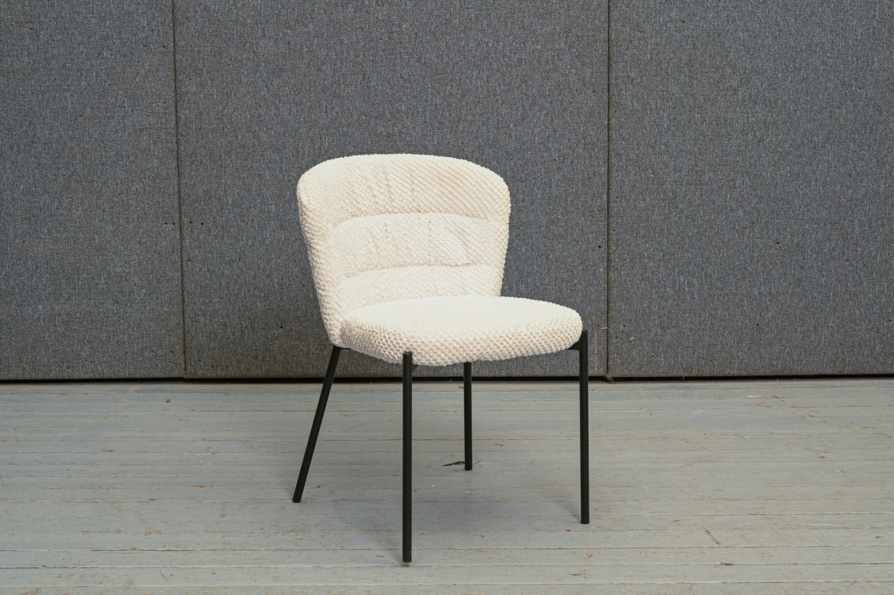 Krēsls uz melnām metāla kājām, tapsēts ar gaiši bēšu, gandrīz baltu mēbeļu audumu. Nelietots, salikts. Kods 108334.