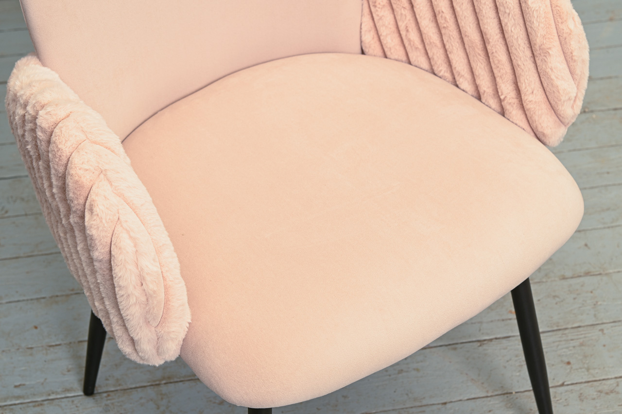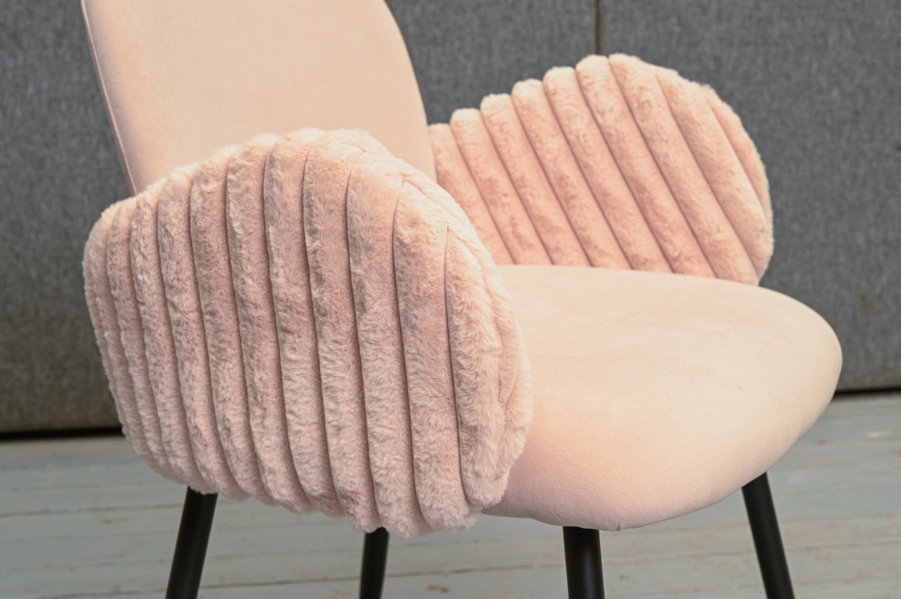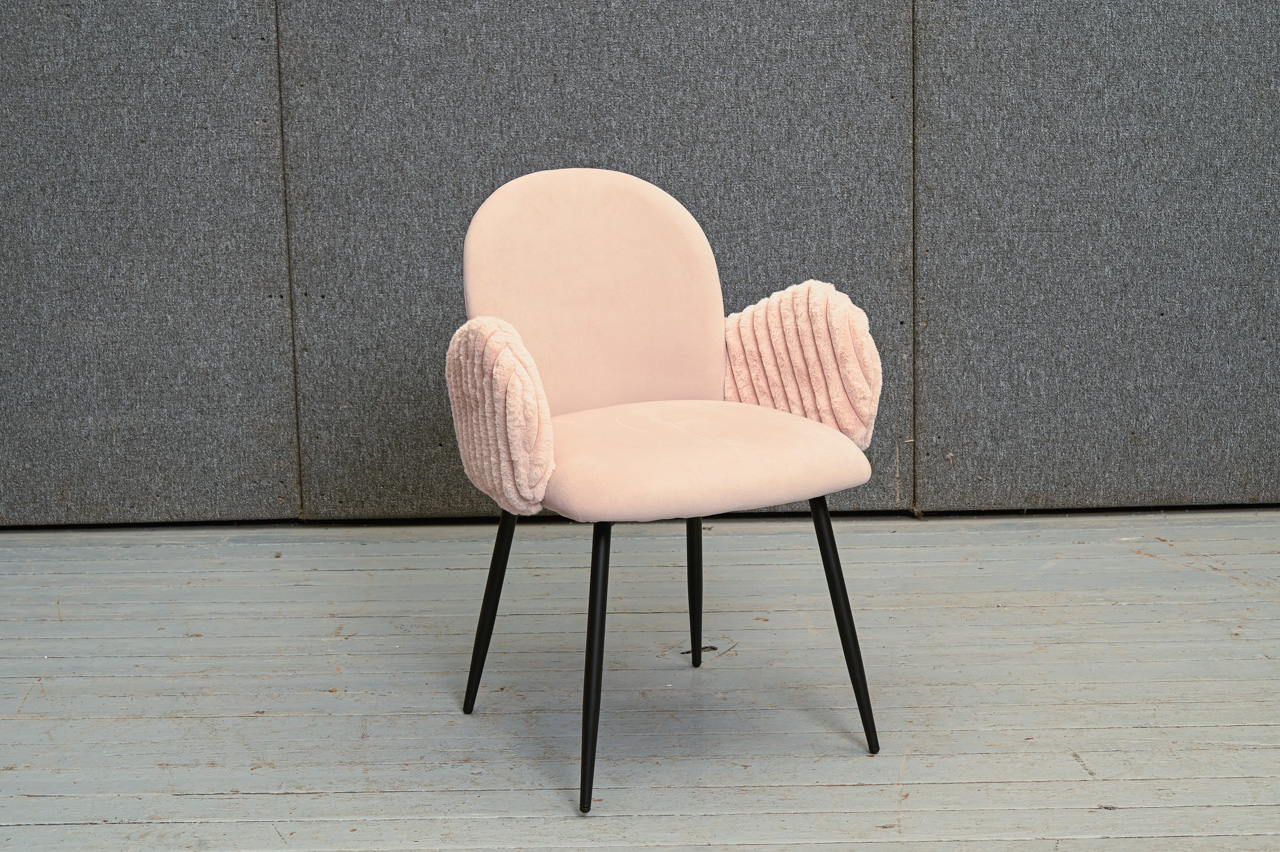 Krēsls ar paroceņie, tapsēts ar rozā, samtainu mēbeļu audumu. Paroceņi ar pūkaina auduma tapsējumu. Nelietots, salikts. Kods 108342.