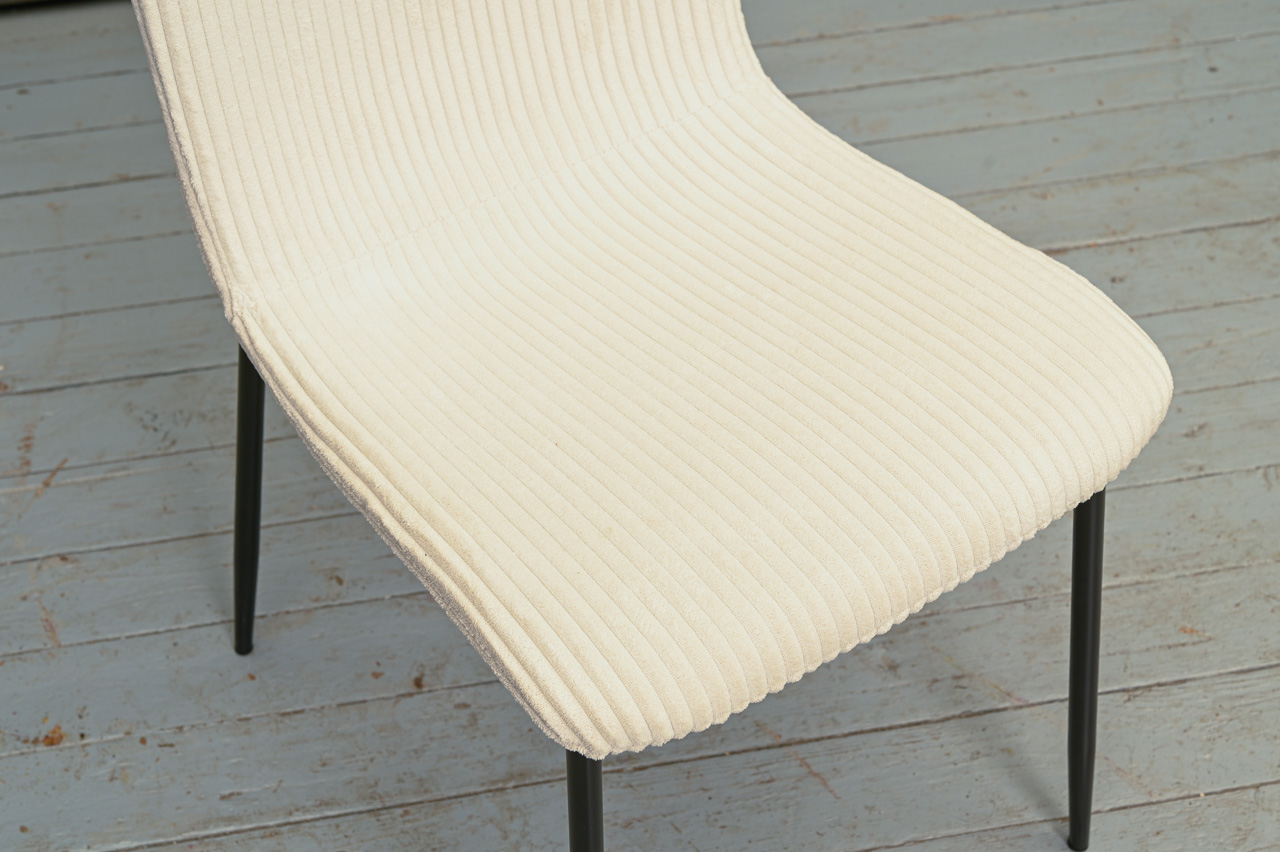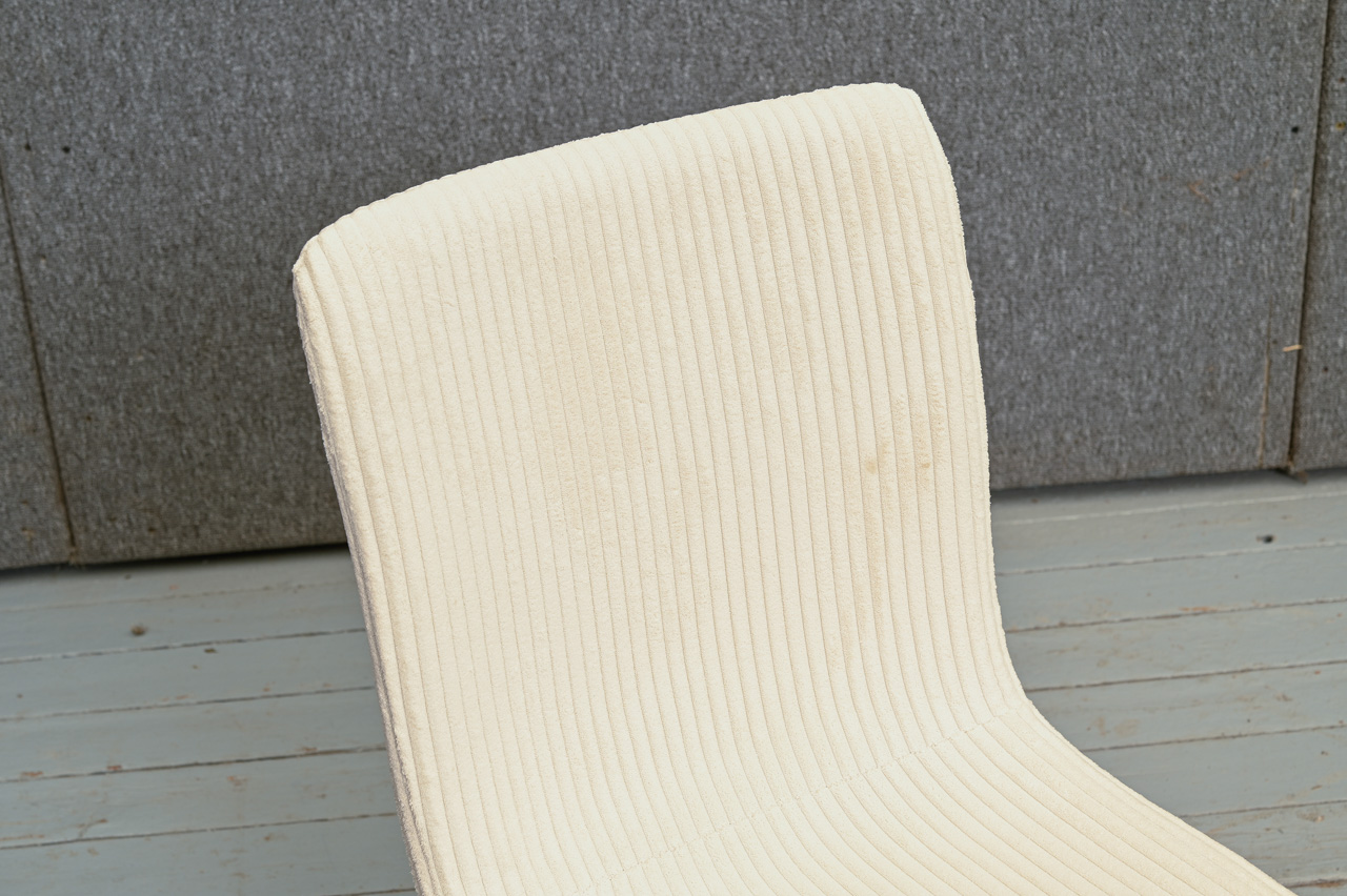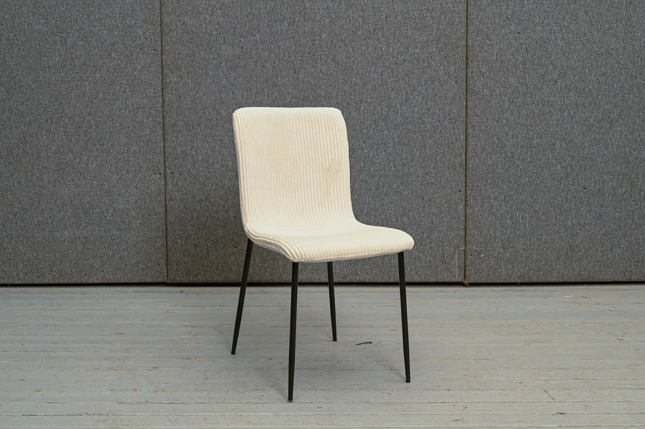 Krēsls uz melnām metāla kājiņām, tapsēts ar gaišu, bēšu, gandrīz baltu velveta tipa audumu. Nelietots, salikts. Kods 108345.