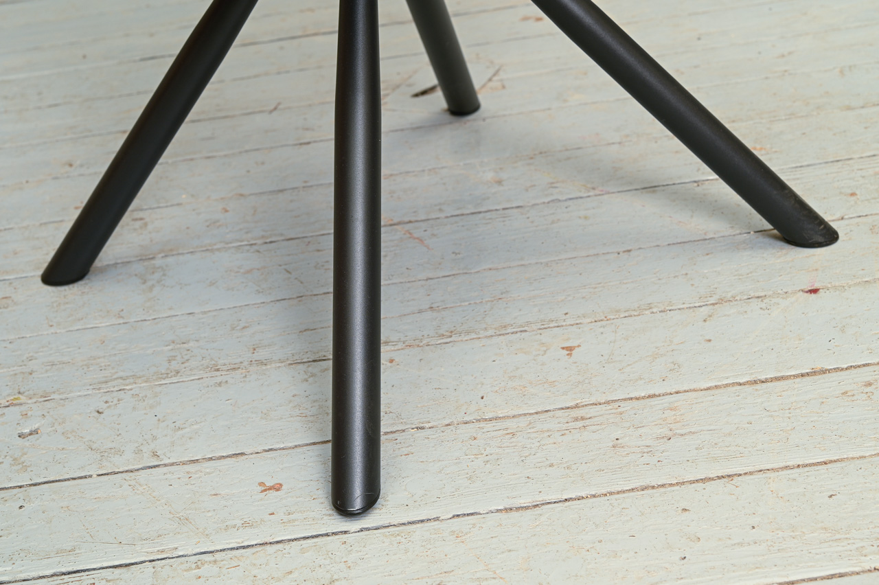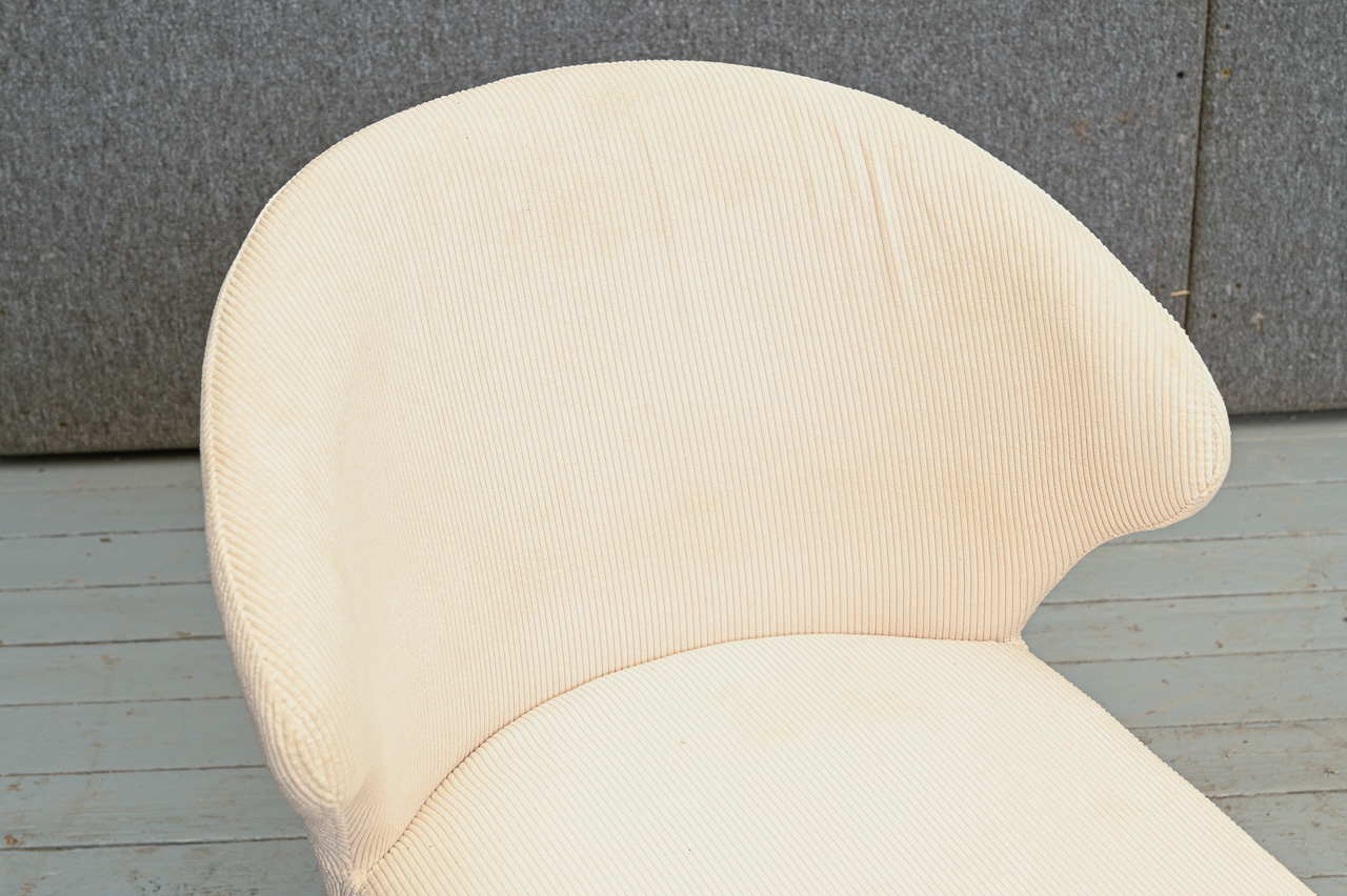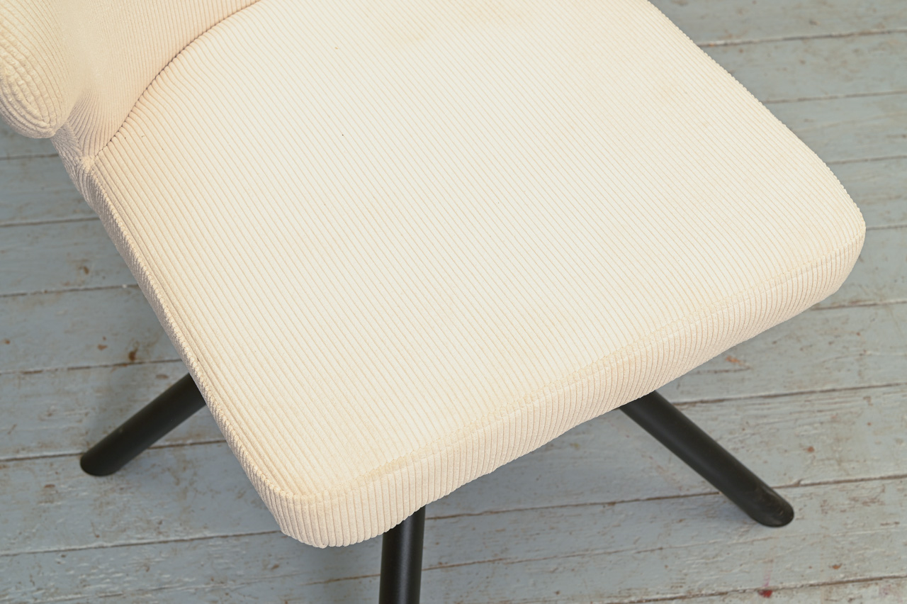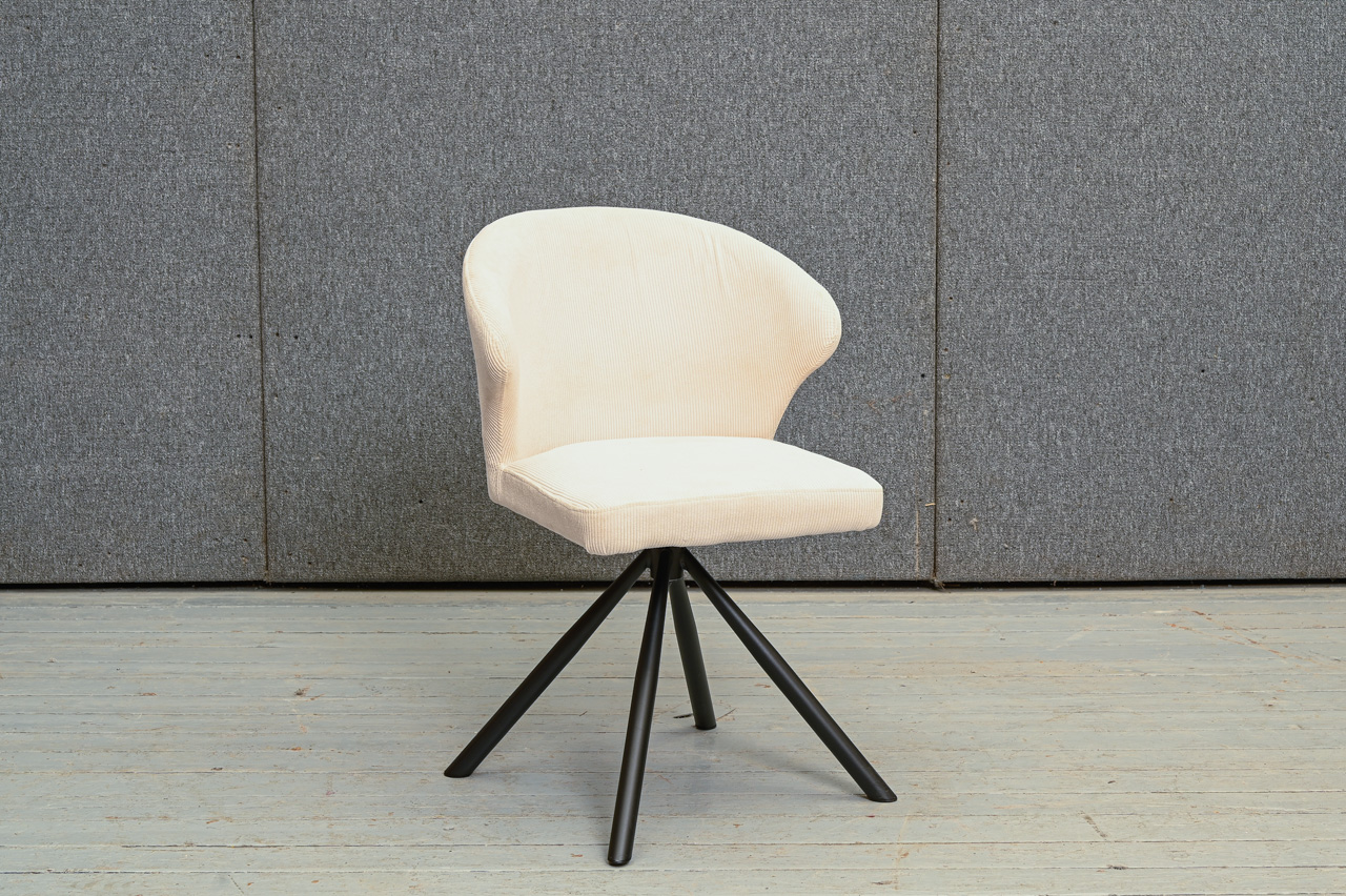 Krēsls uz pulverkrāsotām metāla kājām, tapsēts ar bēšu mēbeļu audumu. Krēsla sēdvirsma pagriežama 360° ap kāju. Nelietots, salikts. Kods 108348.