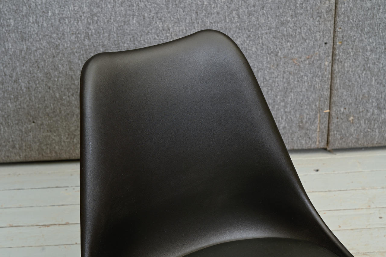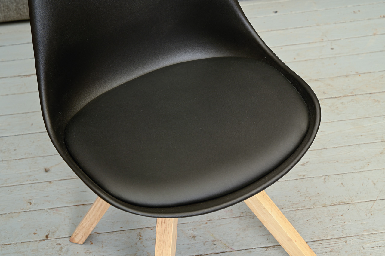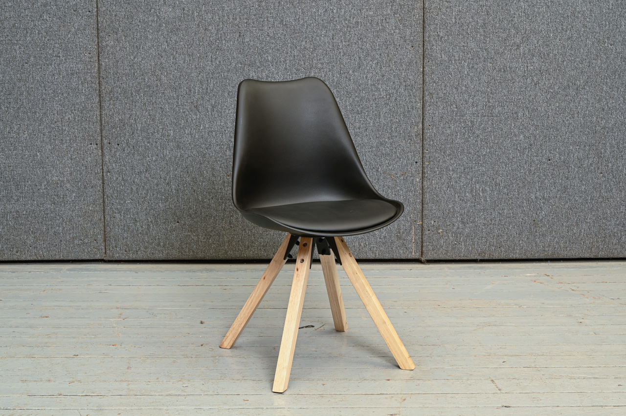 Melns plastmasa krēsls uz gumijkoka kājiņām. Melna ādas imitācijas sēdvirsma. Nelietots, salikts. Kods 108351. Pieejams šāds pats, melnas krāsas krēsls, kods 108332.