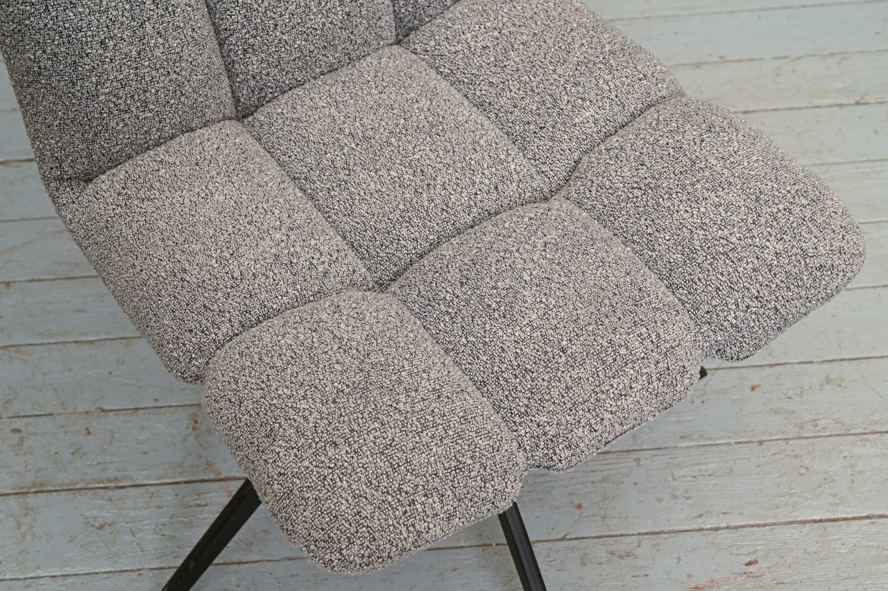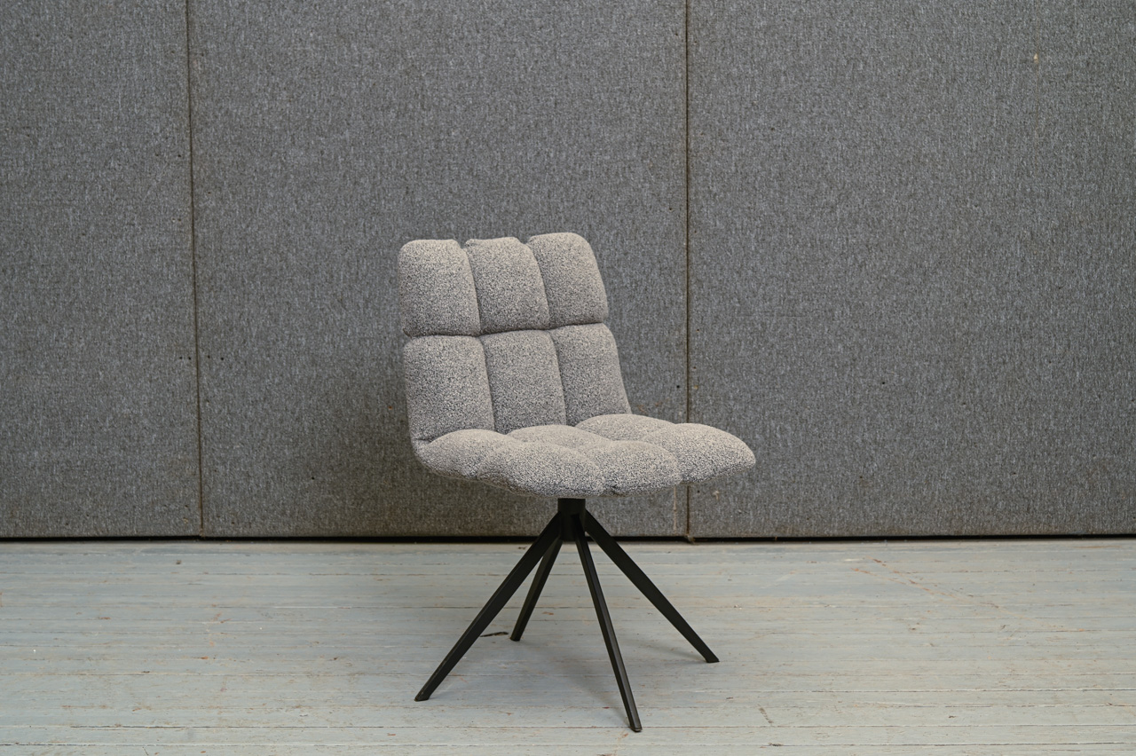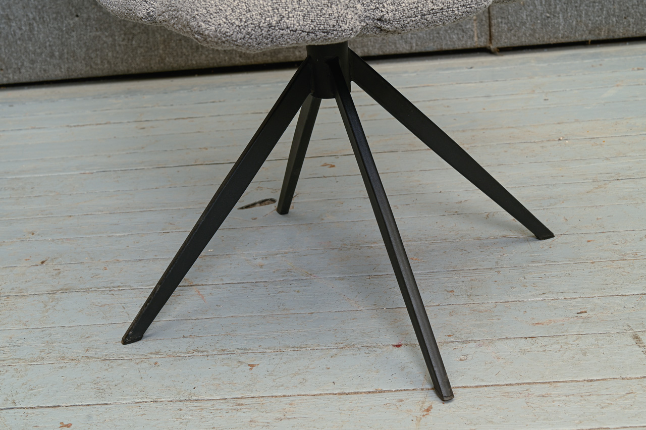 Krēsls uz melnas metāla kājas, tapsēts ar pelēku buklē mēbeļu audumu. Krēsla sēdvirsma pagriežama 360° ap kāju. Nelietots, salikts. Kods 108352.