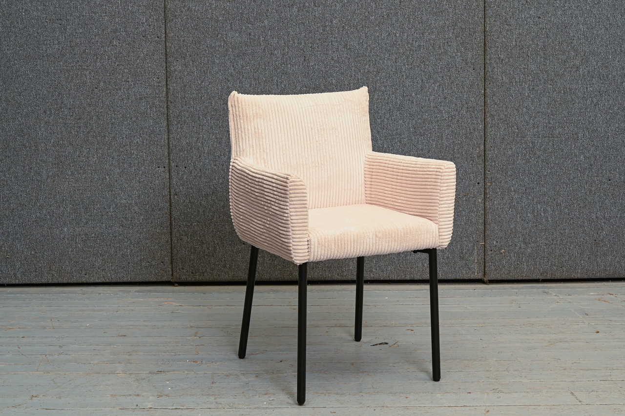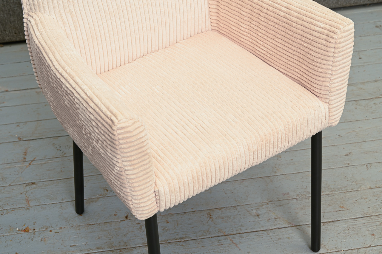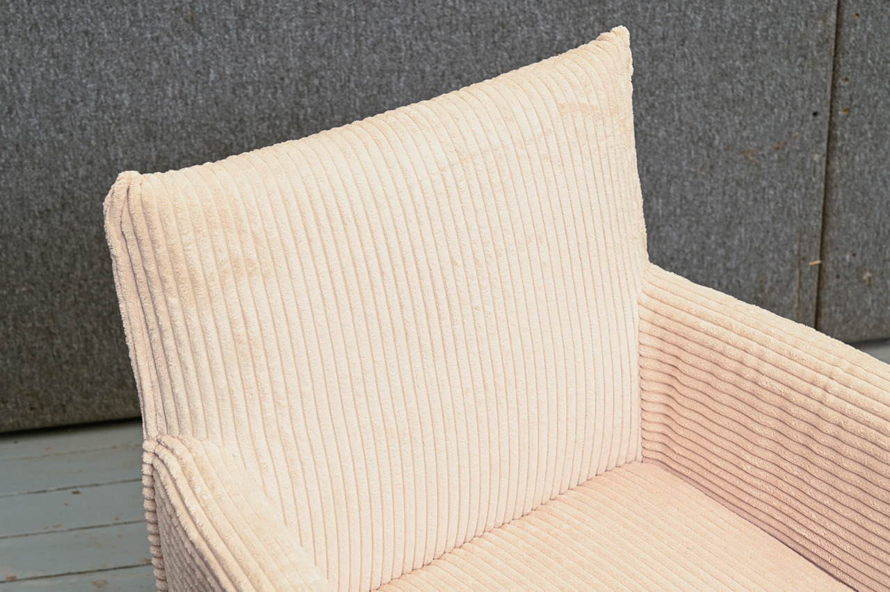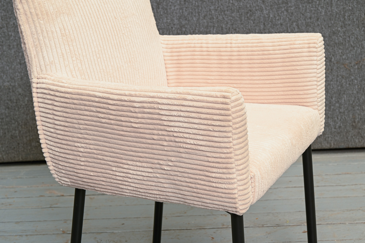 Krēsls ar paroceņiem, tapsēts ar gaišu krēmkrāsas velveta tipa audumu. Nelietots, salikts. Kods 108353.